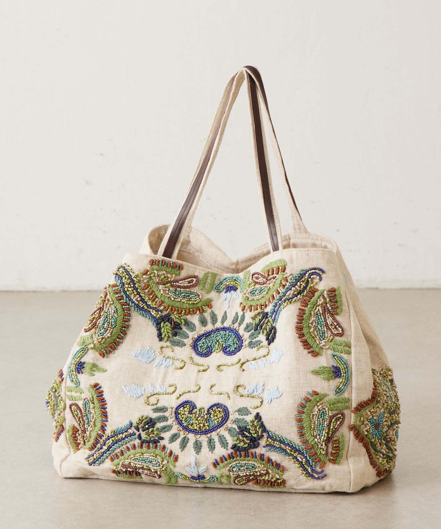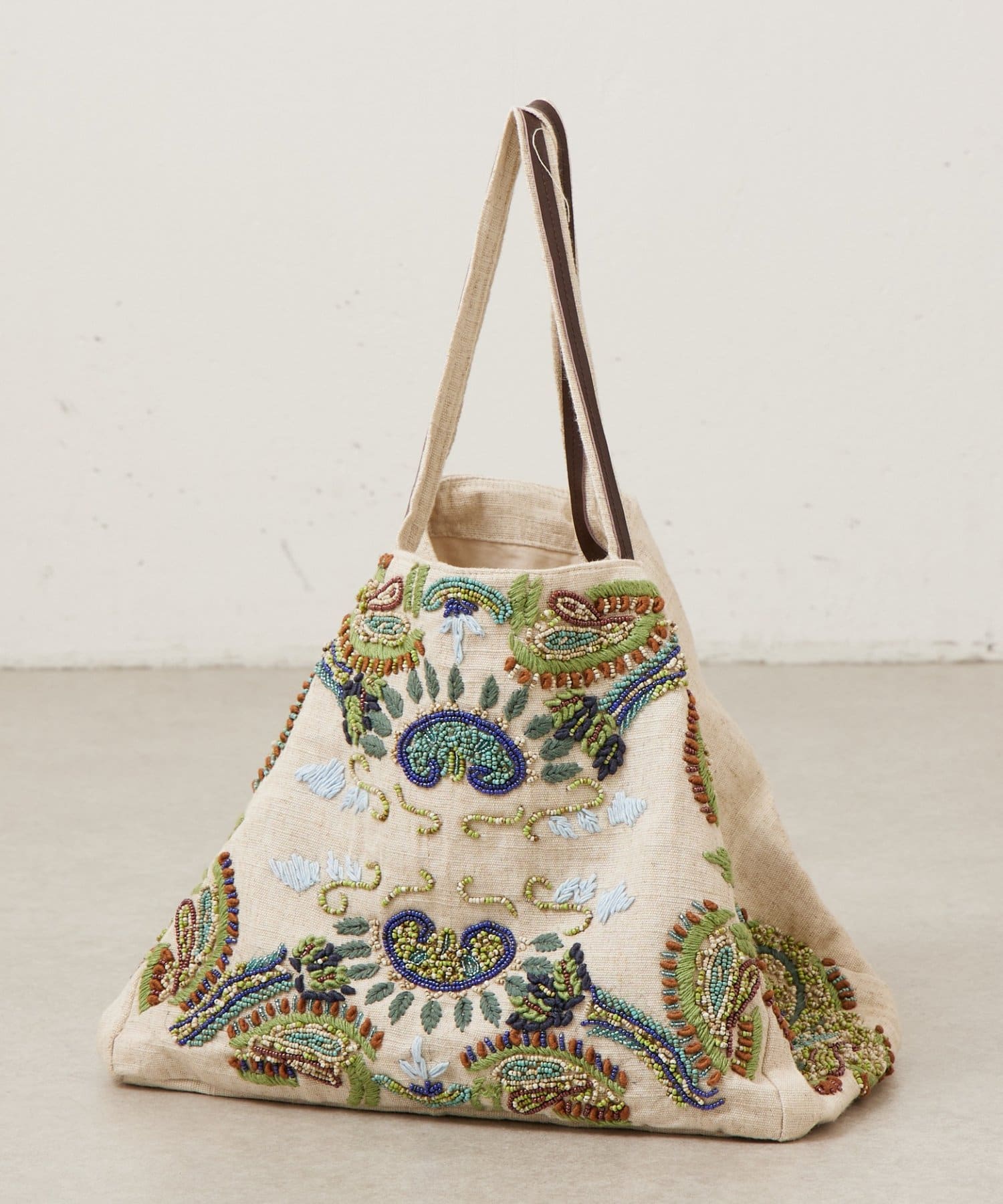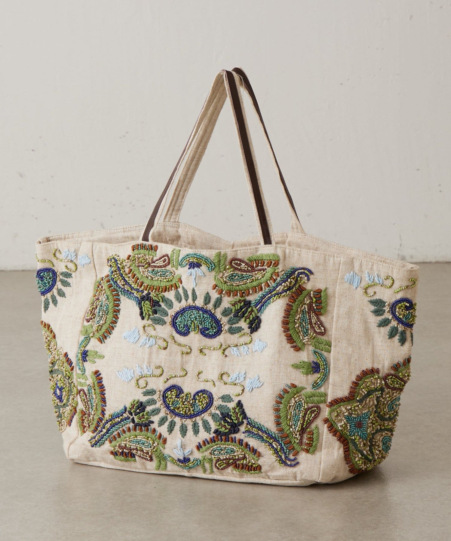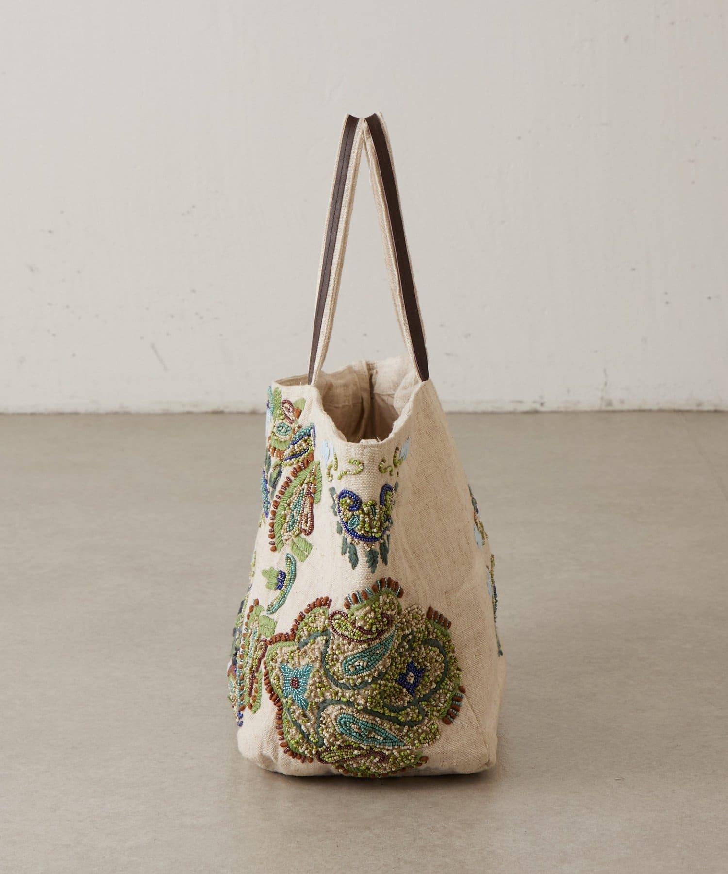 ボタニカルテイストのビーズ刺繍をあしらった「IMAYIN」の刺繍トートバッグ。