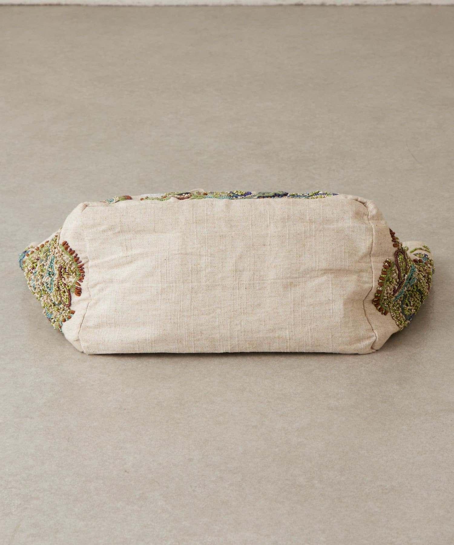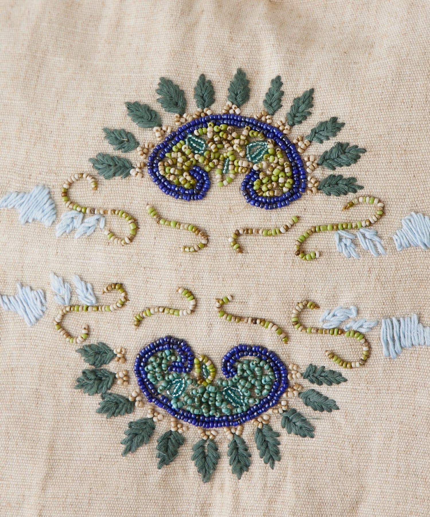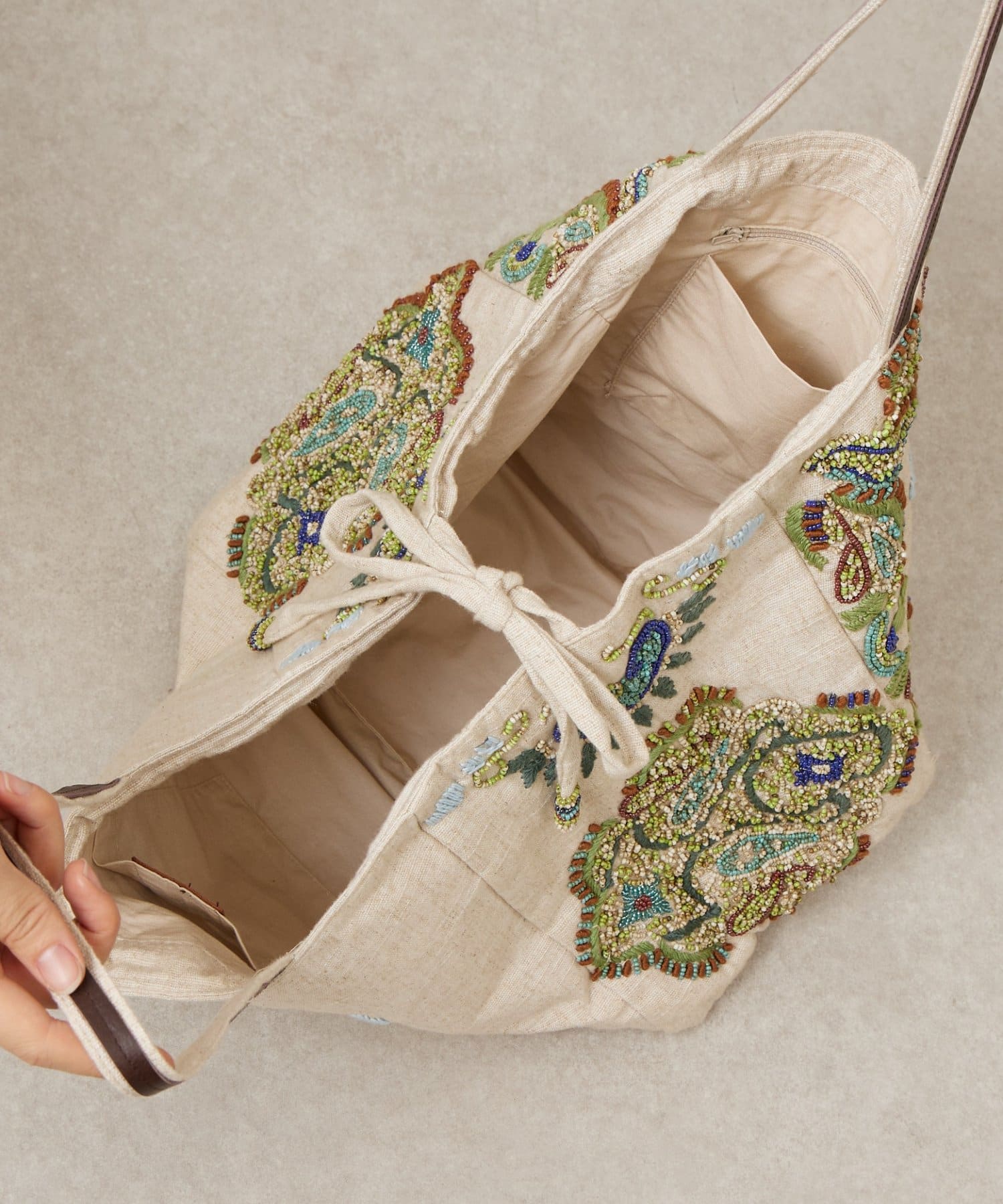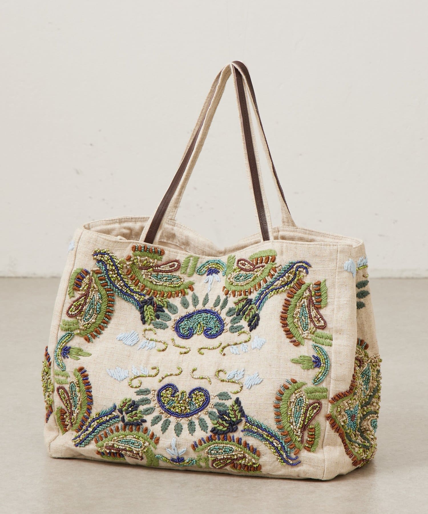 ボタニカルテイストのビーズ刺繍をあしらった「IMAYIN」の刺繍トートバッグ。