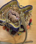 複雑に組み合わされるカラーパレット、レザーやビーズなどの様々な素材が織りなす存在感は独創的でまるで絵画のように表情豊かです。