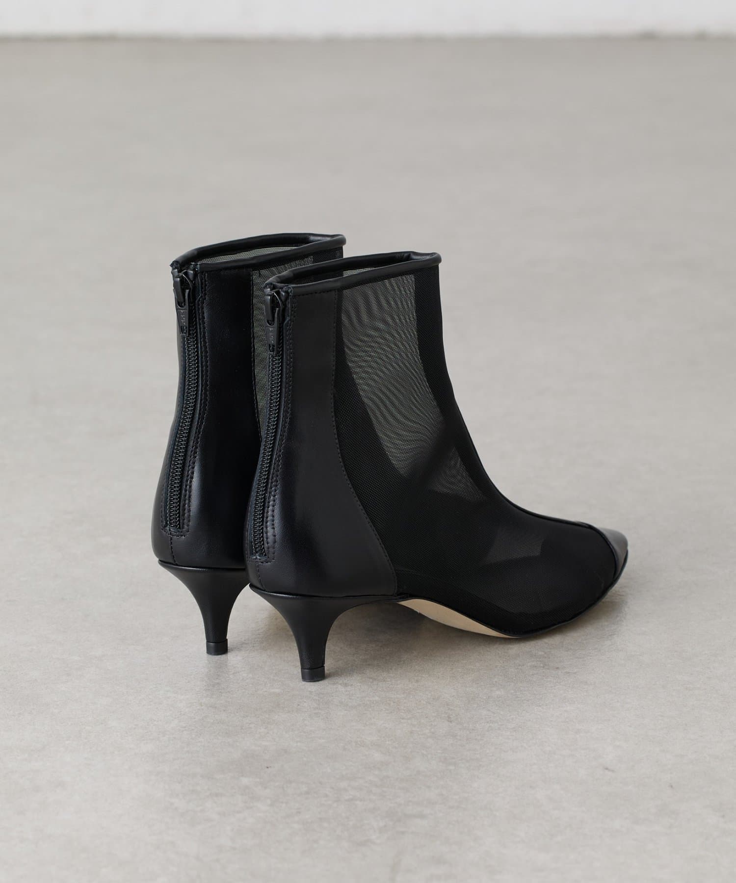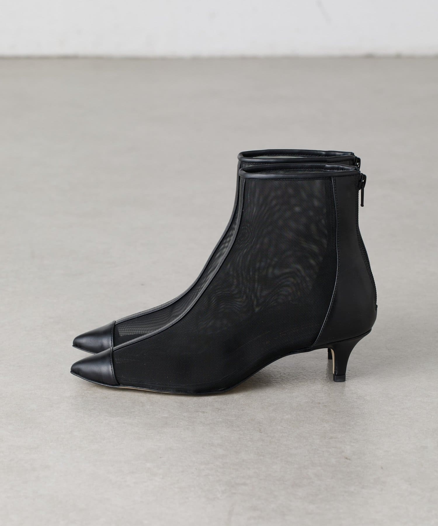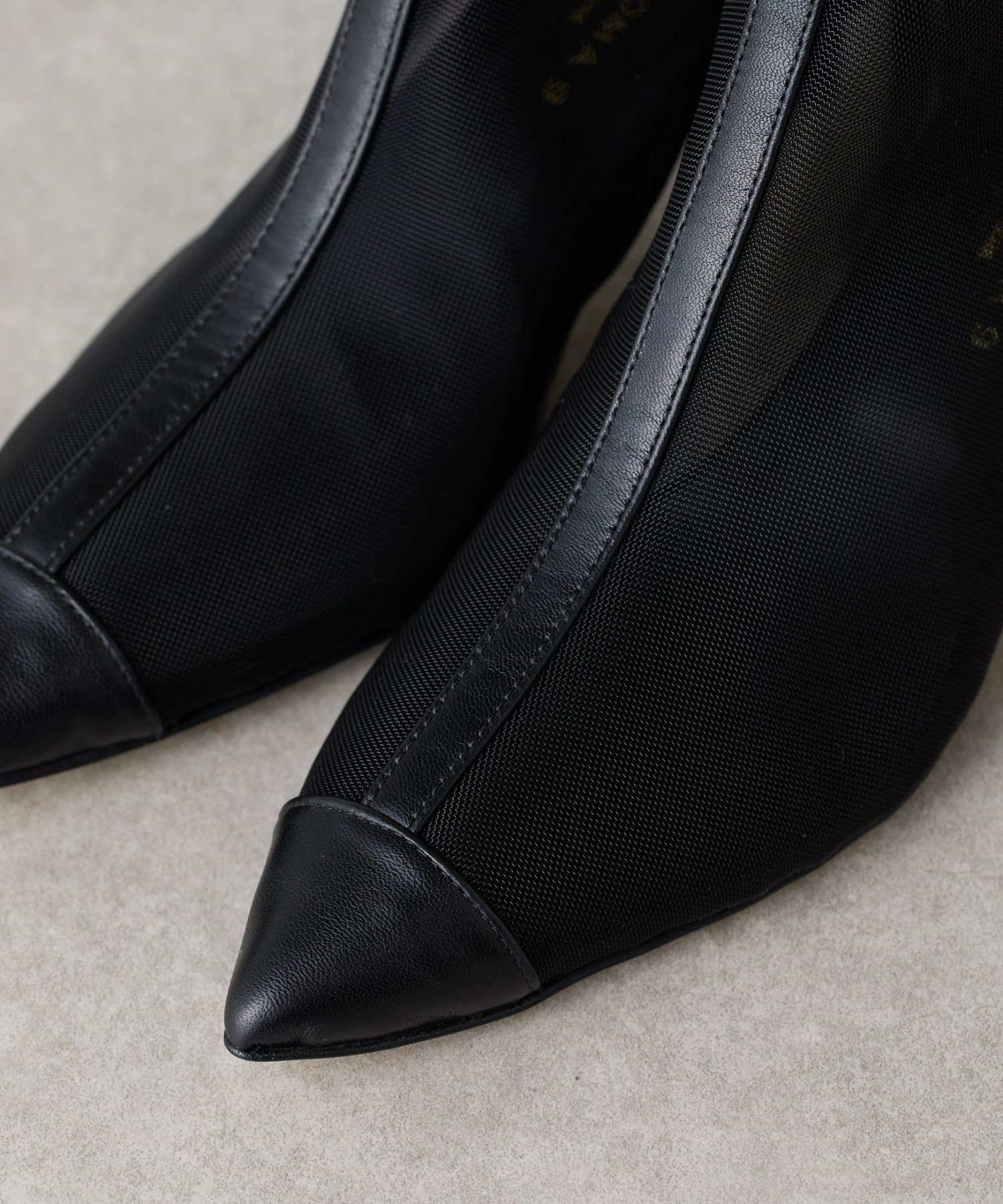 しなやかなレザーとハリのあるシアー素材を組み合わせたモダンなデザインのブーツ。