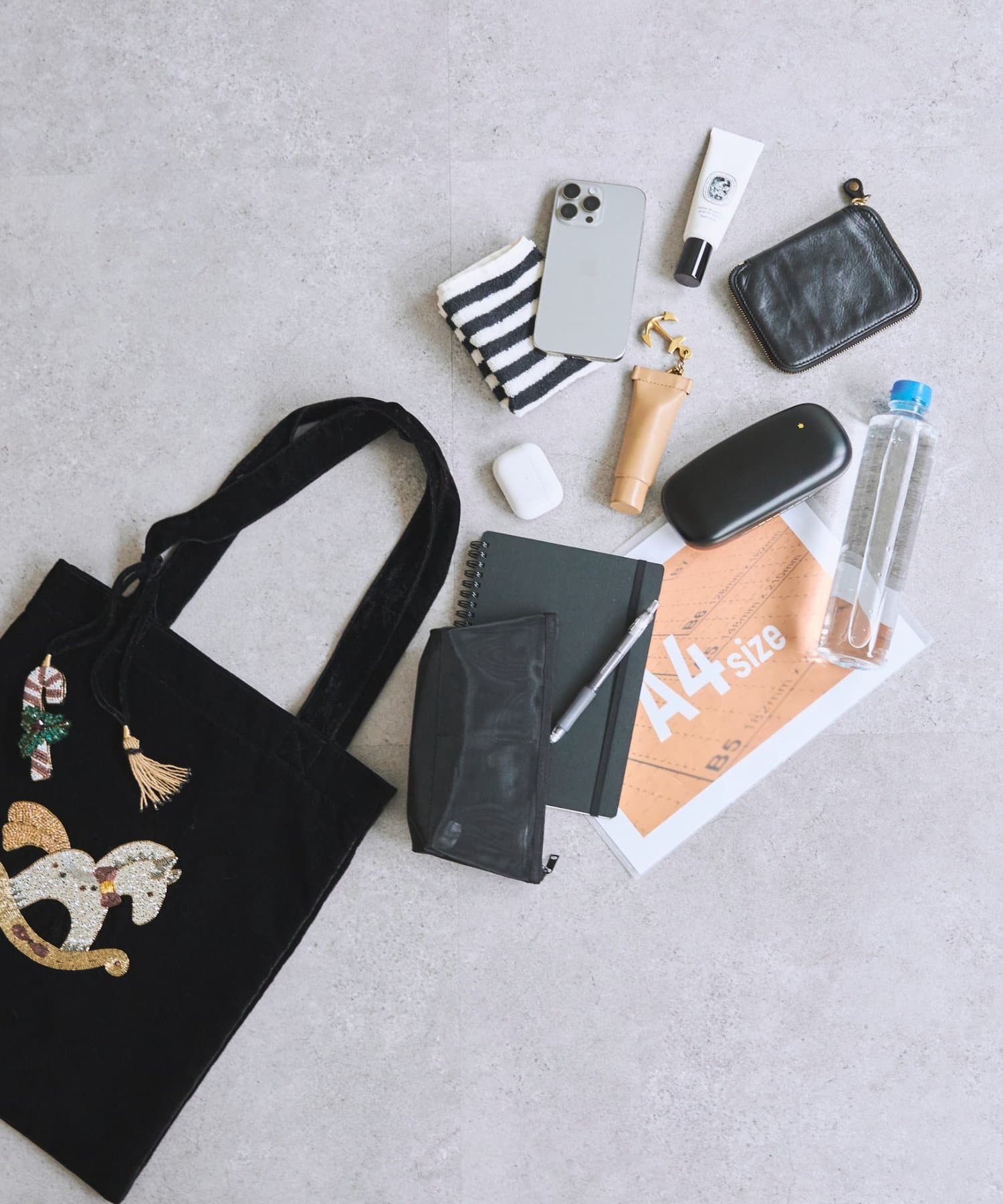 マチ無しのシンプルなスクエアトートでA4サイズが入るので使い勝手のよいアイテム。