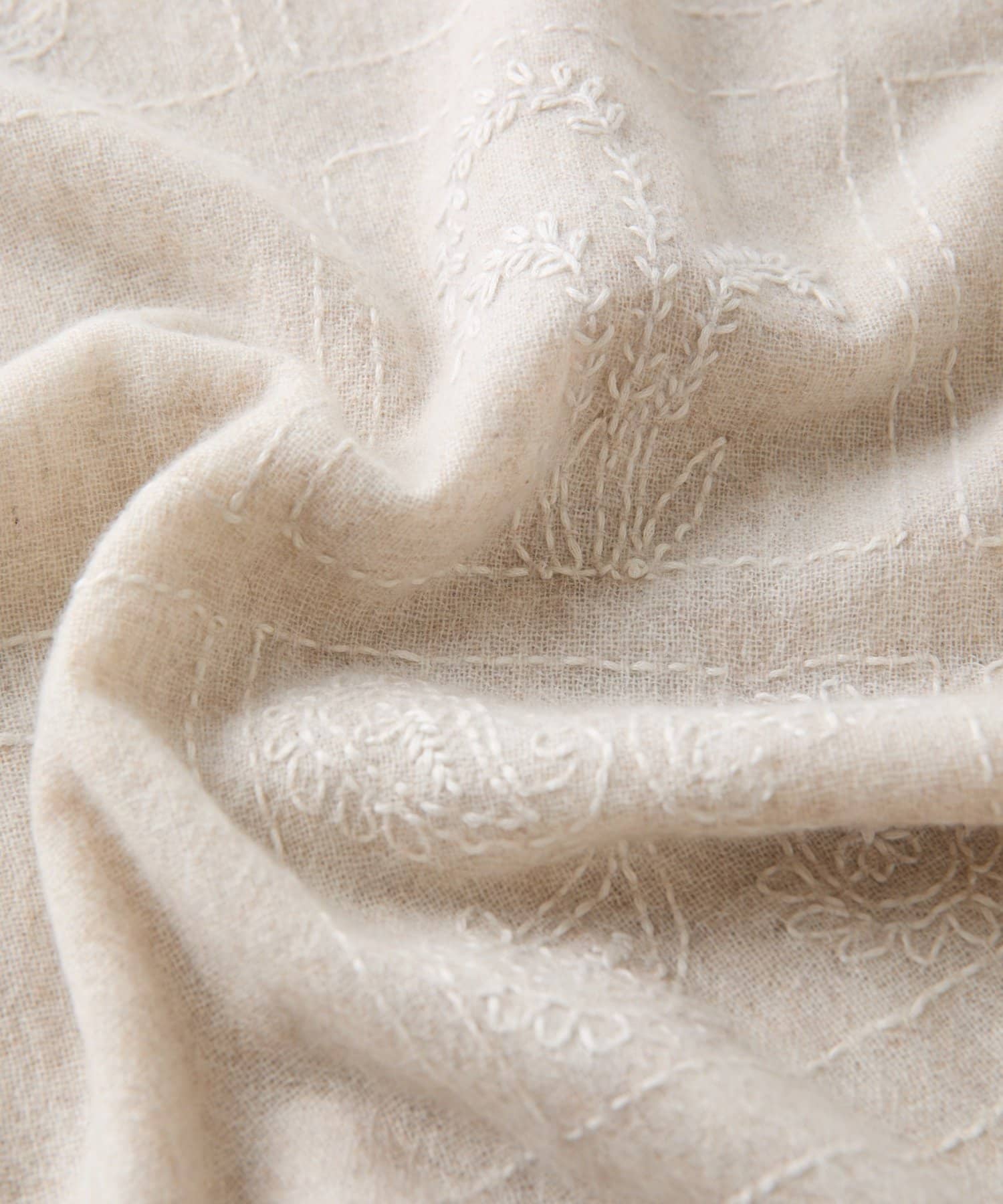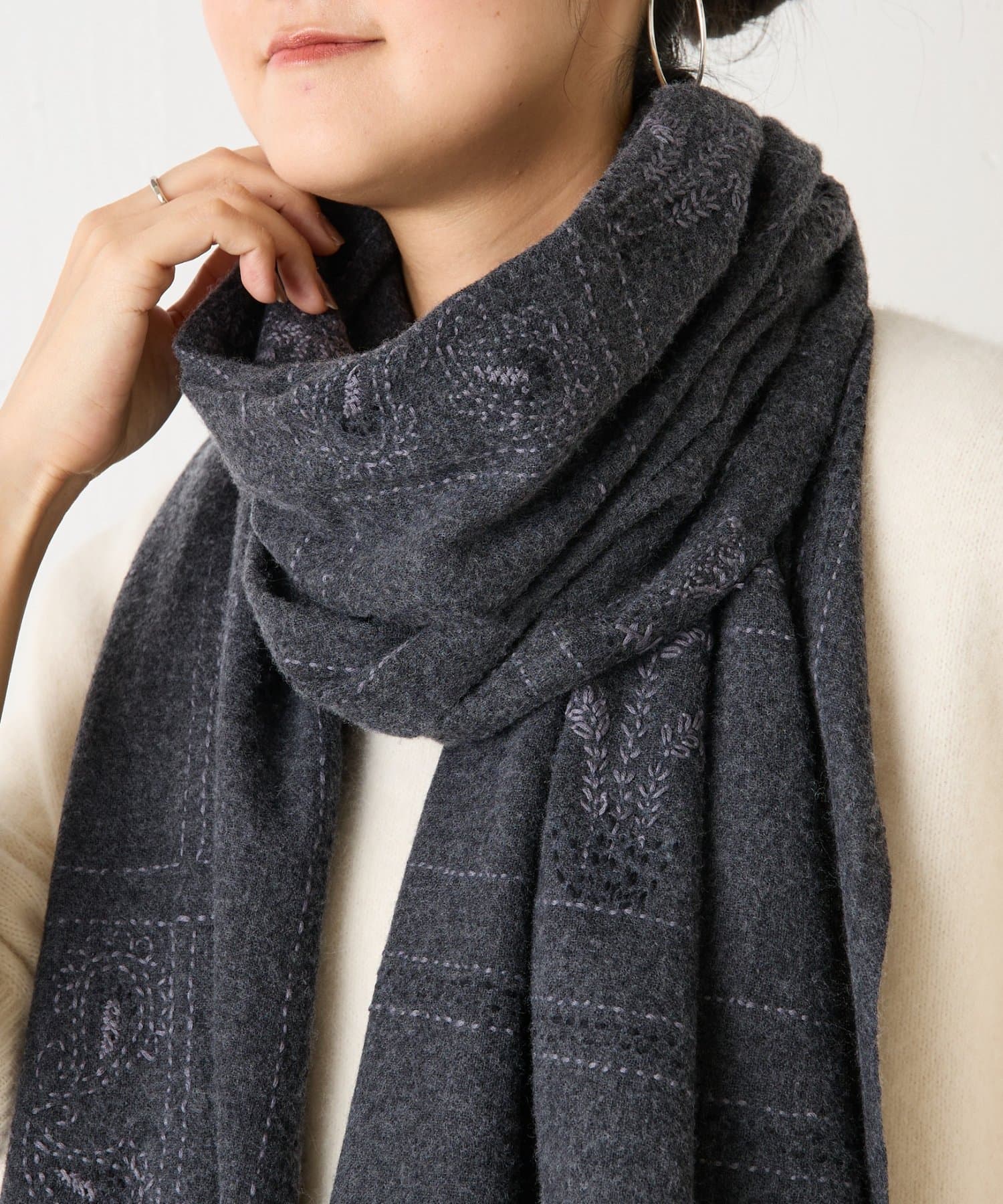 スクエア型の刺繍をランダムに配置し、巻き方によって柄の出方が異なります。