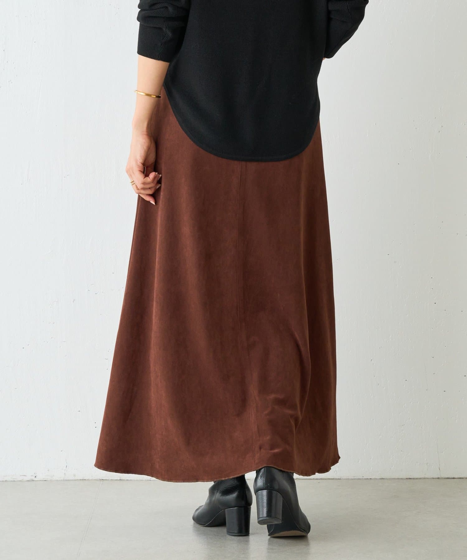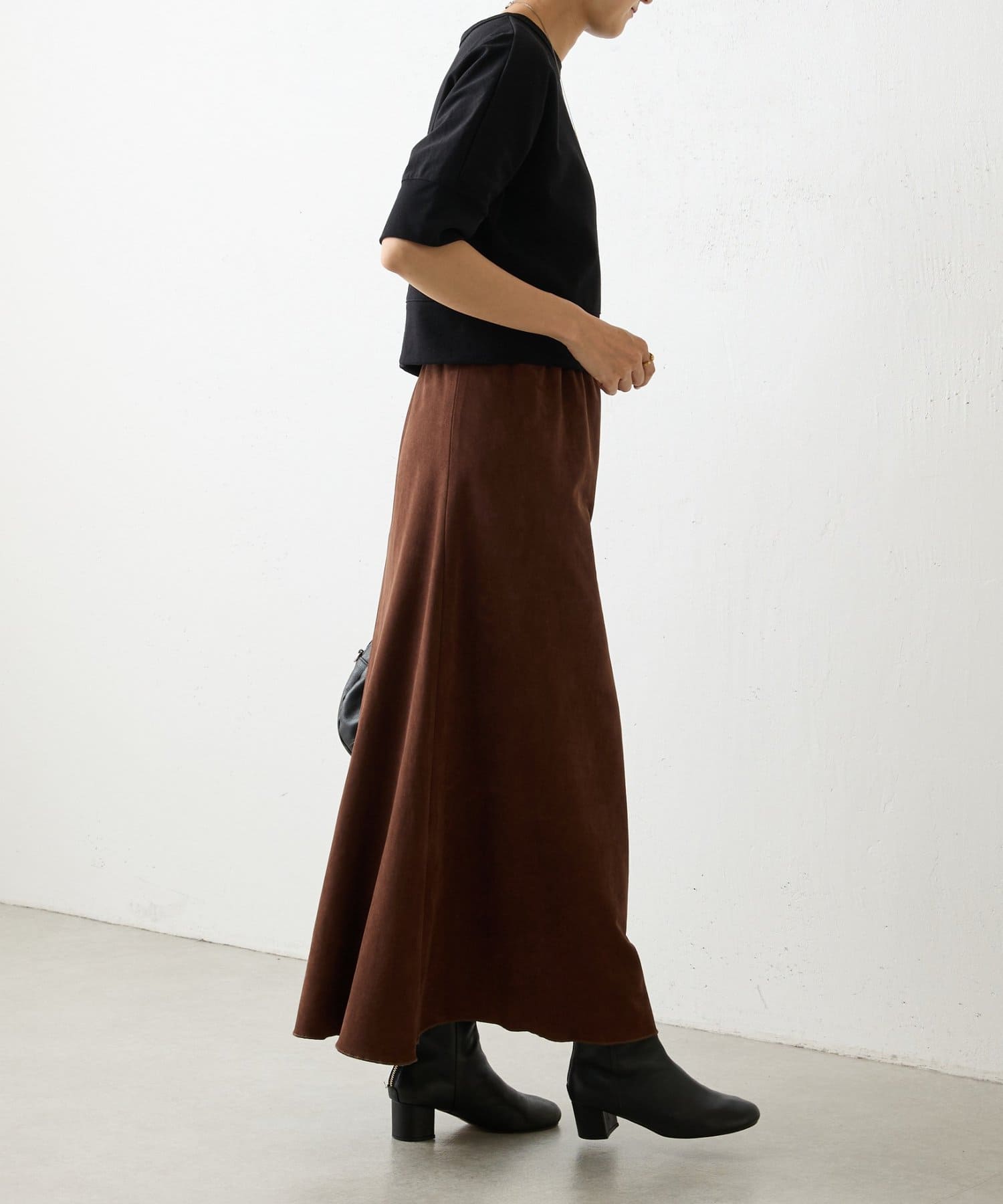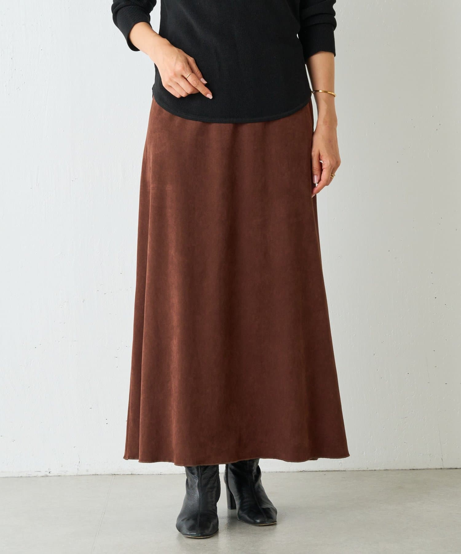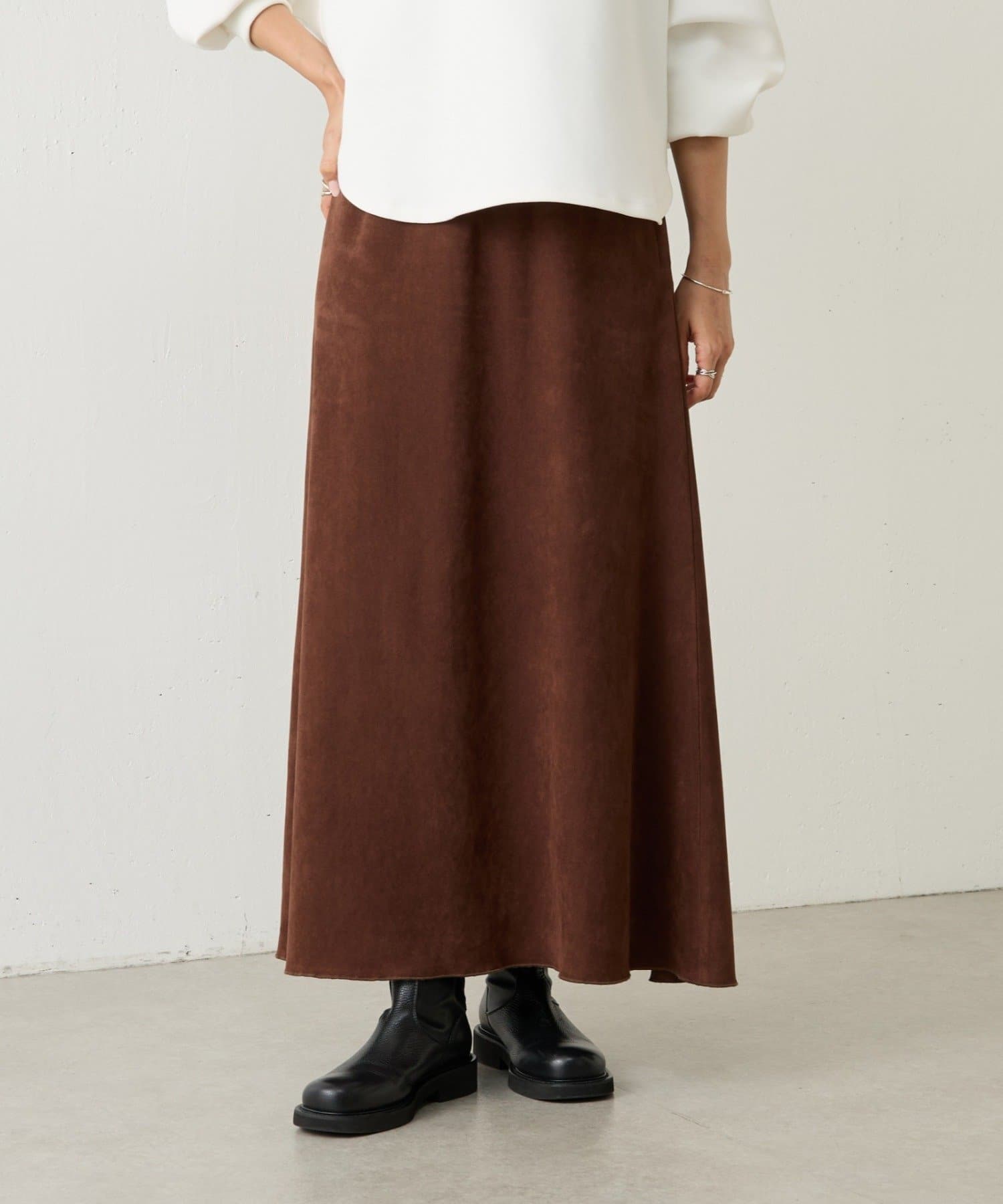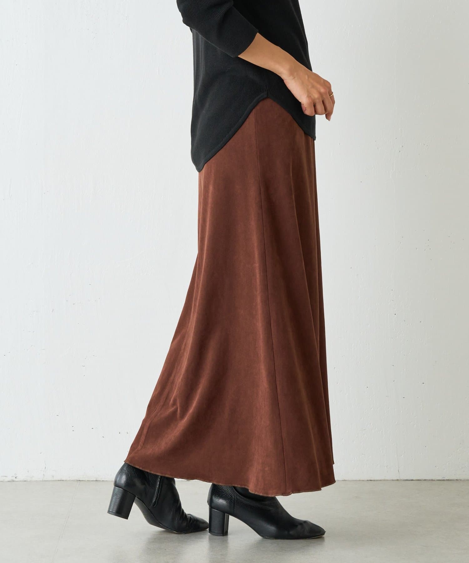 秋らしさを添えるスエード風素材を使用したロングスカート。