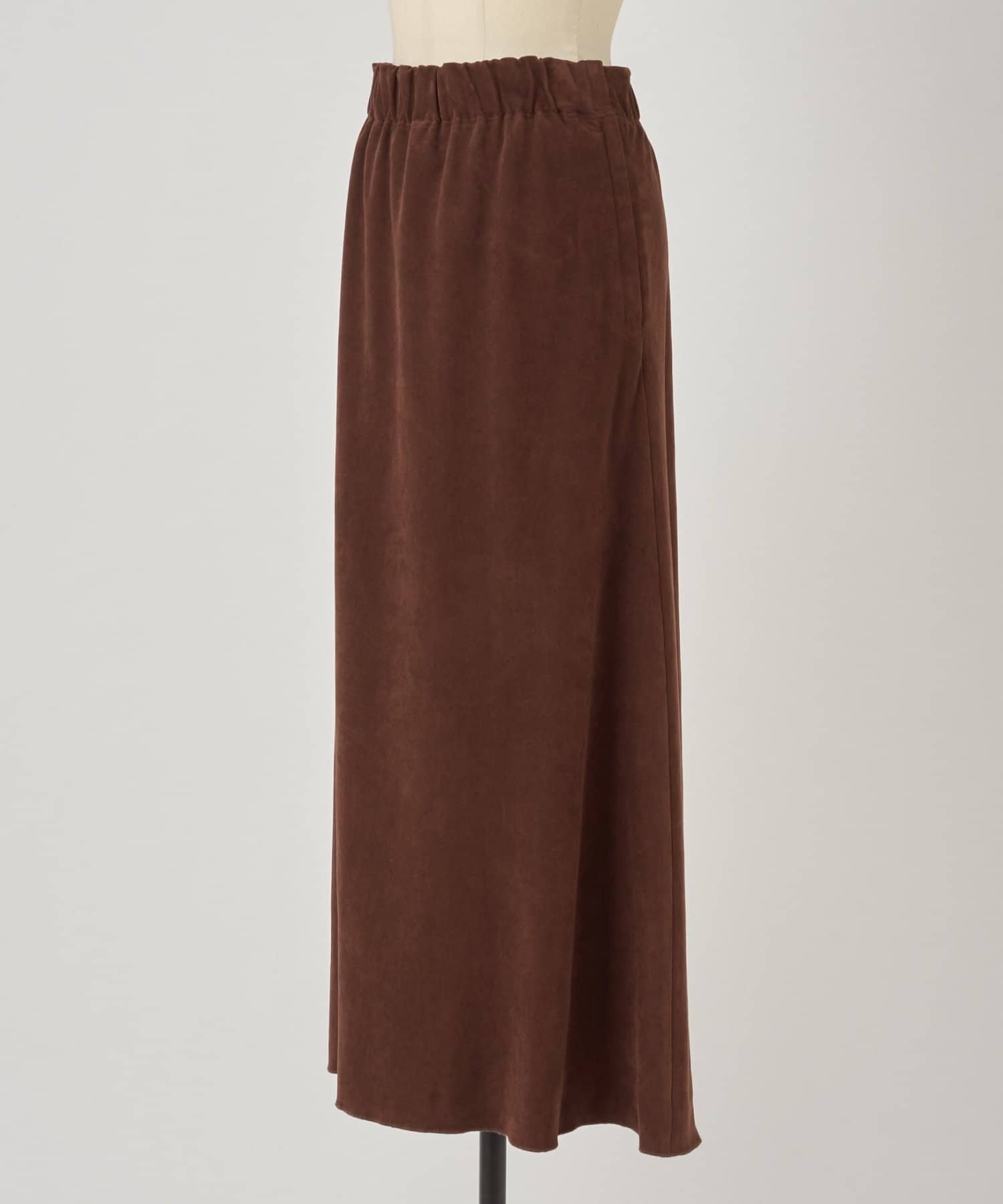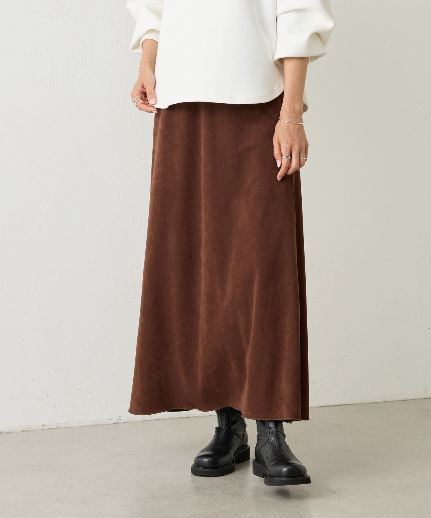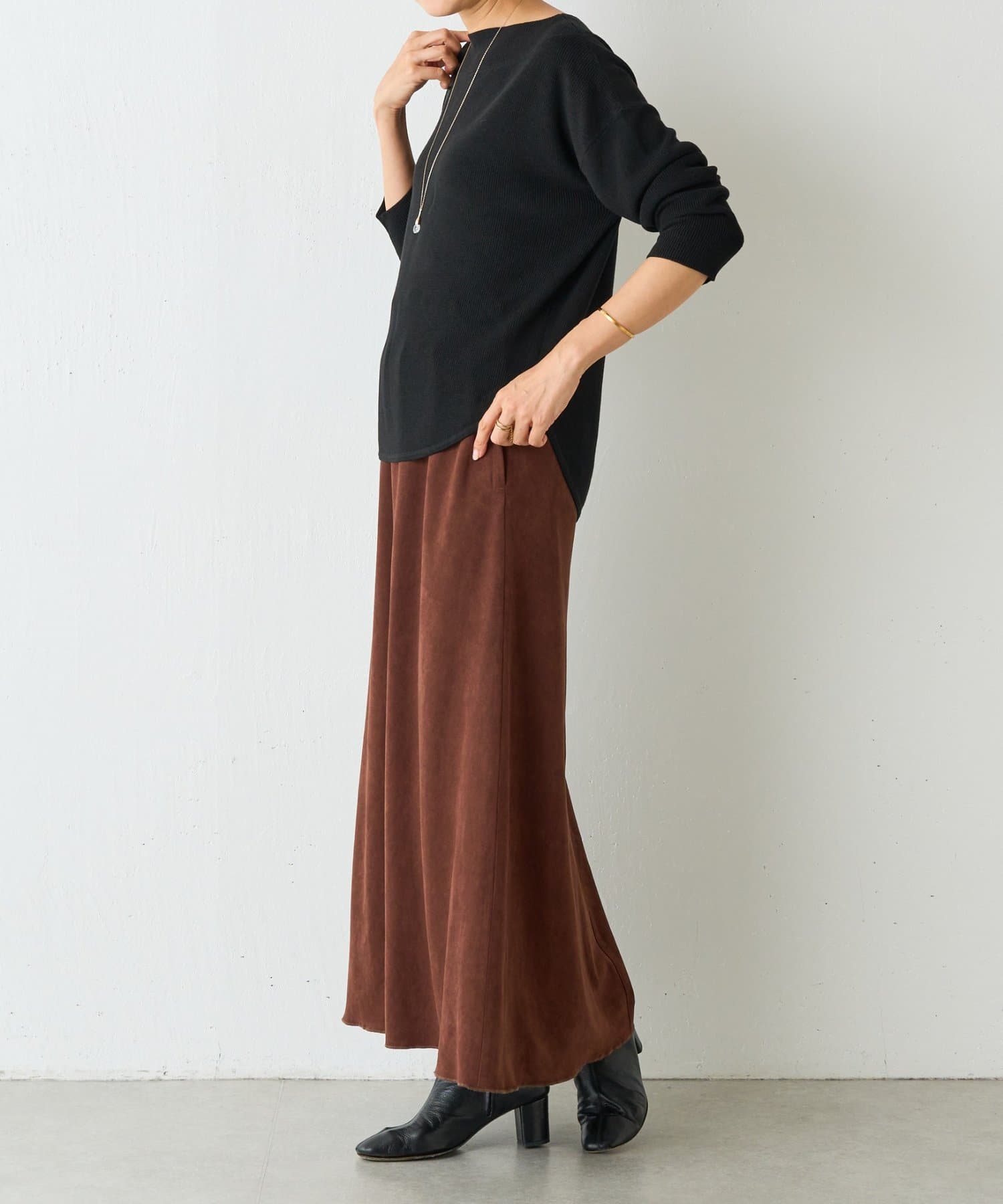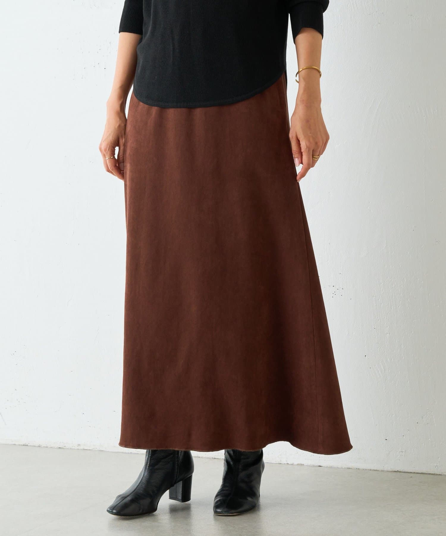秋らしさを添えるスエード風素材を使用したロングスカート。