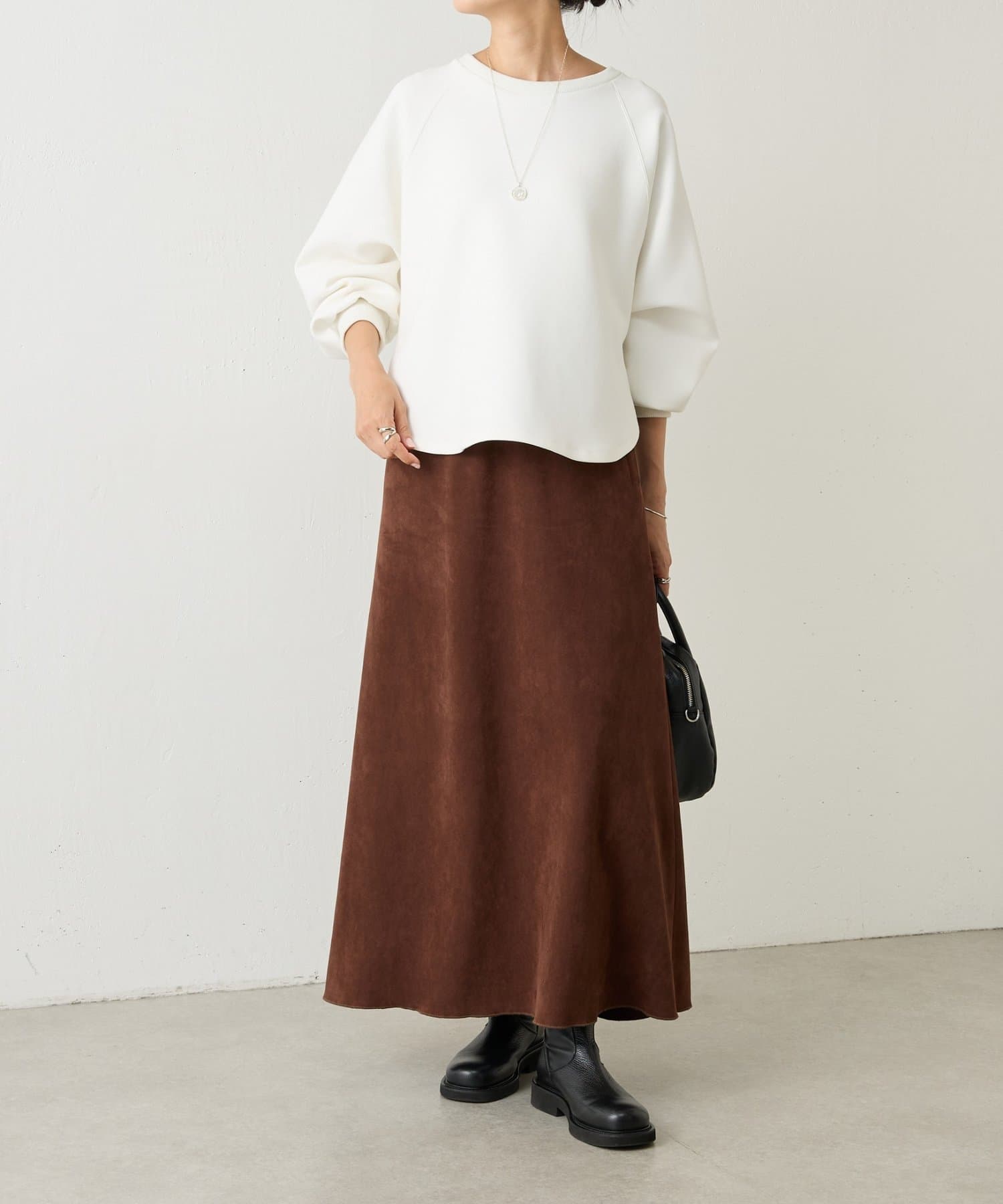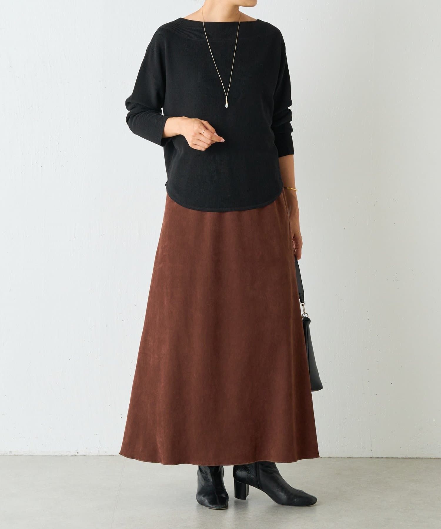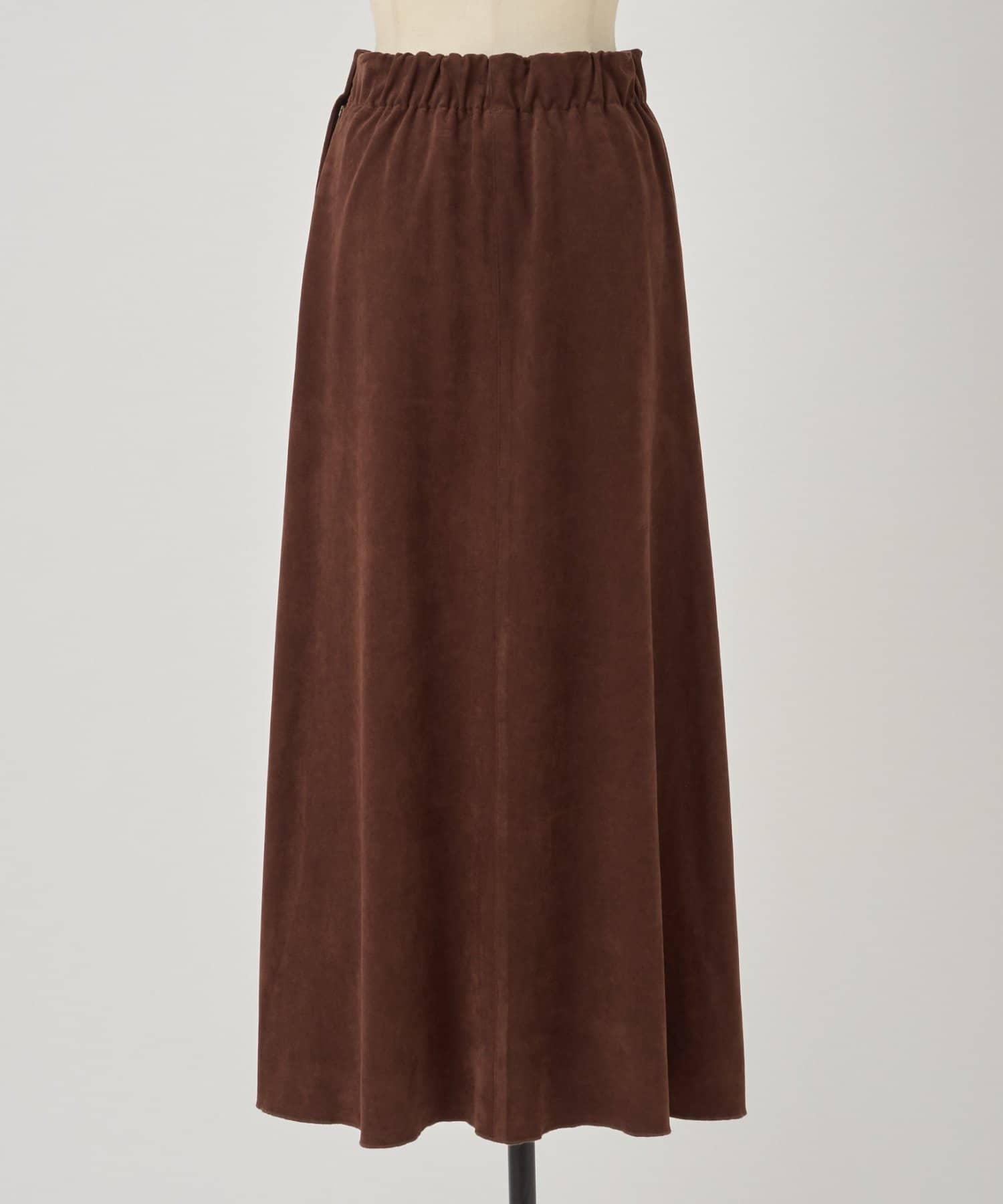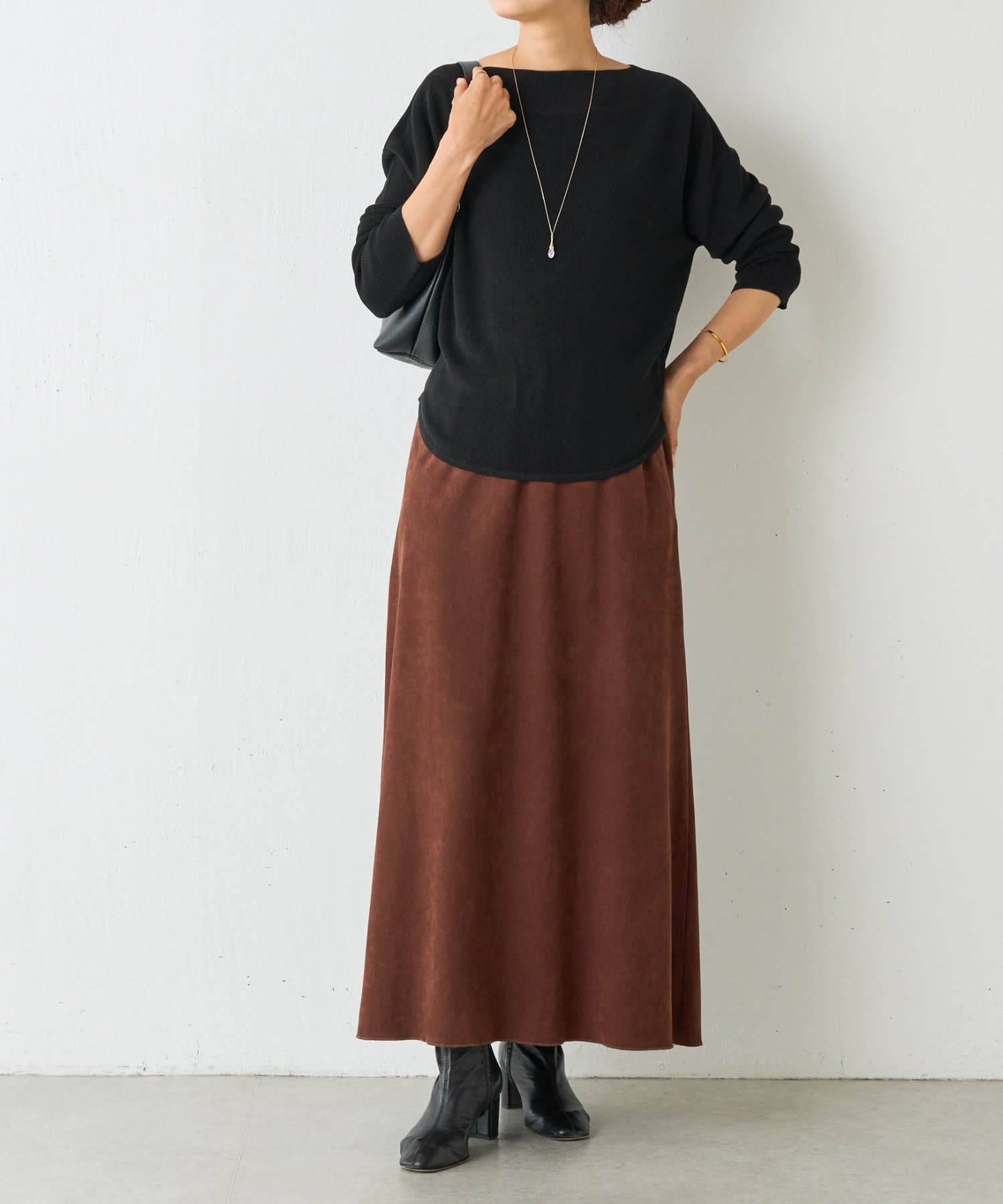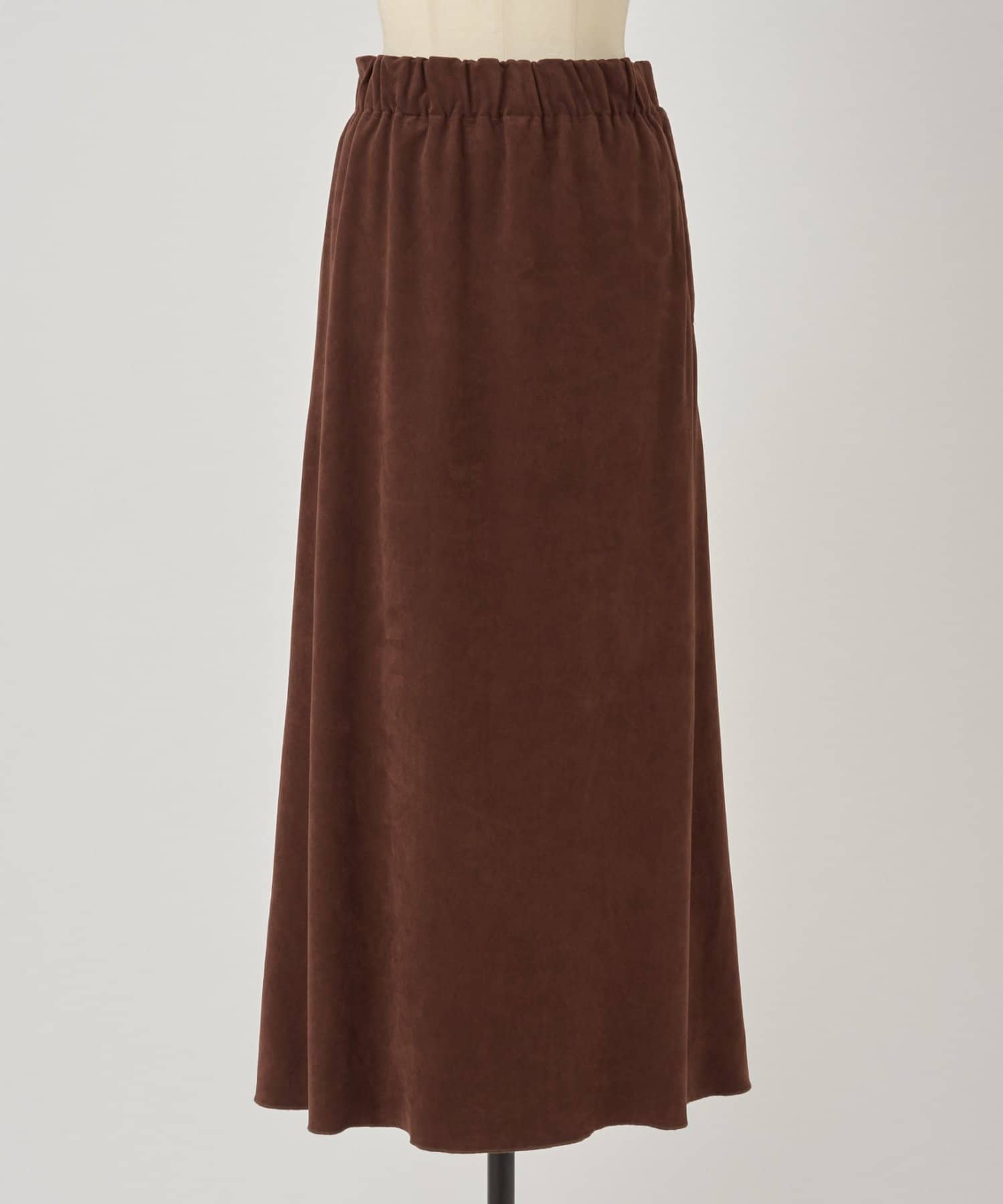 秋らしさを添えるスエード風素材を使用したロングスカート。
