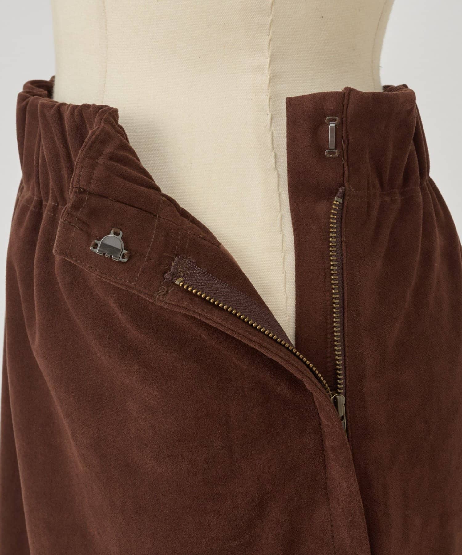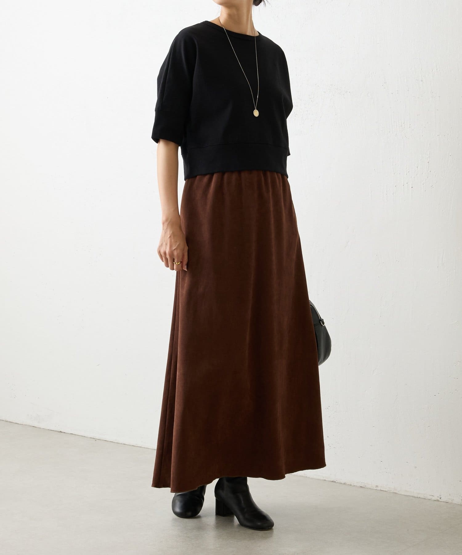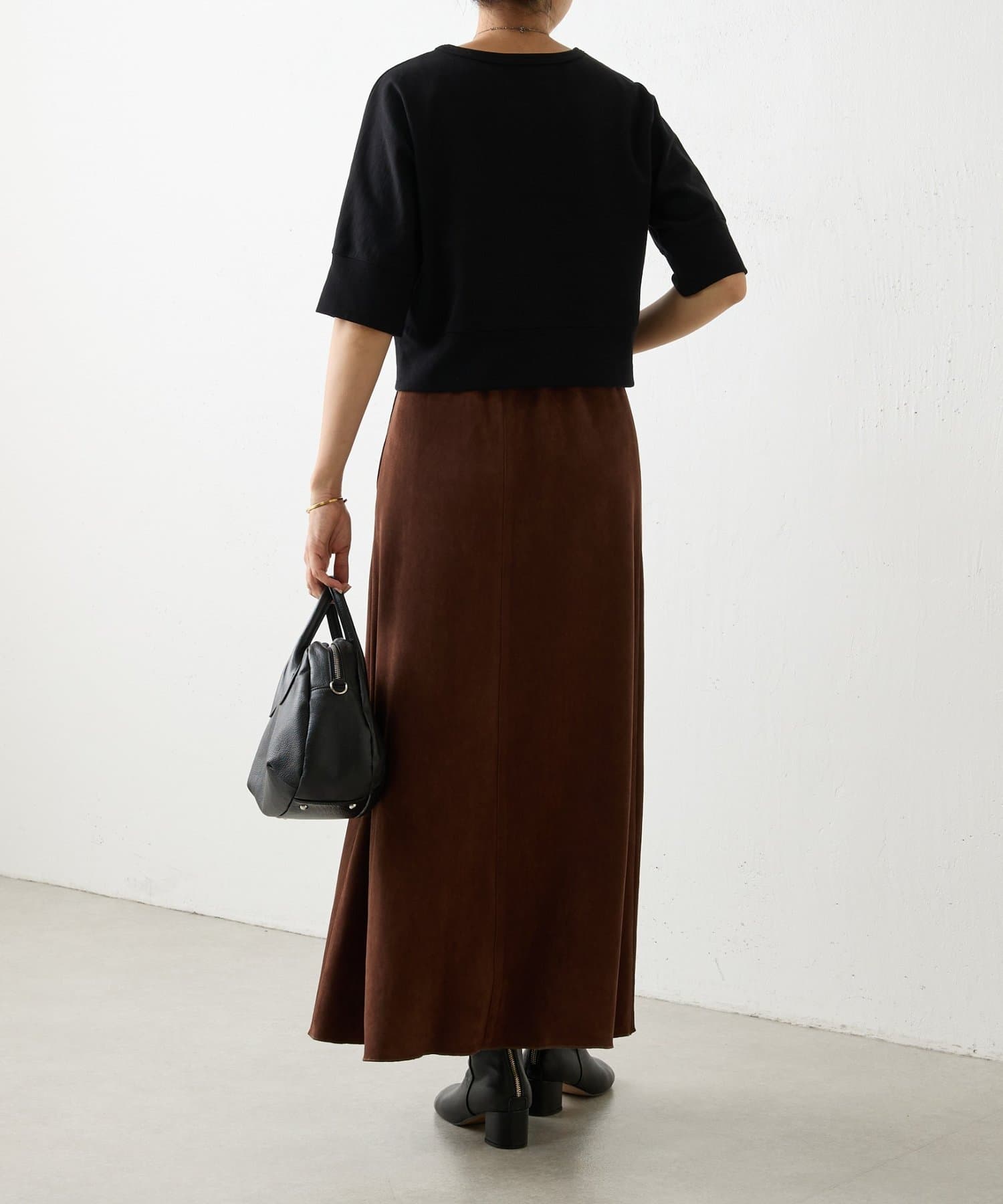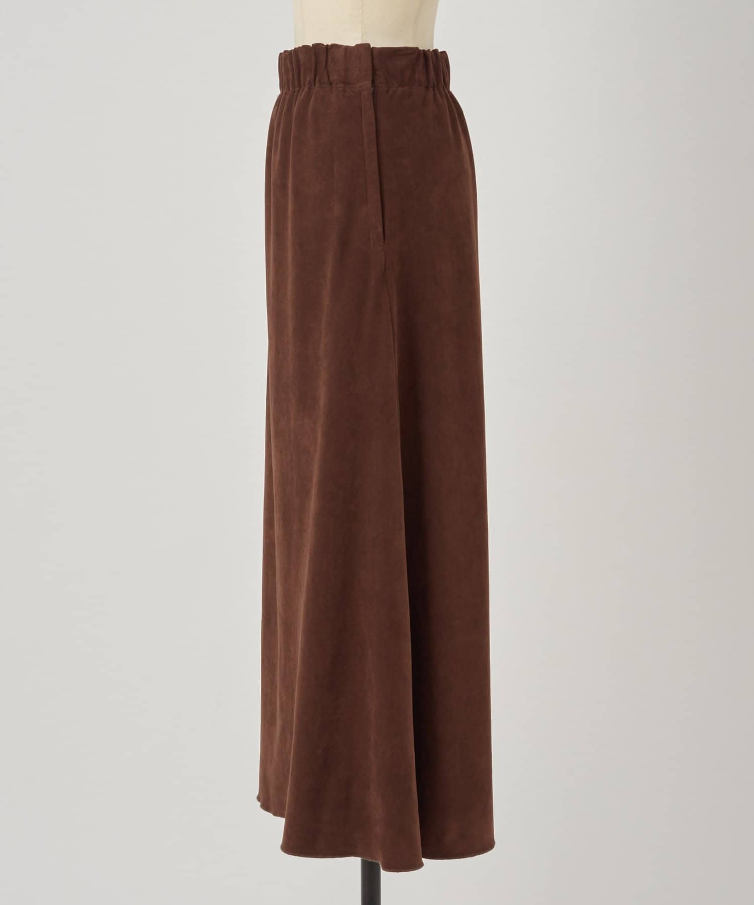 秋らしさを添えるスエード風素材を使用したロングスカート。
