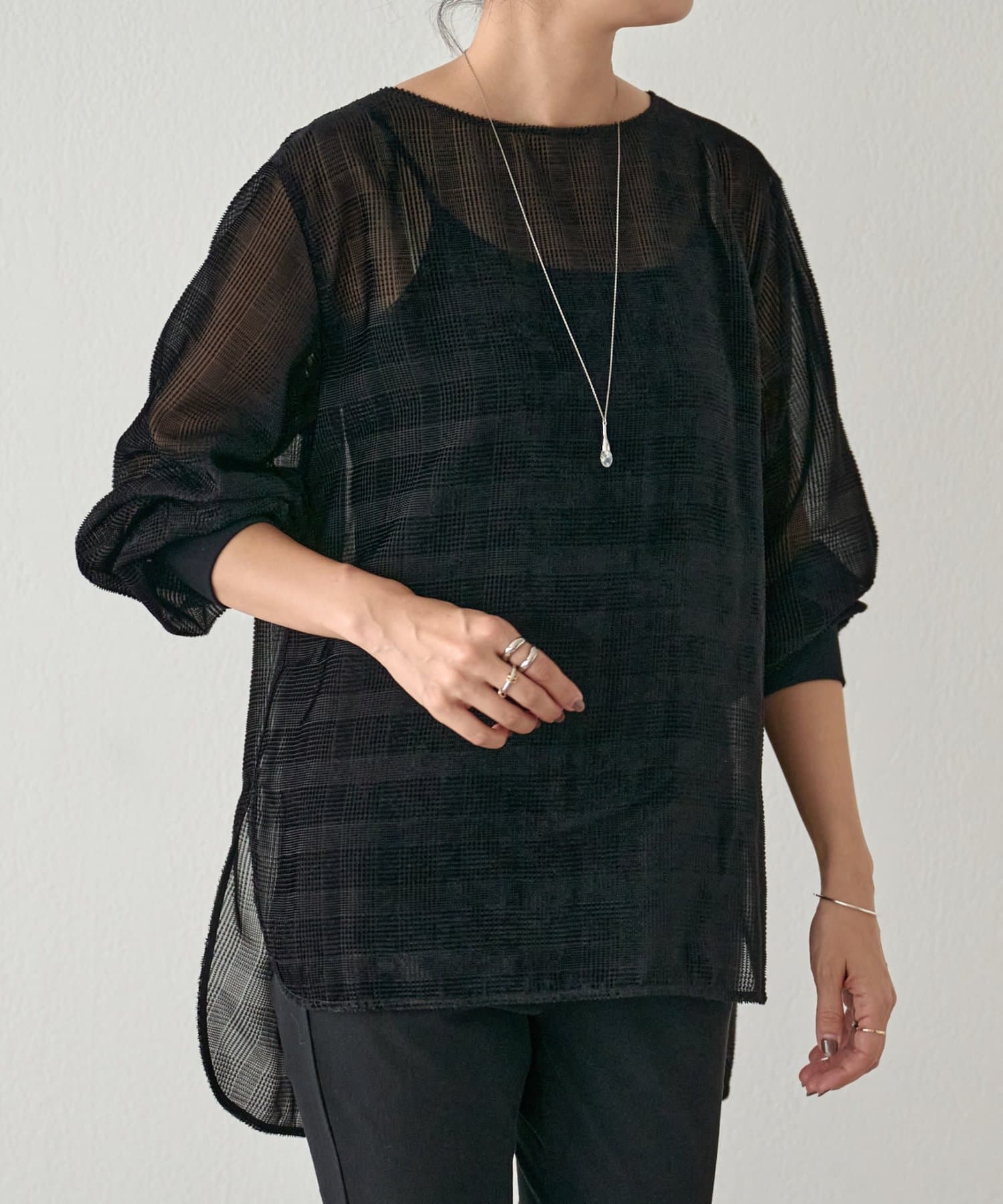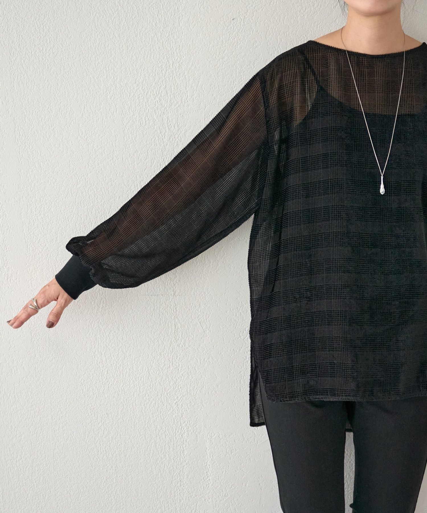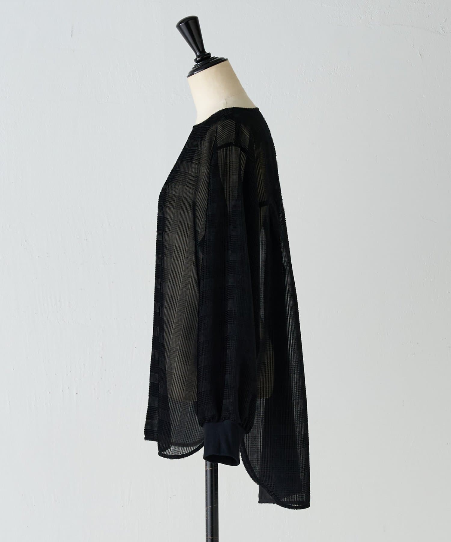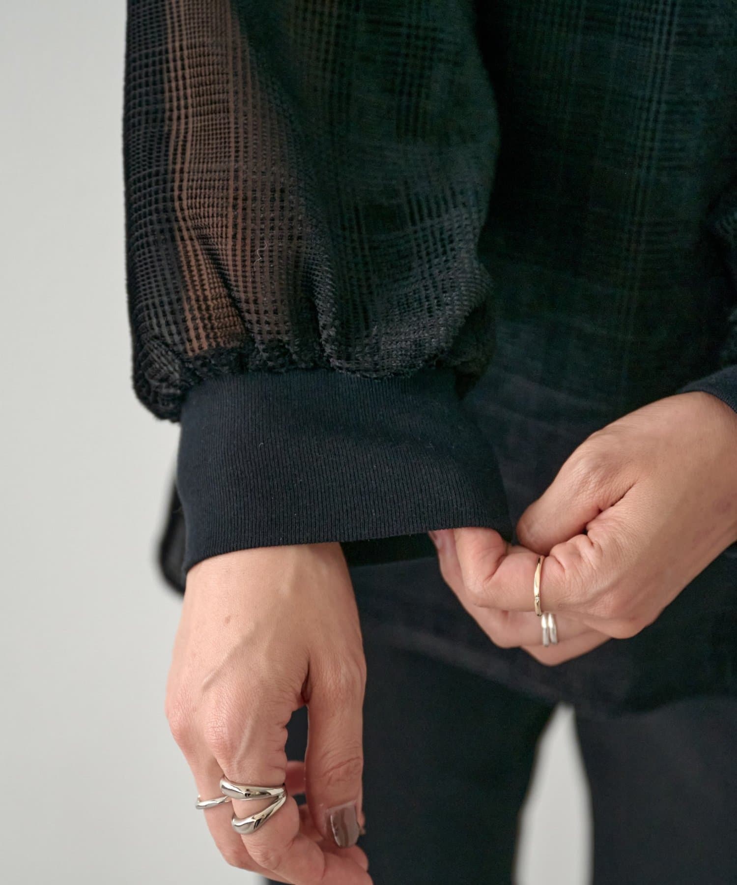 シアー感とベルベットでチェック柄を表現した異素材ミックスが魅力のプルオーバー。