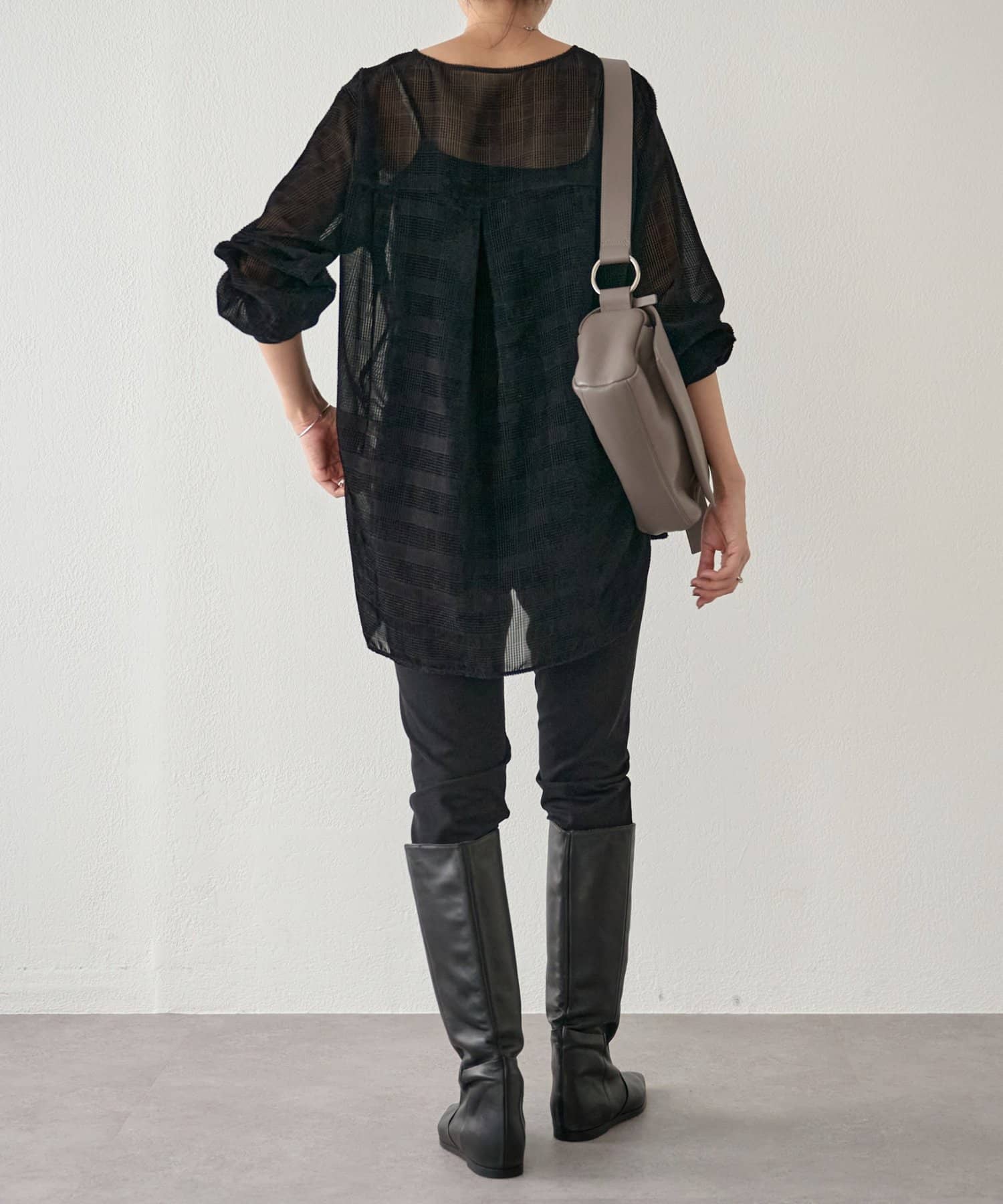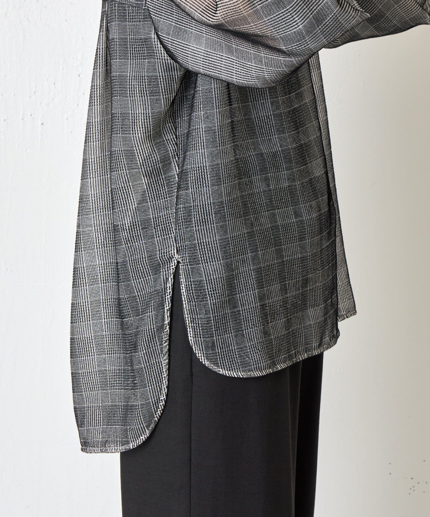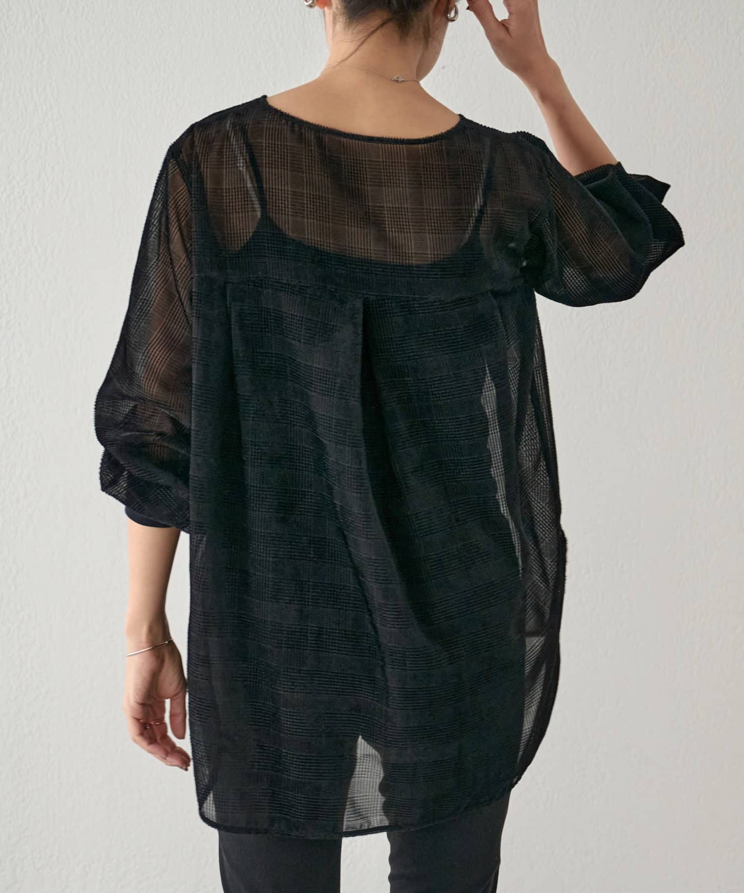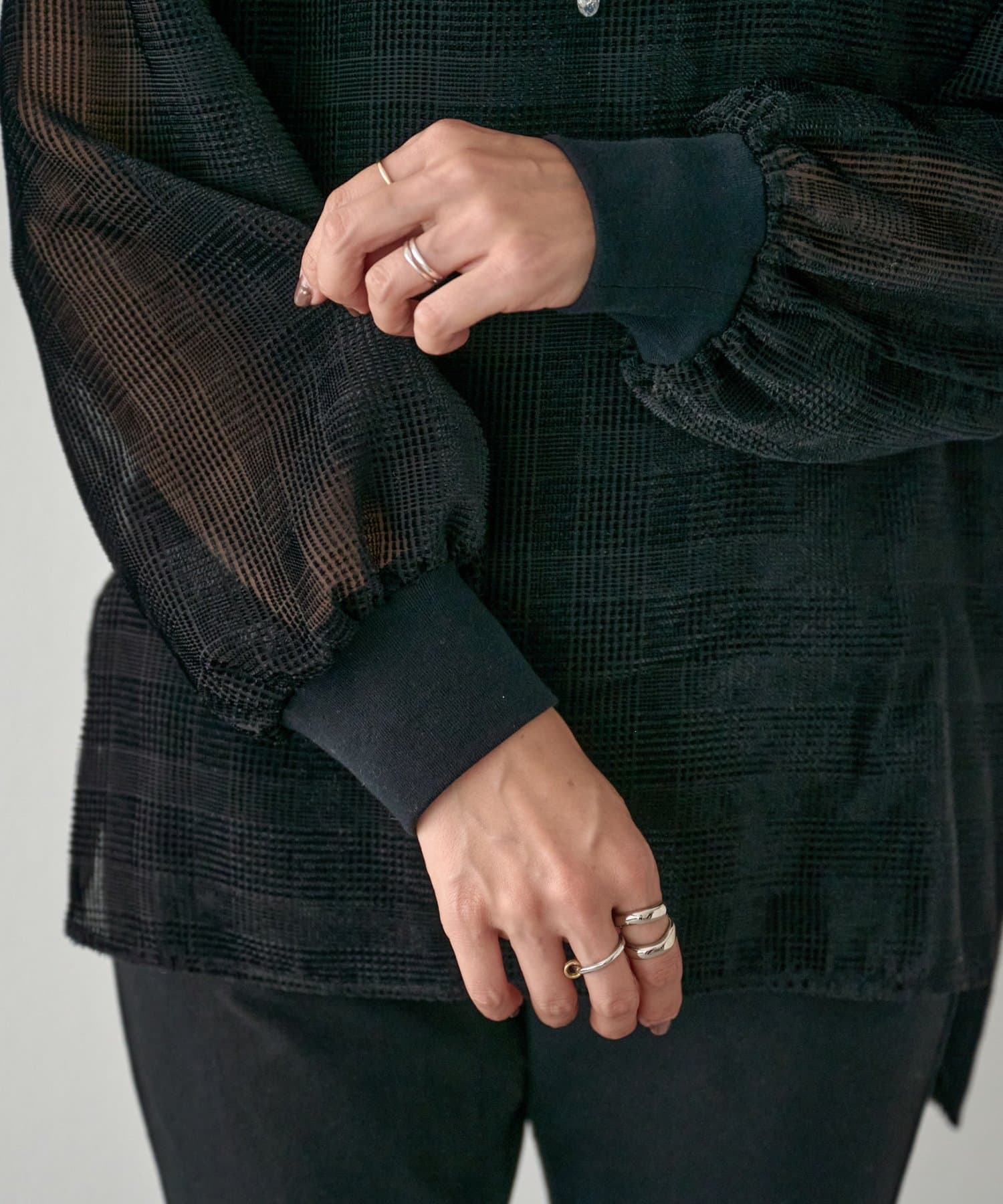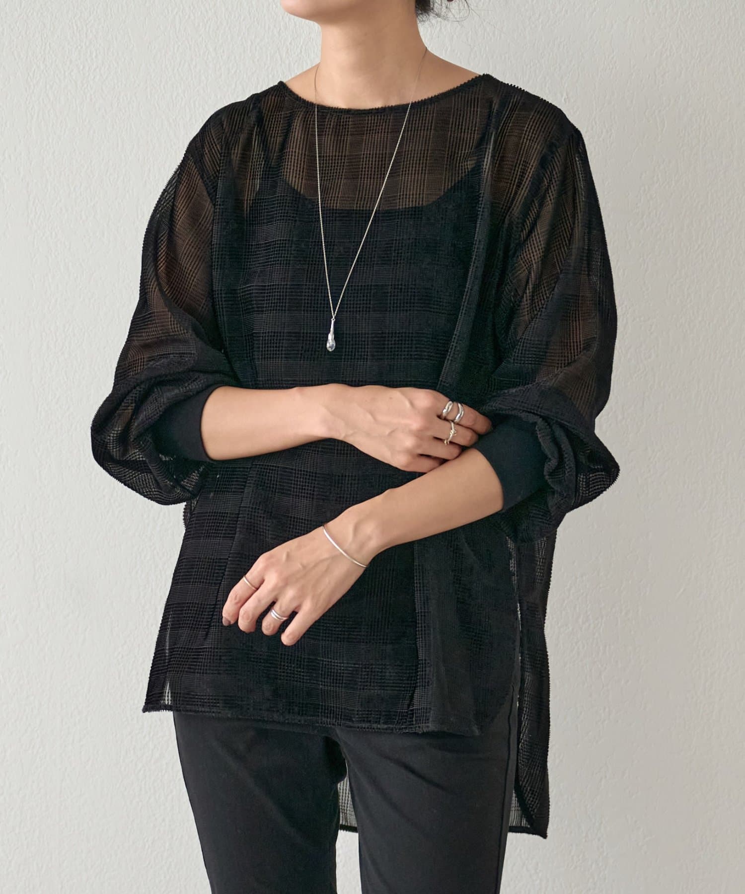 上品な透け感のある軽やかなシアー生地で仕立てられており、秋のレイヤードスタイルにも映える一枚です。