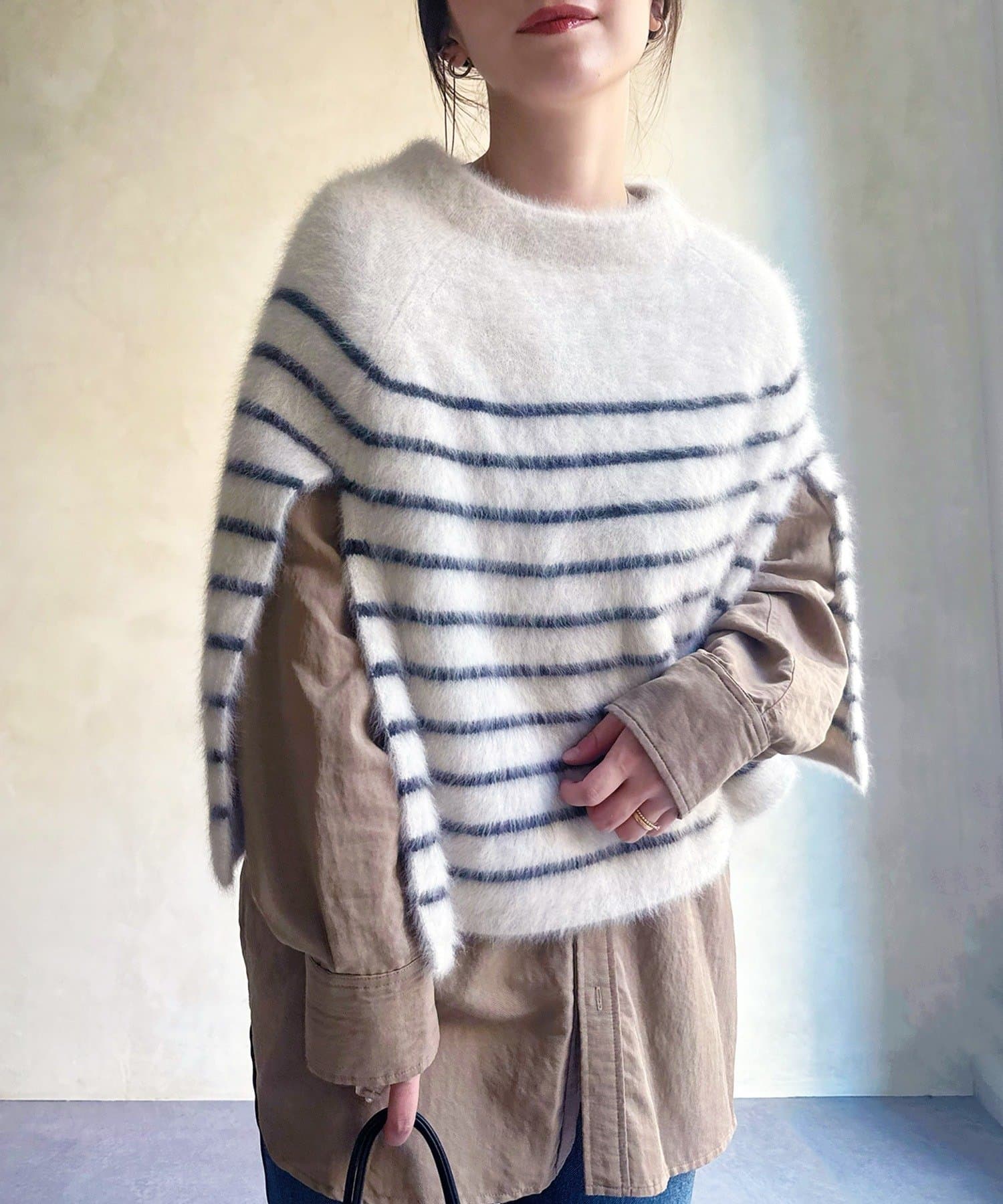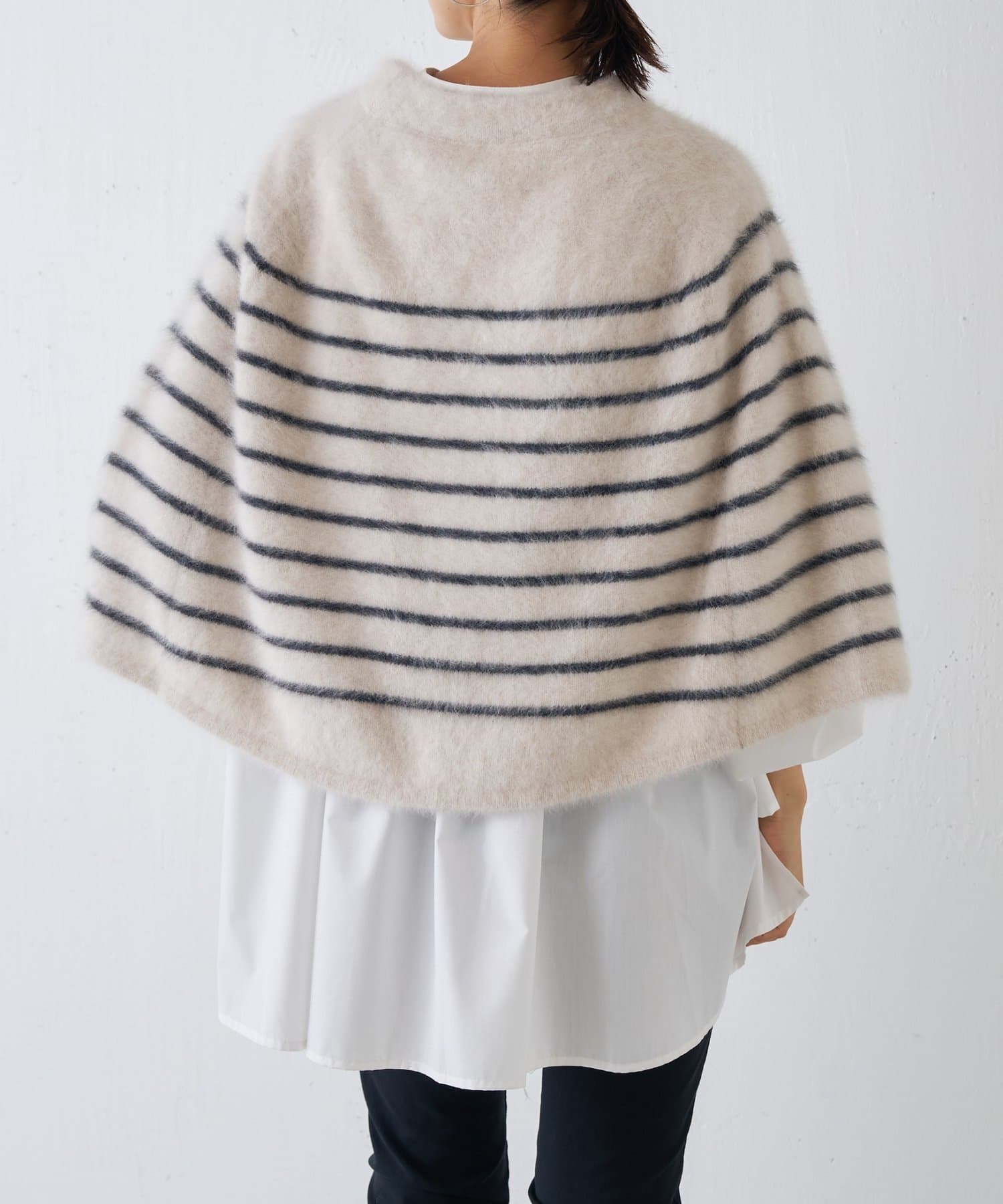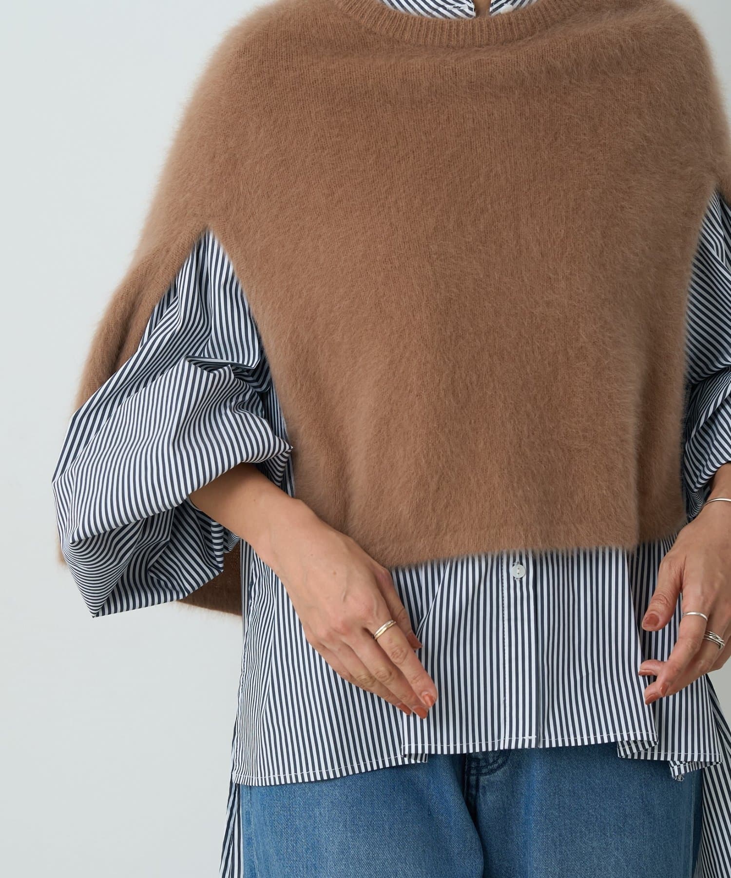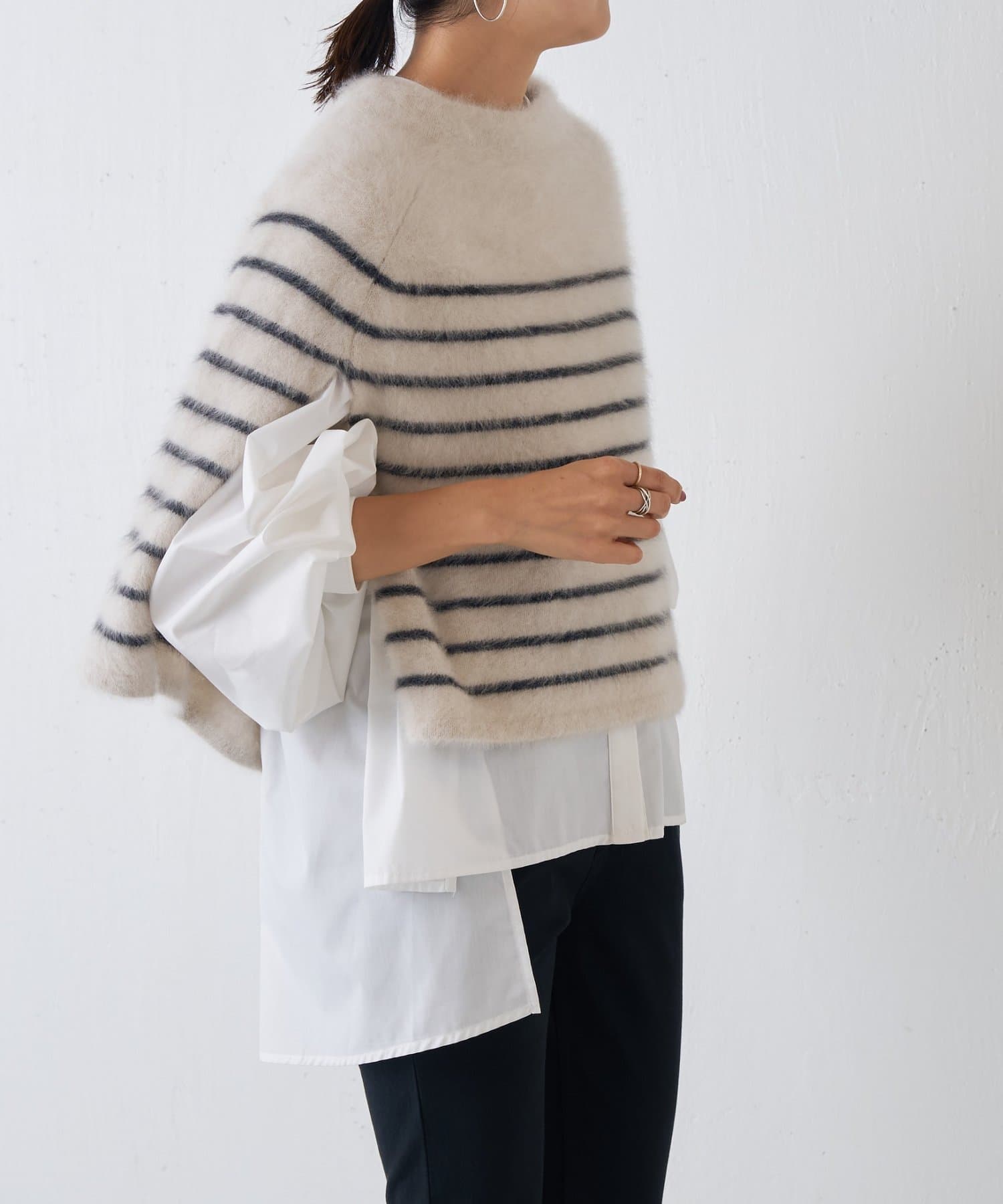 ショールのように軽やかにまとえる、ショート丈のファーニットポンチョ。