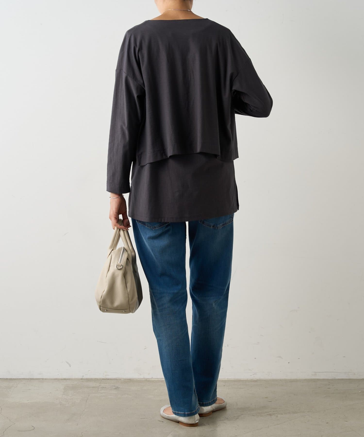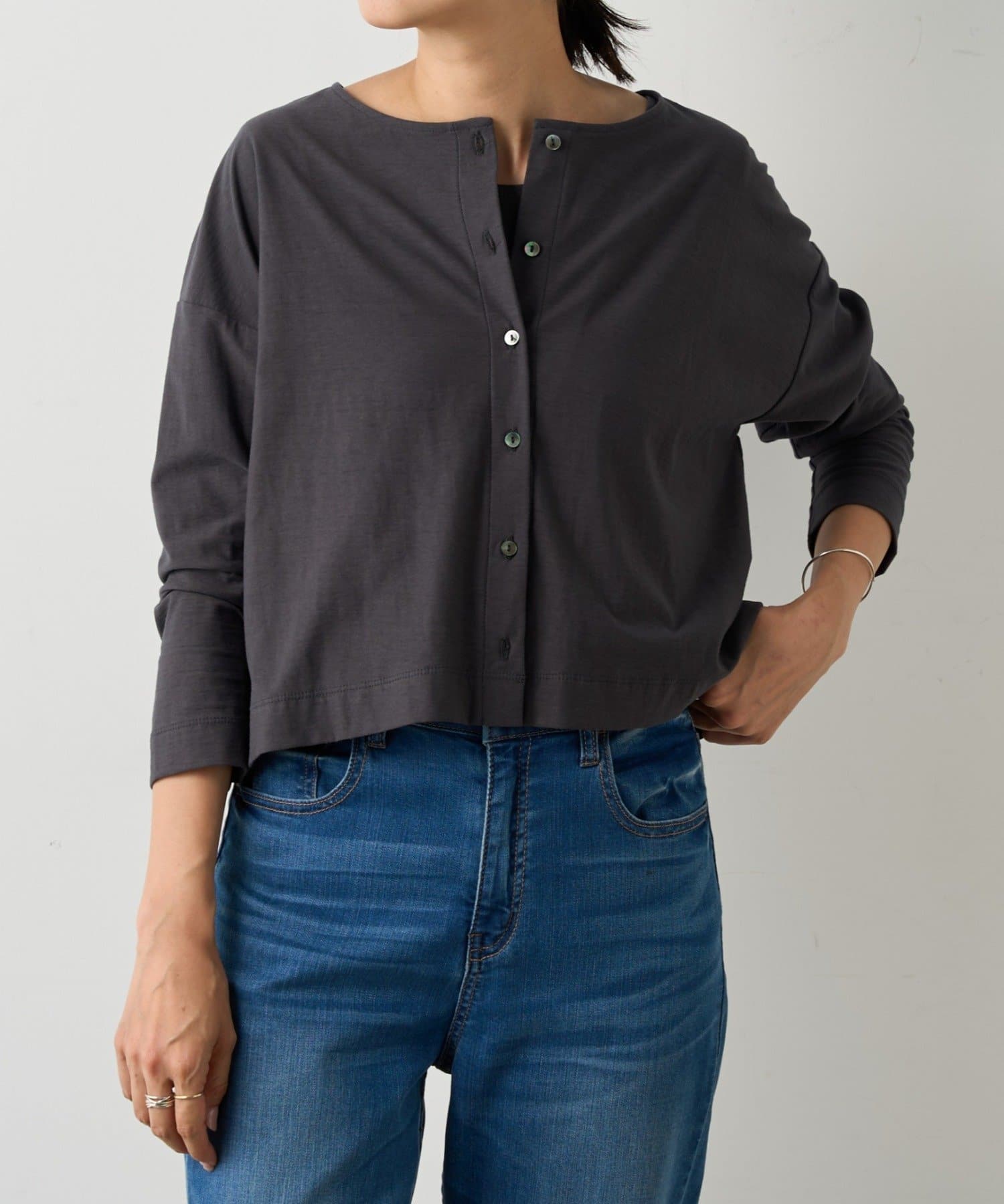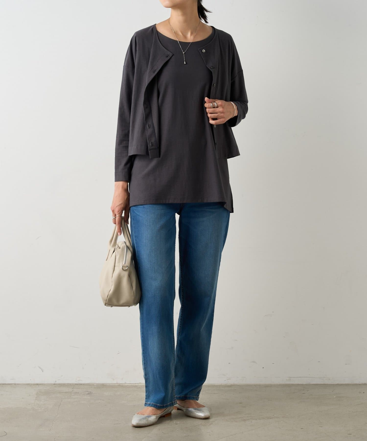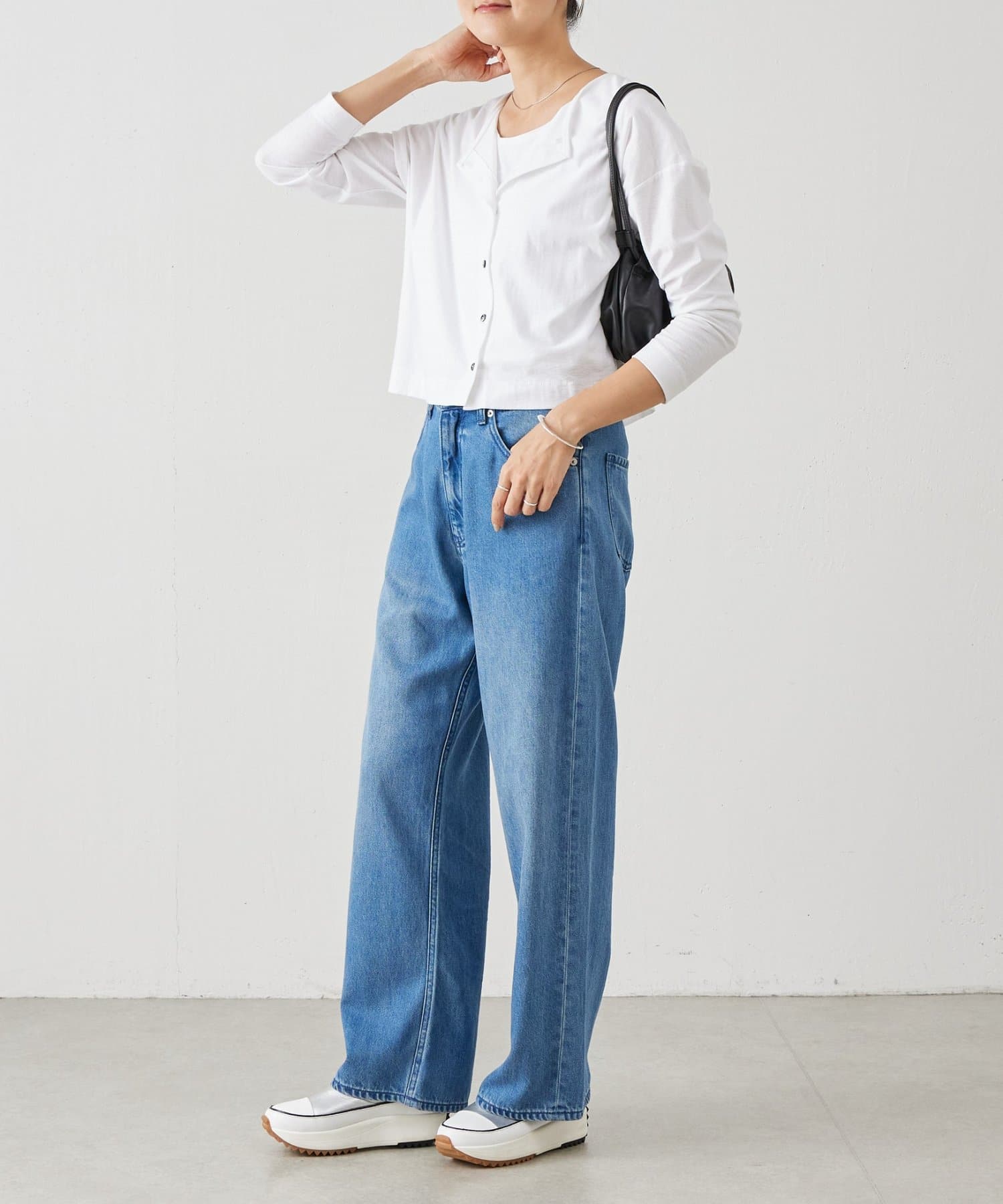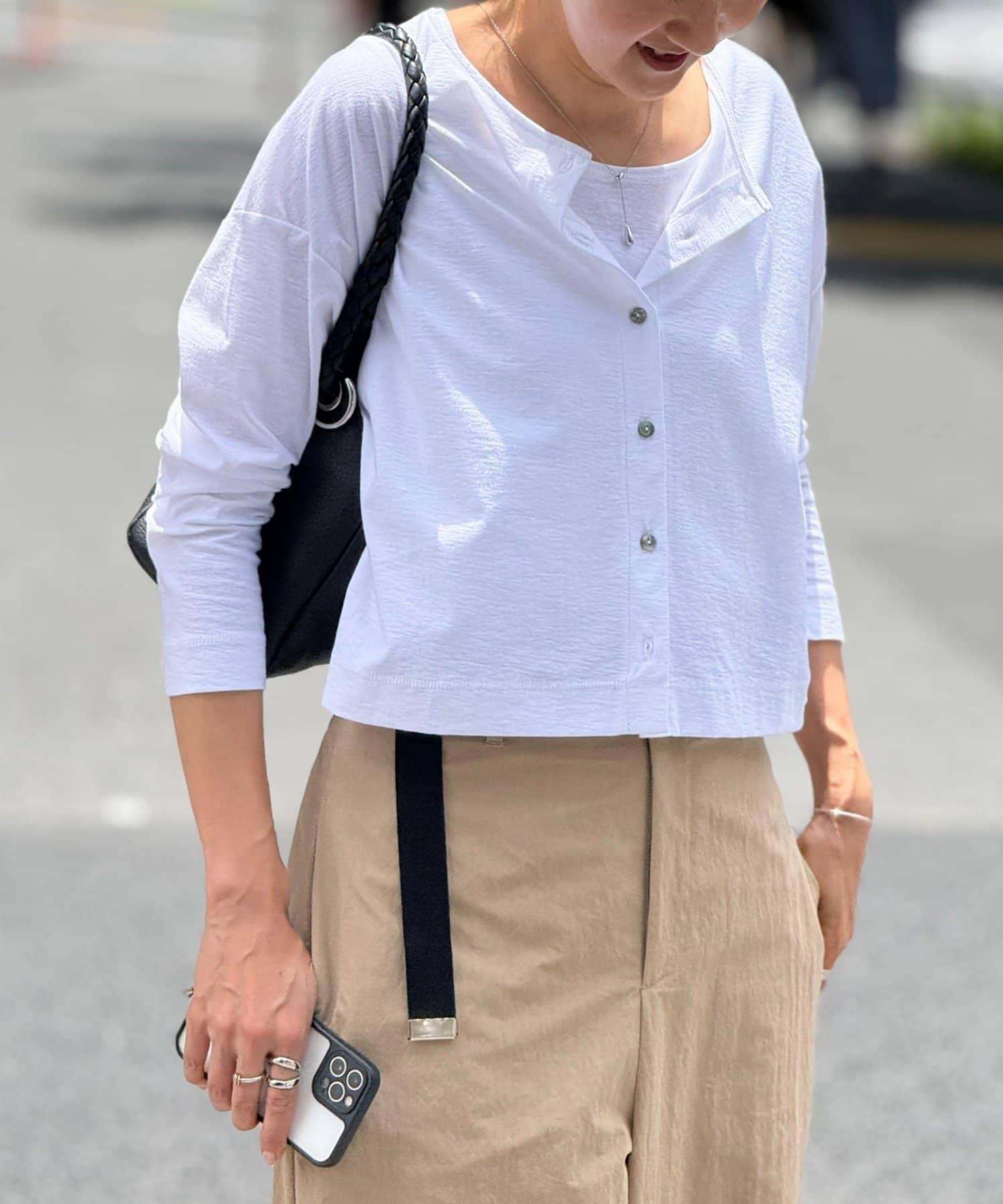 やや短めの丈感で、ワンピースやワイドパンツともバランスがとりやすく、スタイルアップ効果も◎。