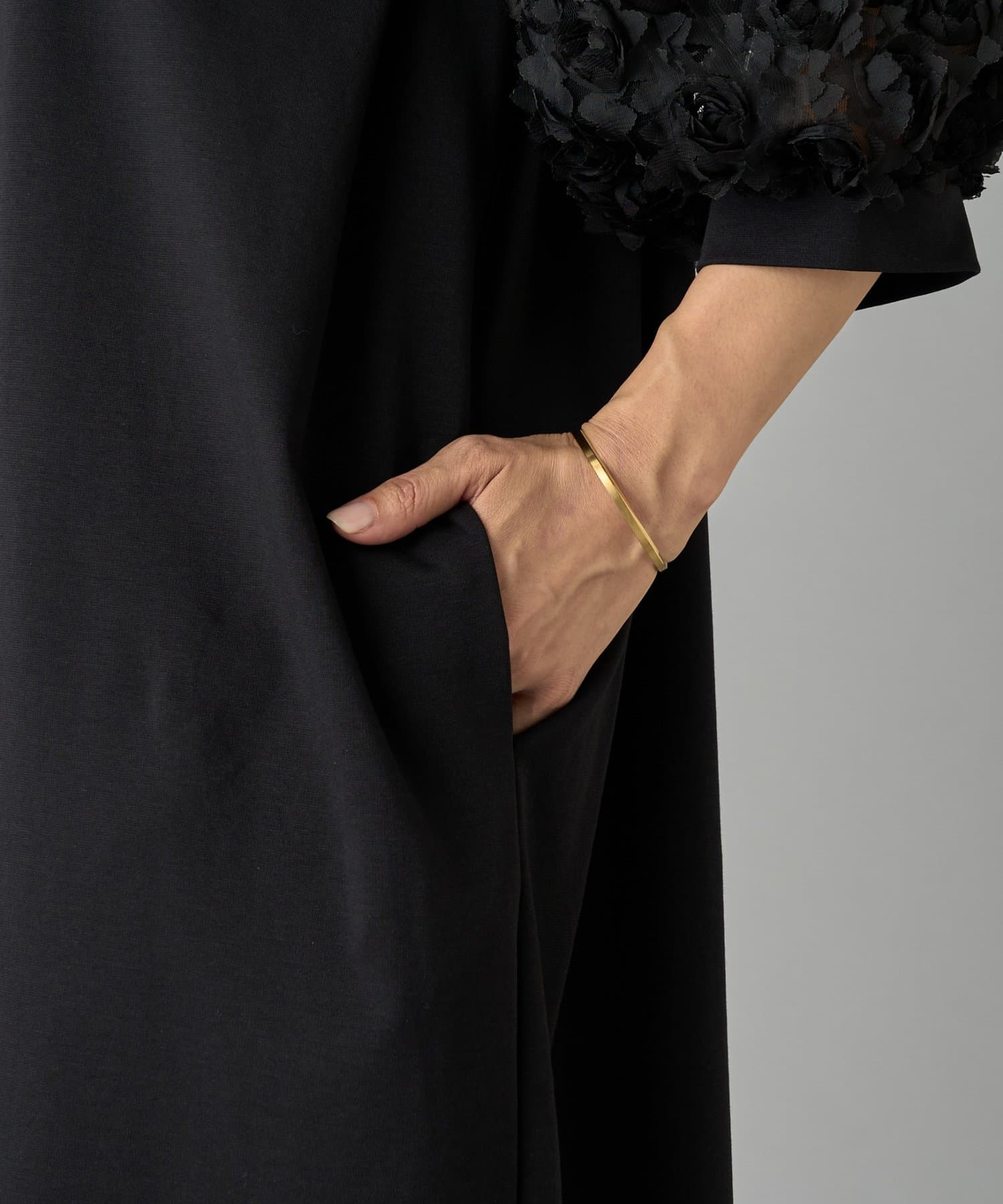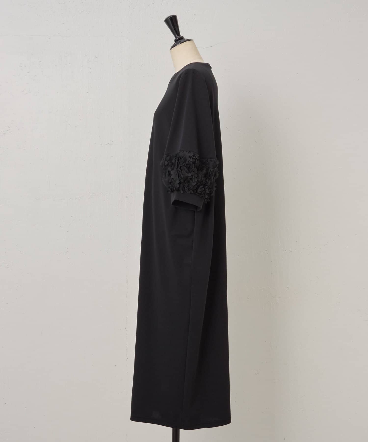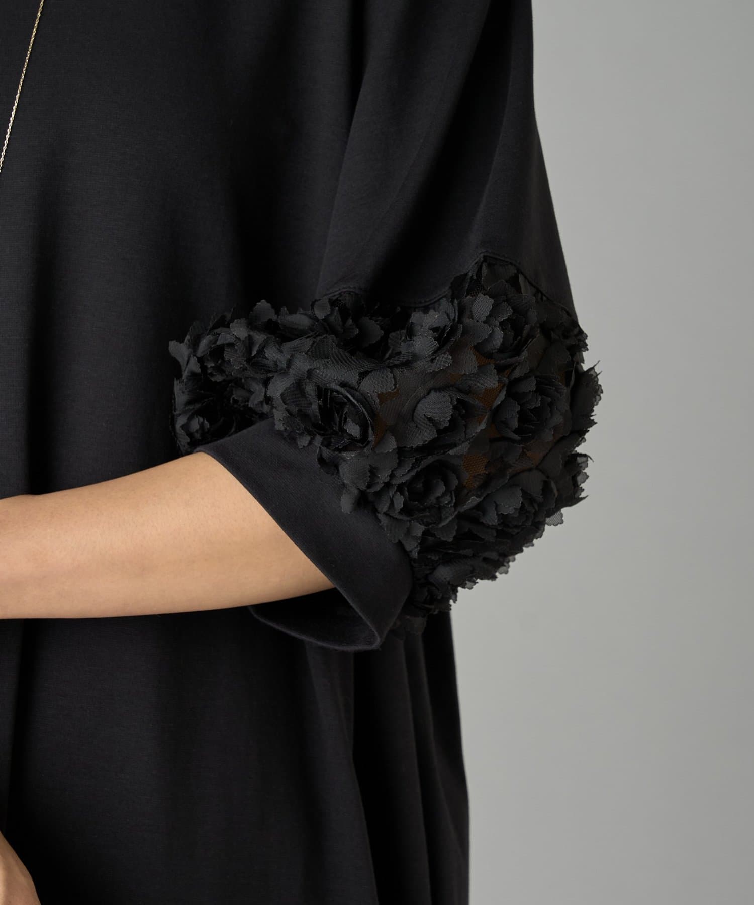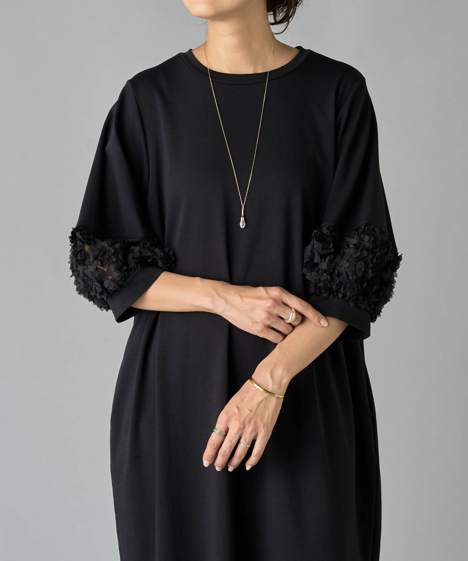 華やかな花モチーフのボリューム袖が目を惹く、エレガントなワンピース。