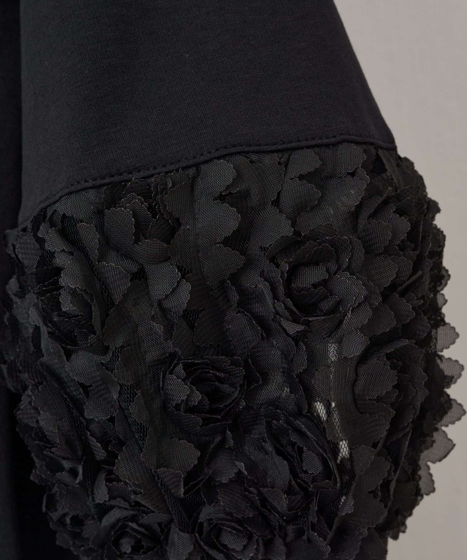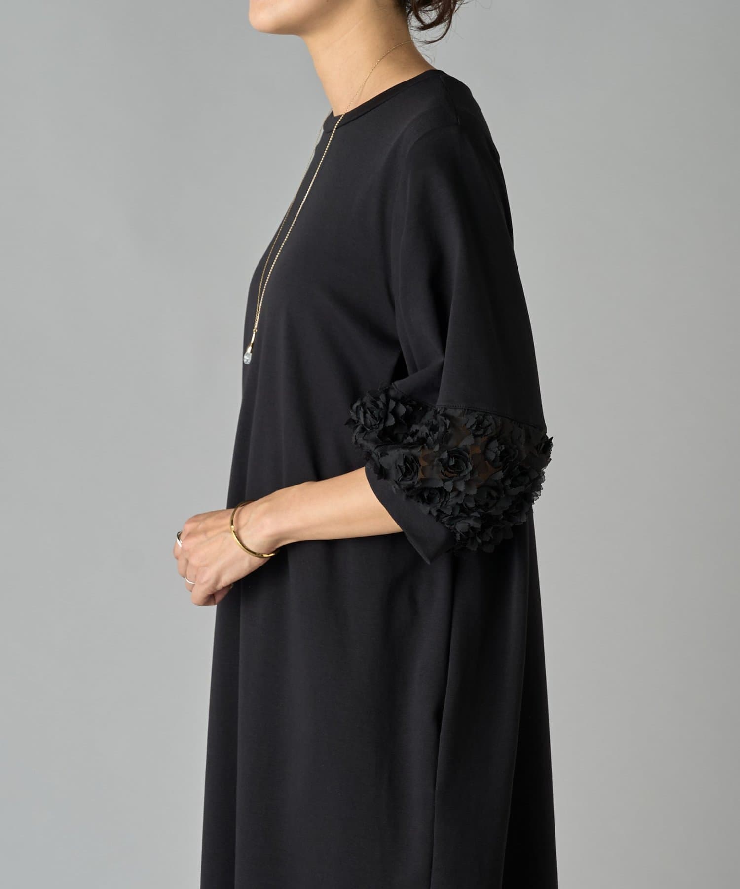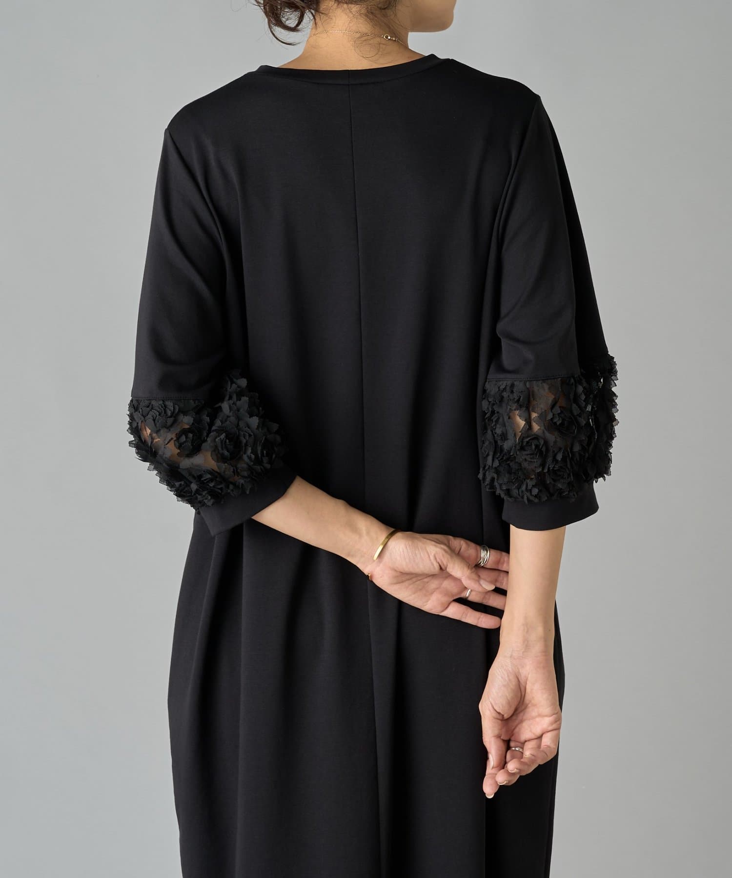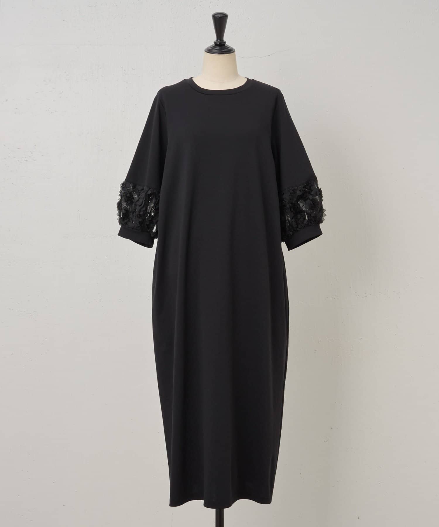 華やかな花モチーフのボリューム袖が目を惹く、エレガントなワンピース。