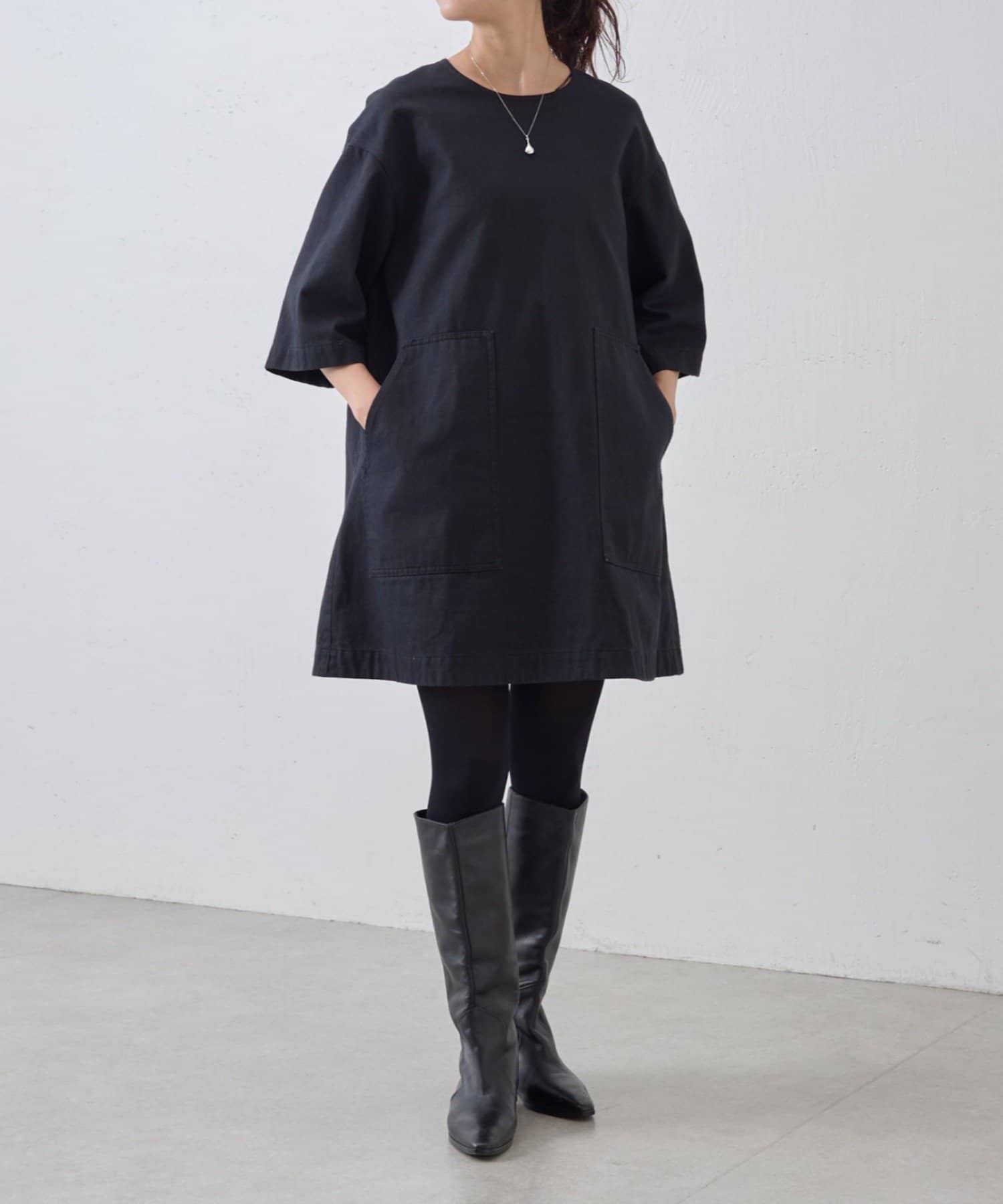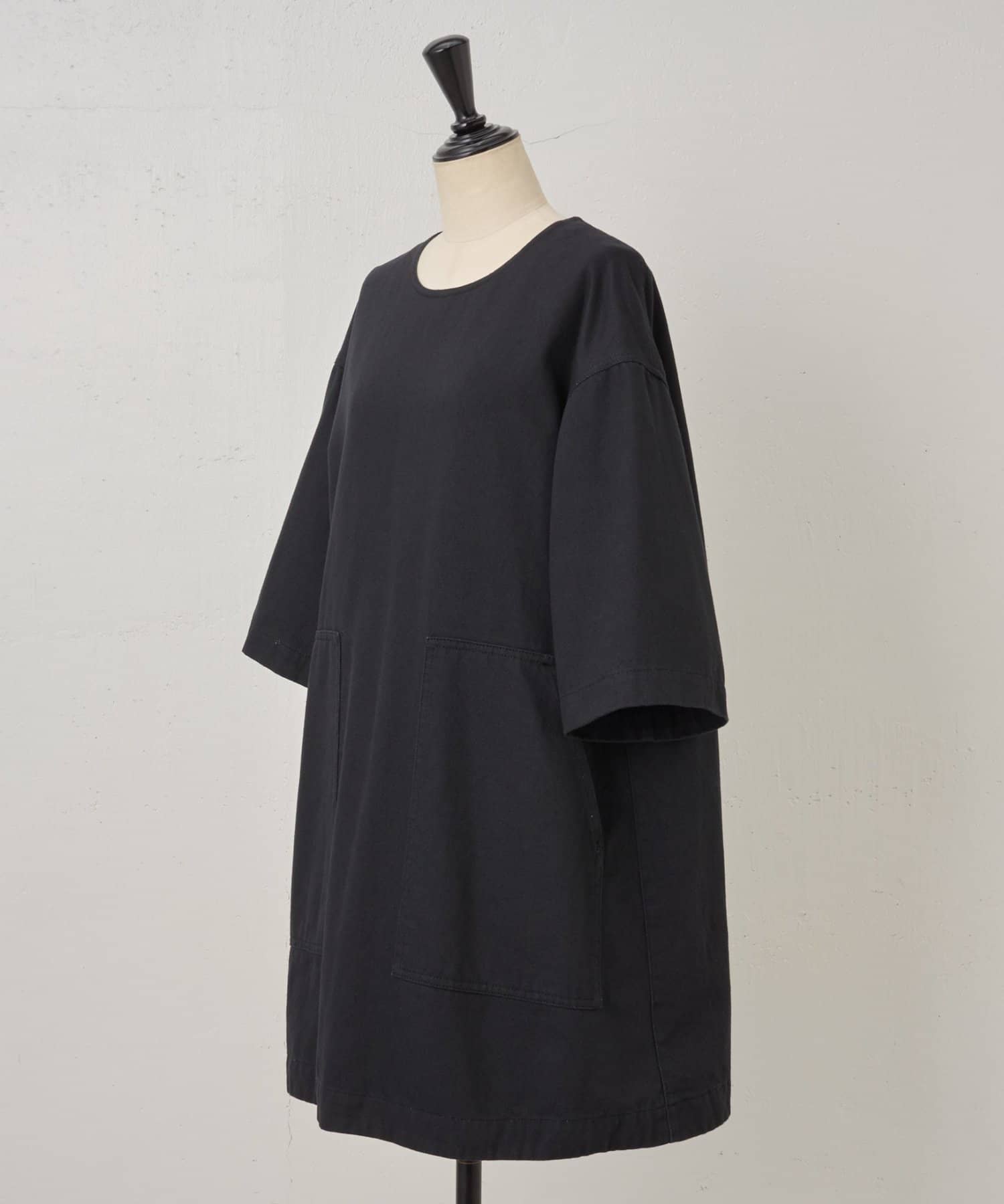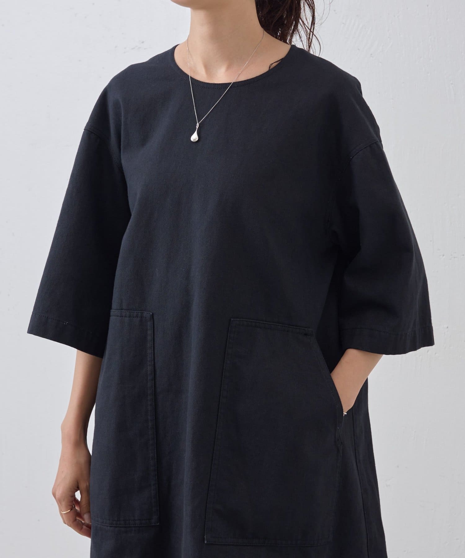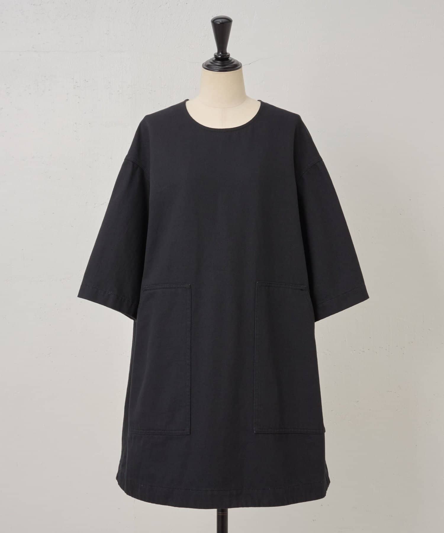 帆布風の生地に、大きなポケットがアクセントになったミニワンピース。