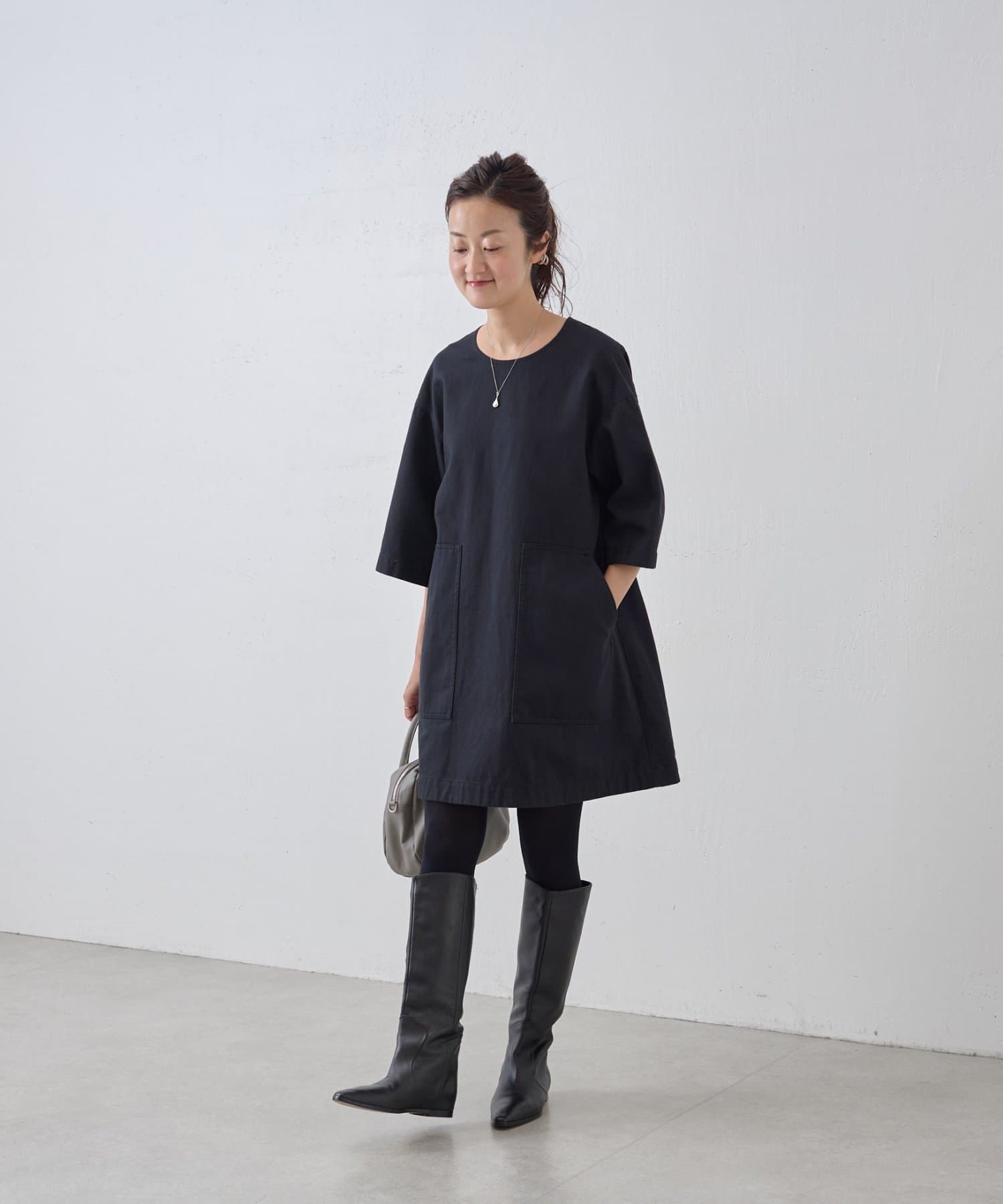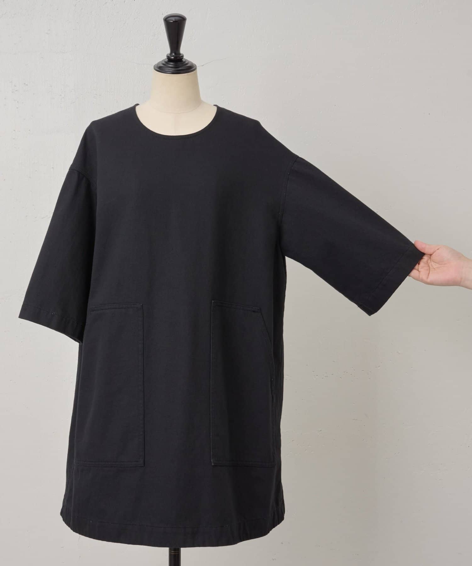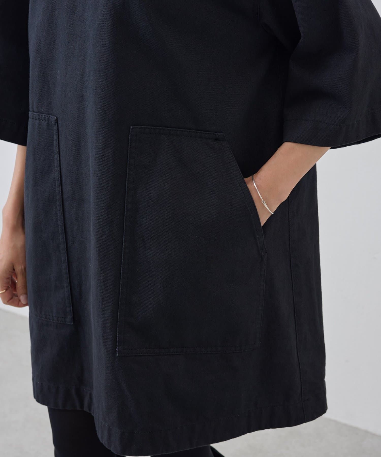 帆布風の生地に、大きなポケットがアクセントになったミニワンピース。