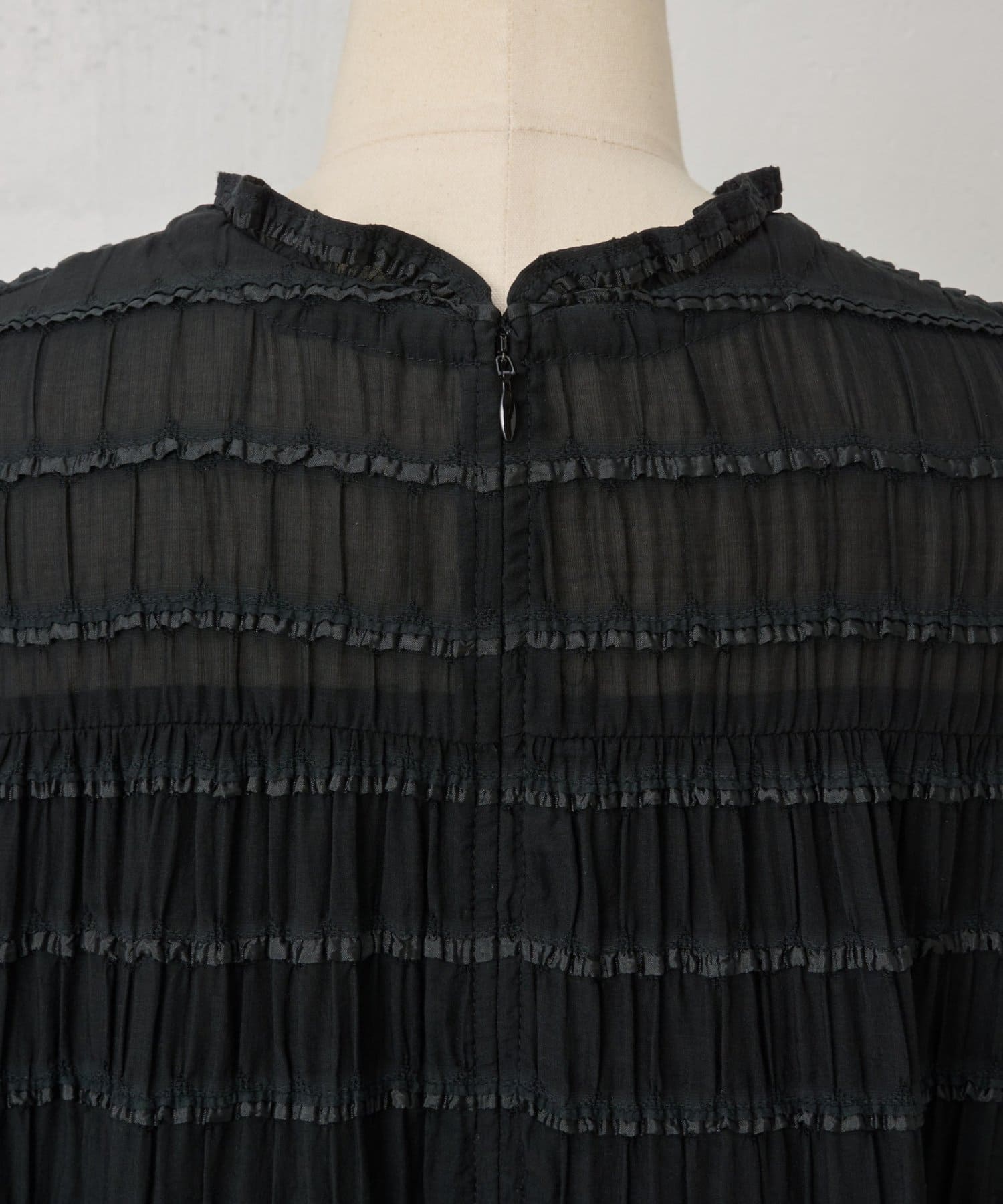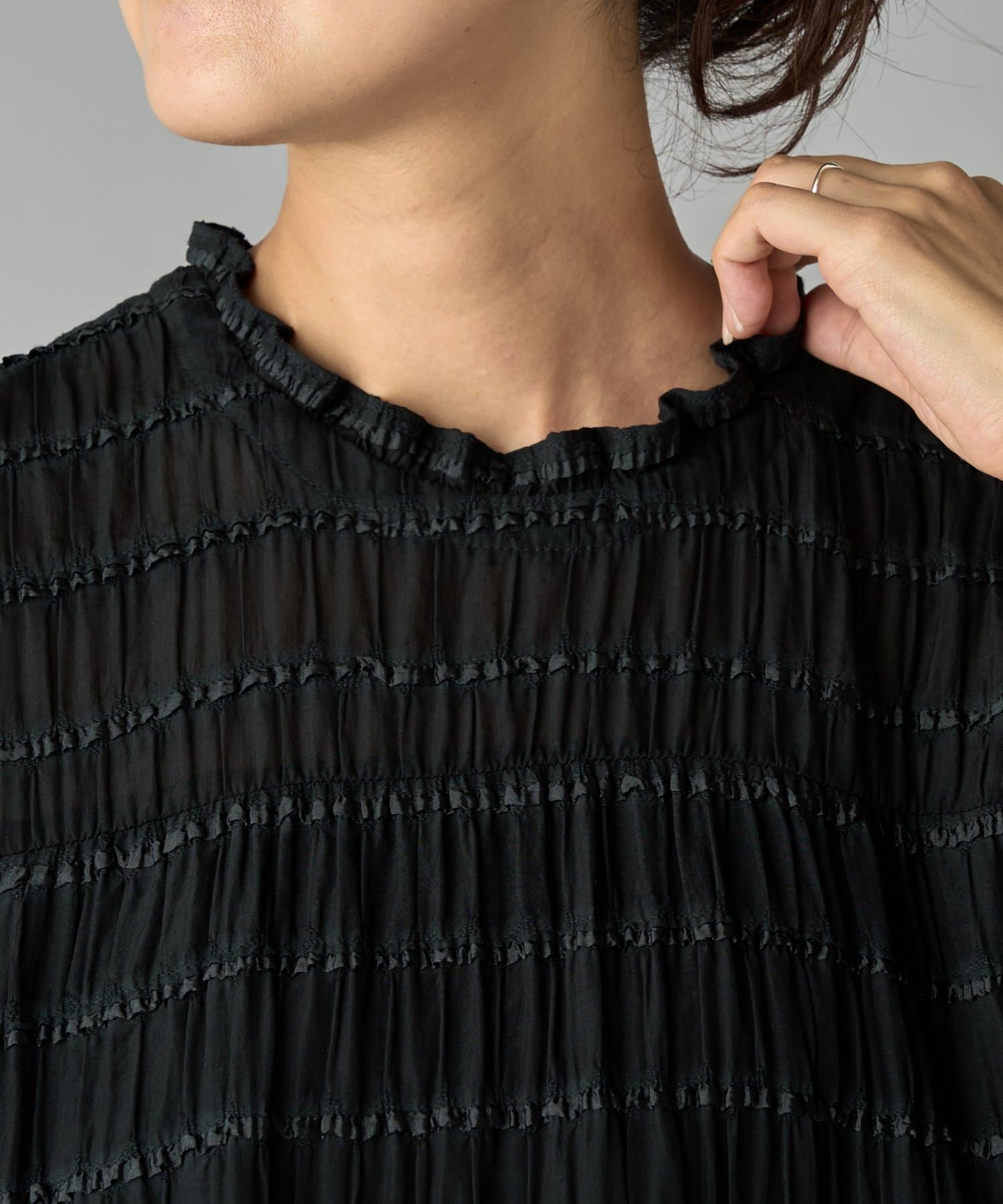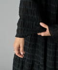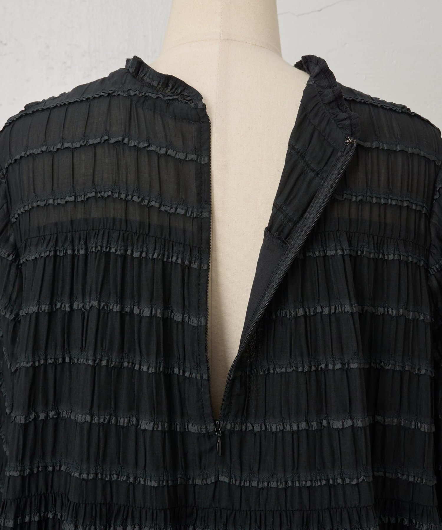袖口はシャーリングのゴム仕様。胸元から下の身頃には裏地付きで、肩部分にはほんのり透け感があります。