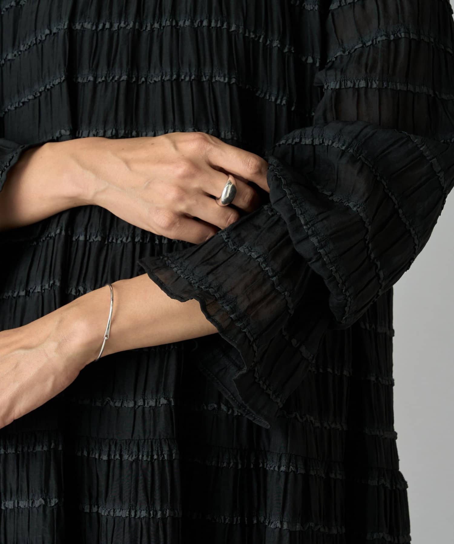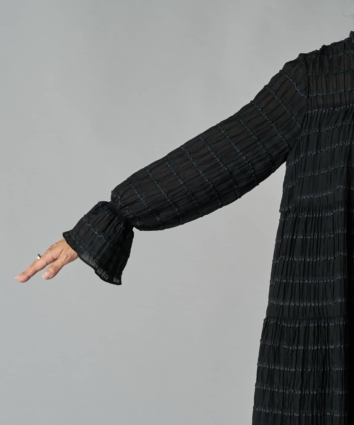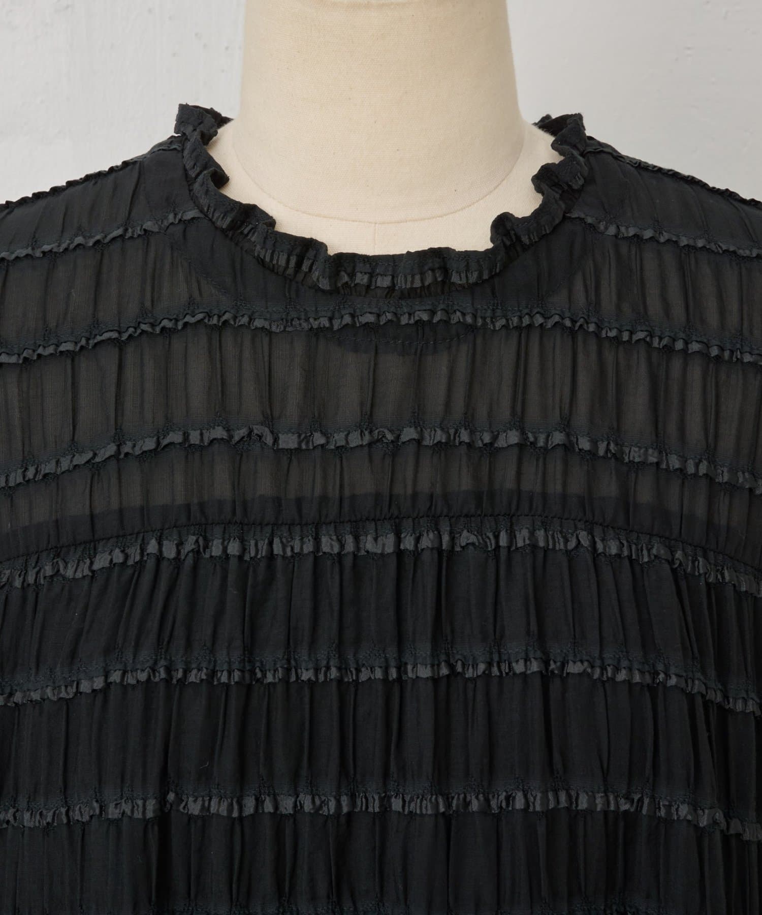 袖口はシャーリングのゴム仕様。胸元から下の身頃には裏地付きで、肩部分にはほんのり透け感があります。