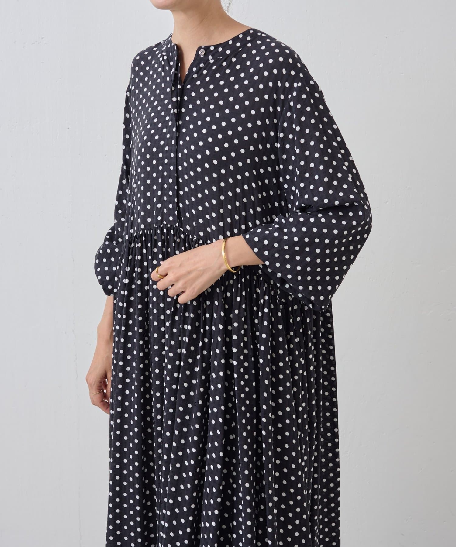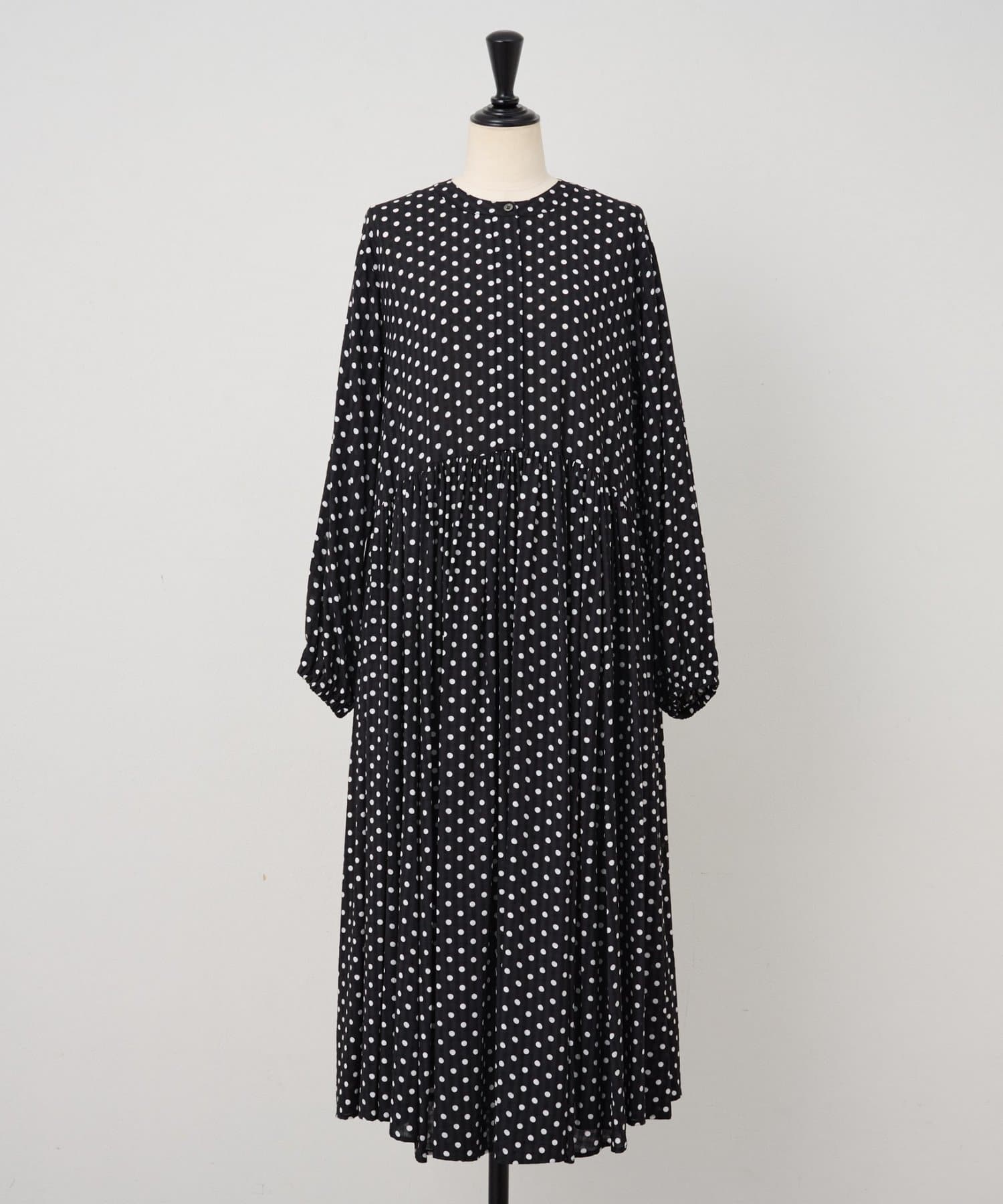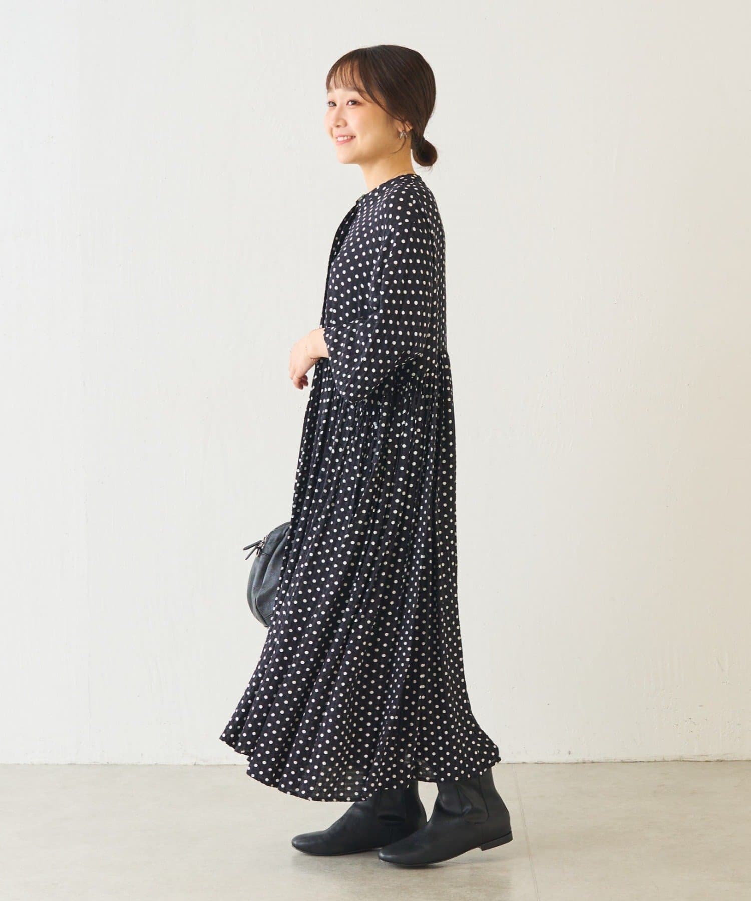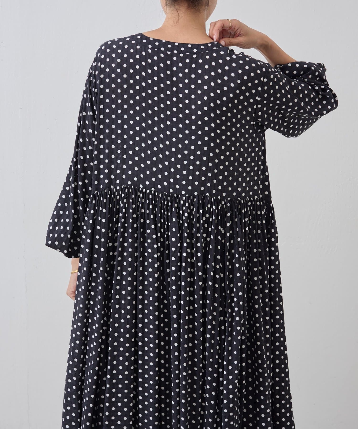 胸元をラウンドカットし、ギャザーをたっぷり寄せたロングワンピース。