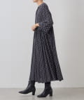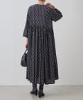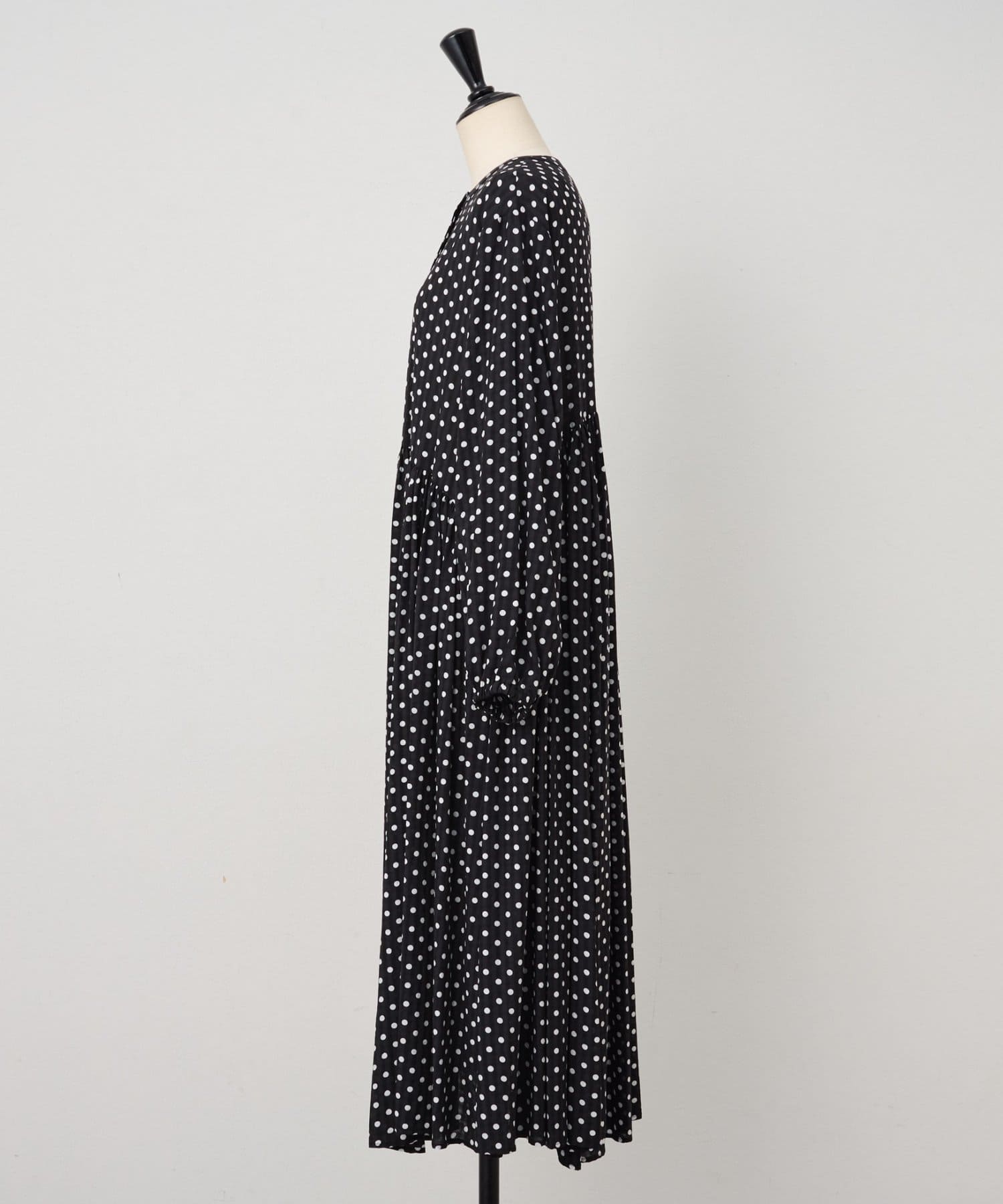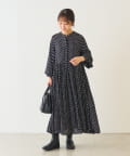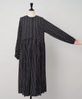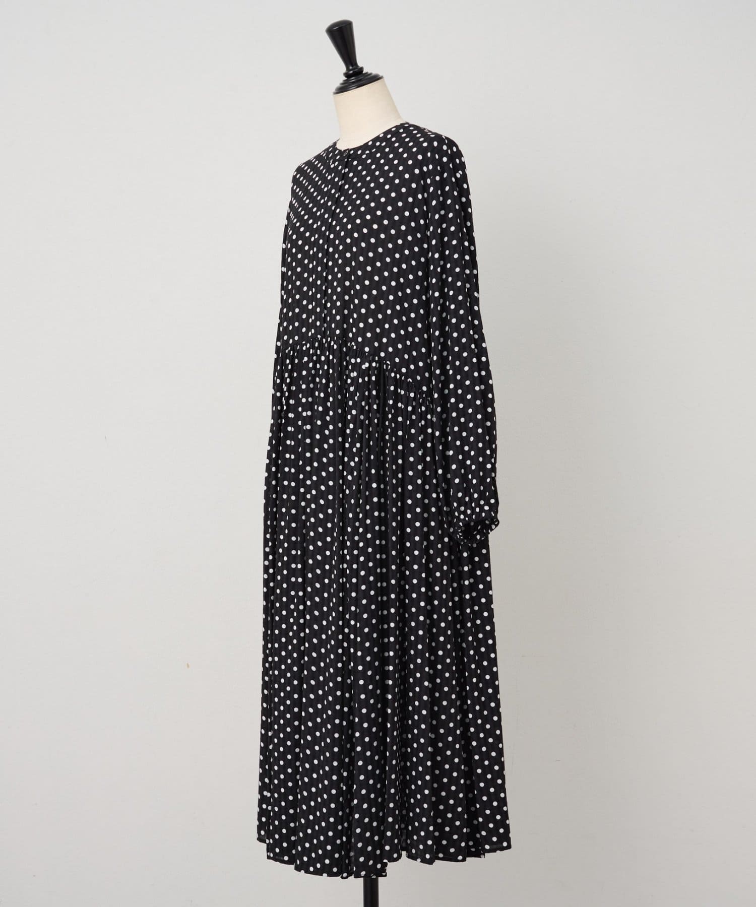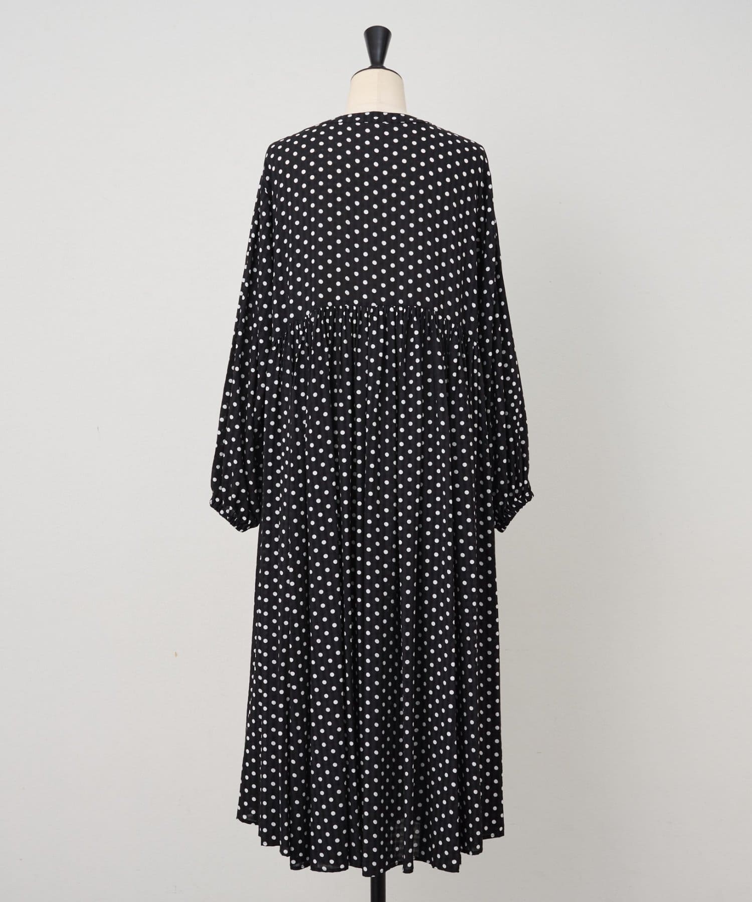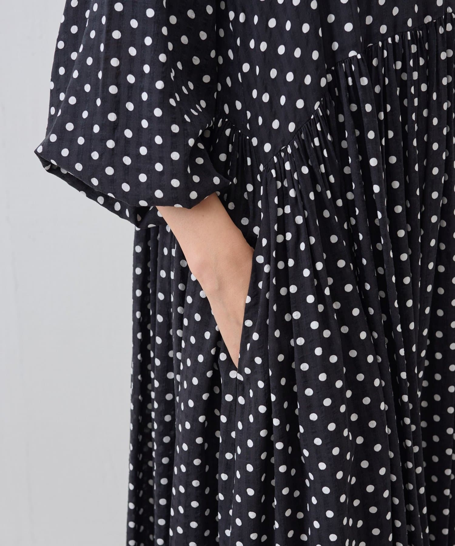 胸元をラウンドカットし、ギャザーをたっぷり寄せたロングワンピース。