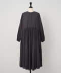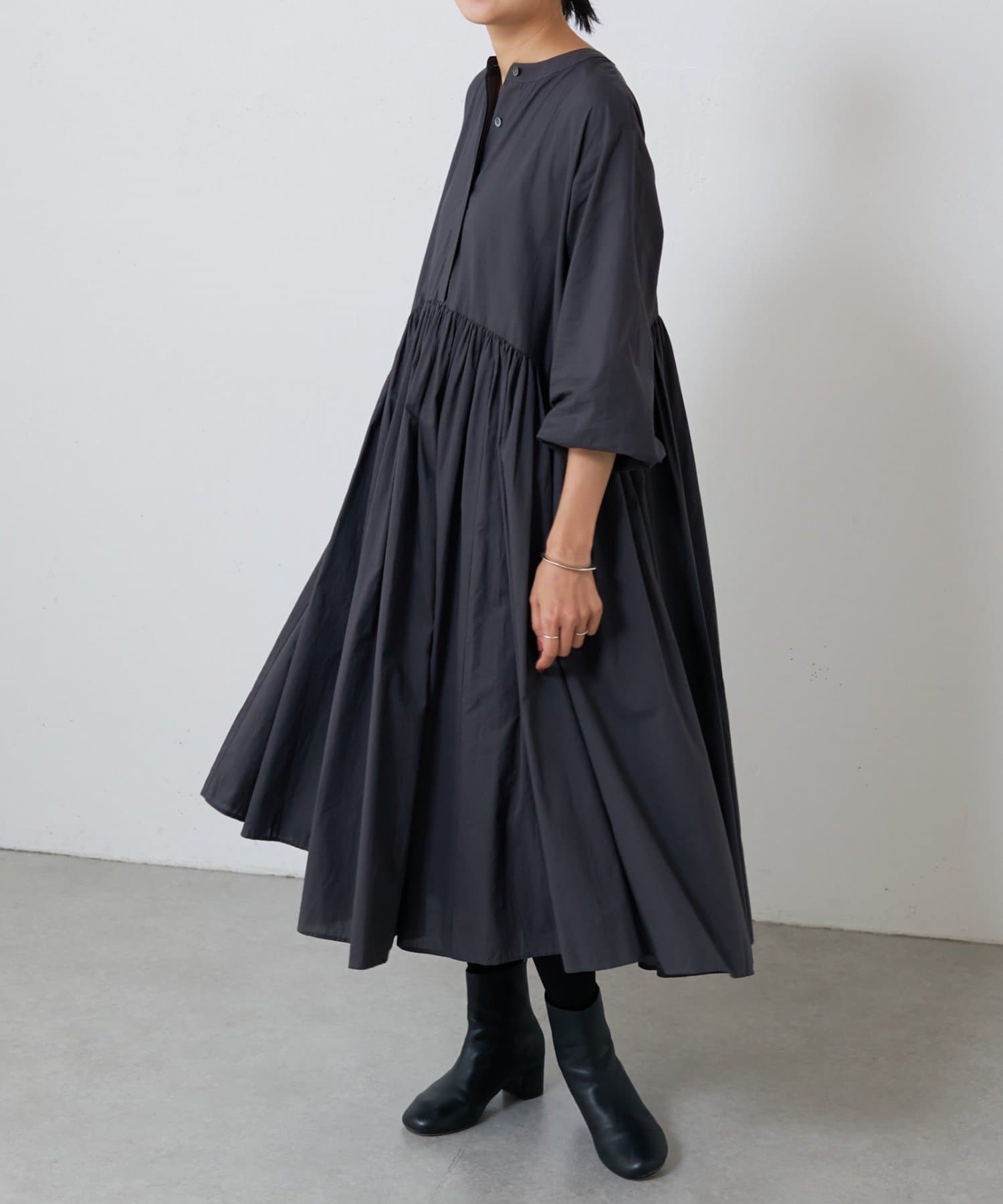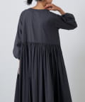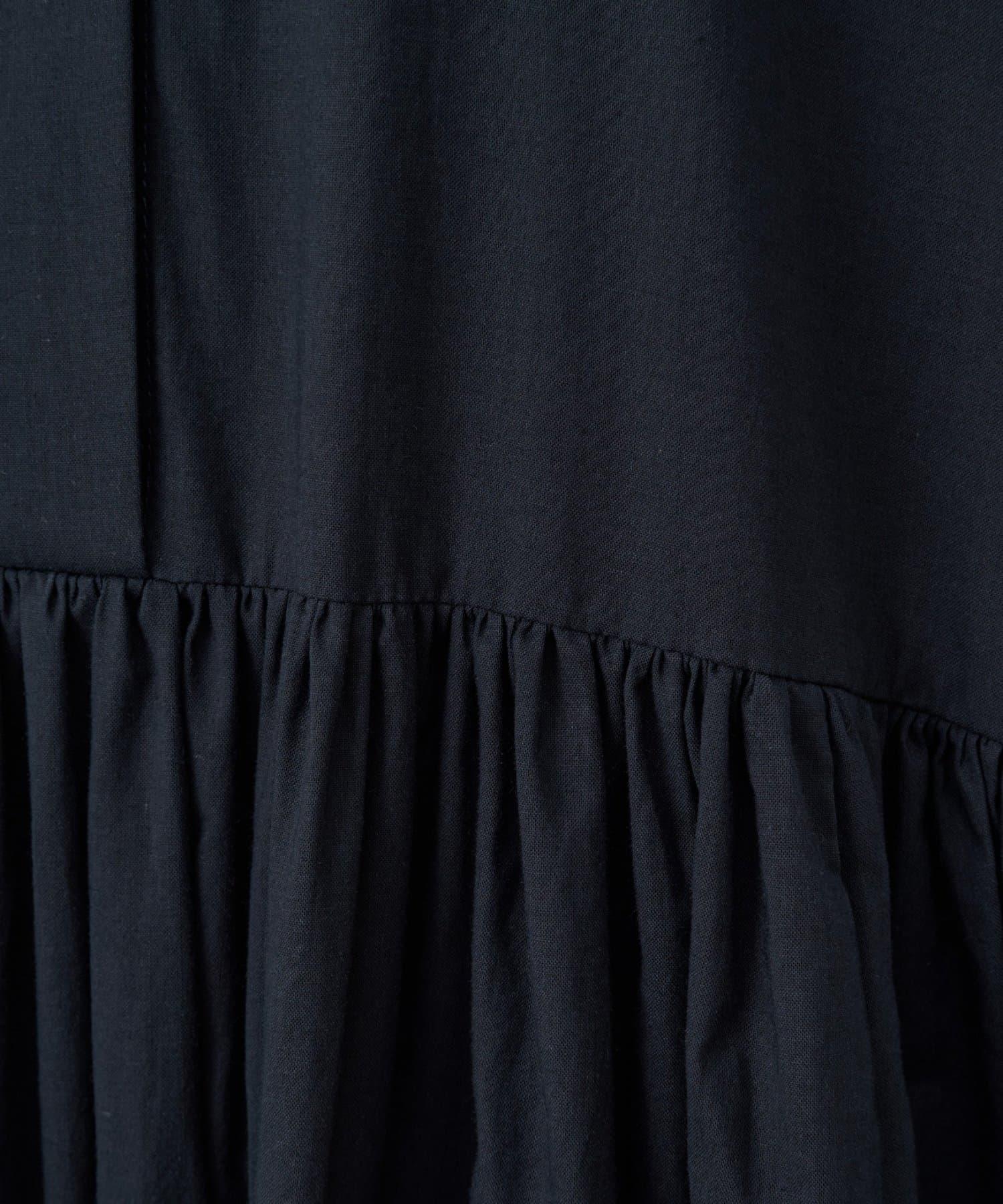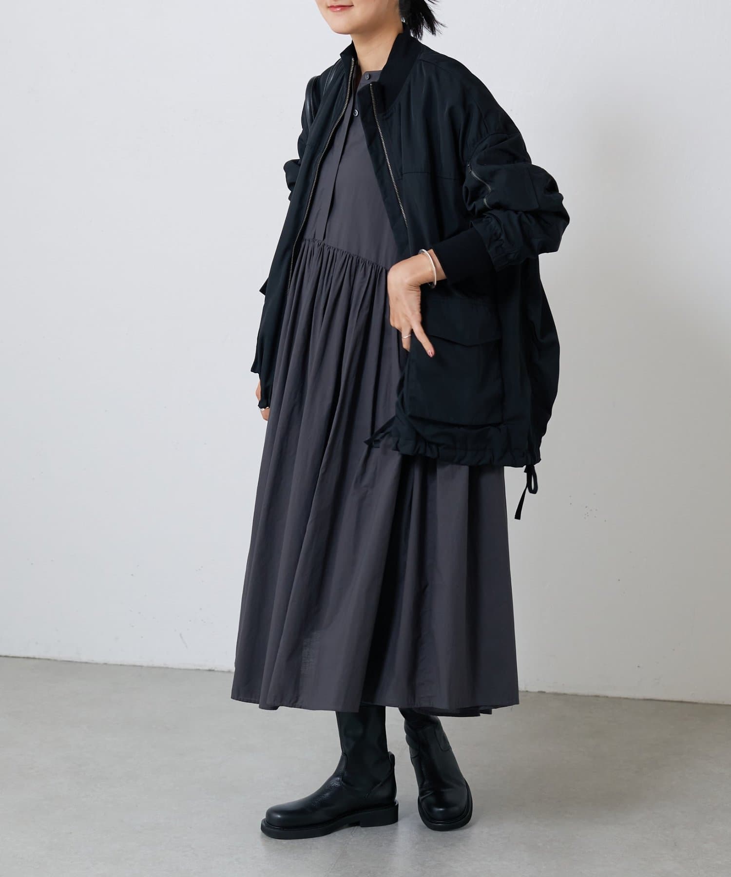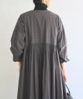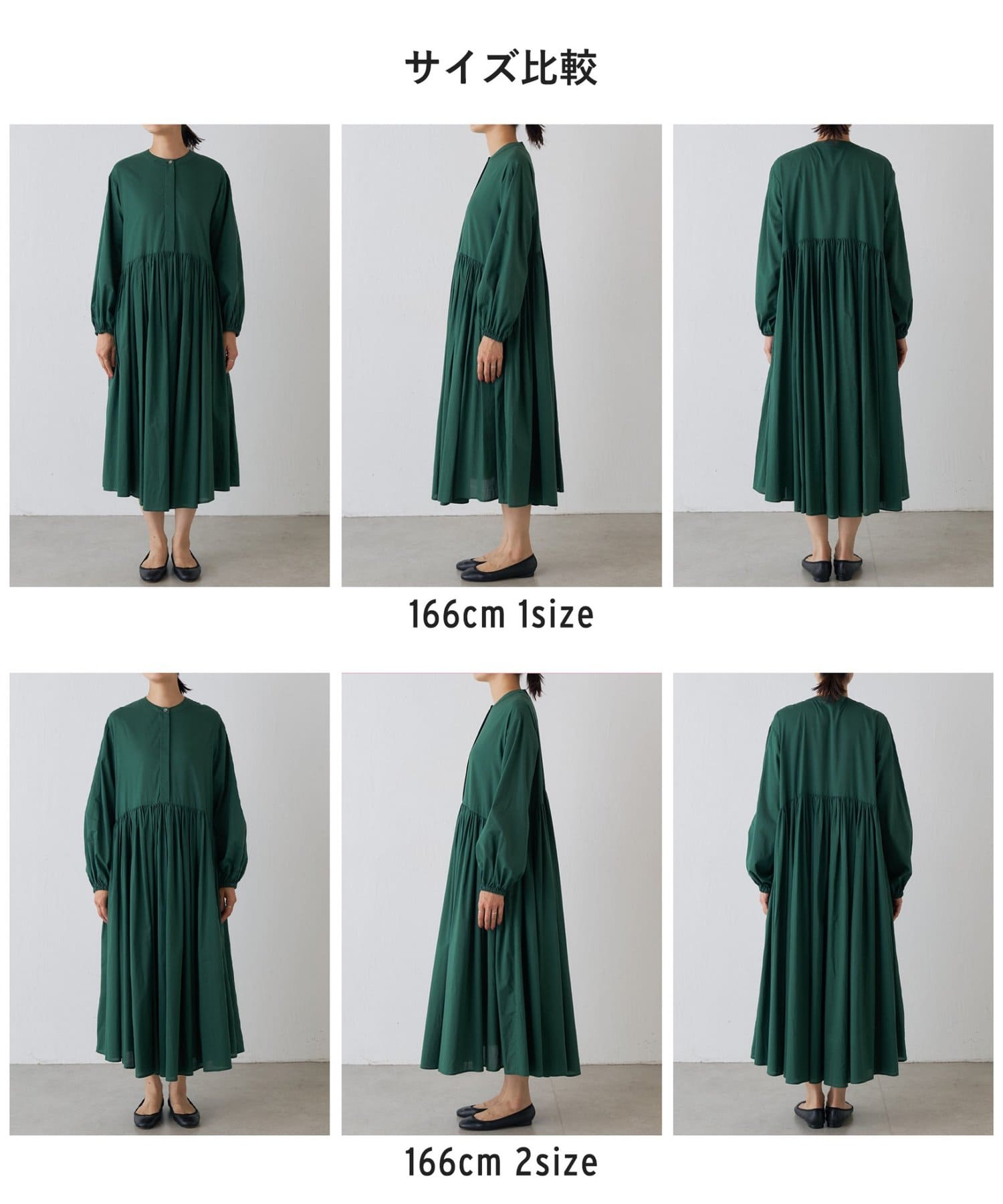 ・こちらの商品は、裾にたっぷりと生地を用いた分量感がデザインポイントになります。多量の生地を使用しており、重力と相まって他の製品・デザインより伸びやすい傾向にある為、着丈等サイズは2%前後を許容範囲とさせて頂きます。
