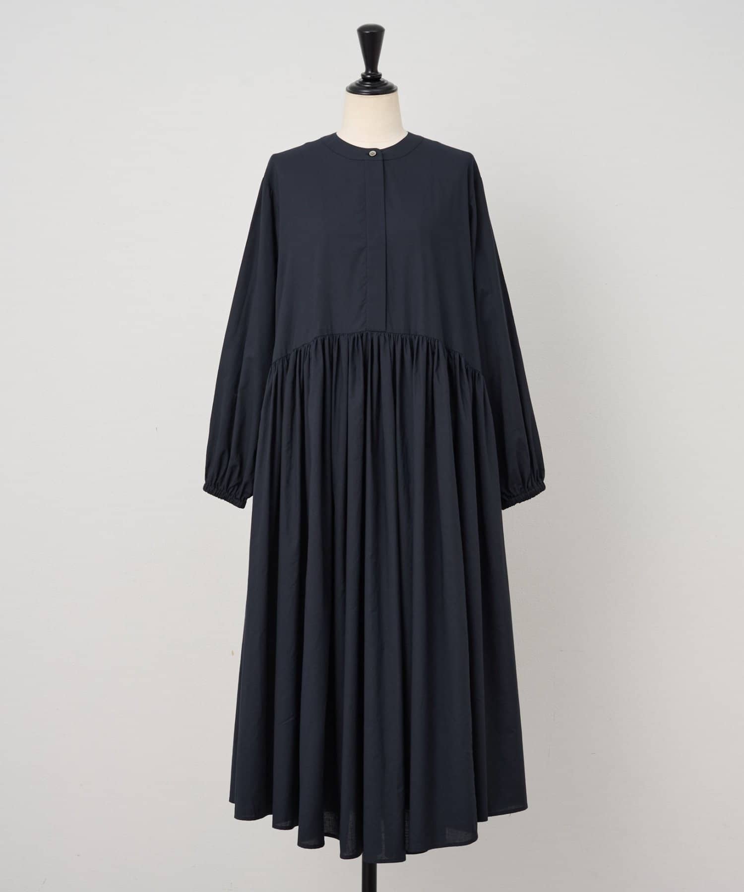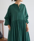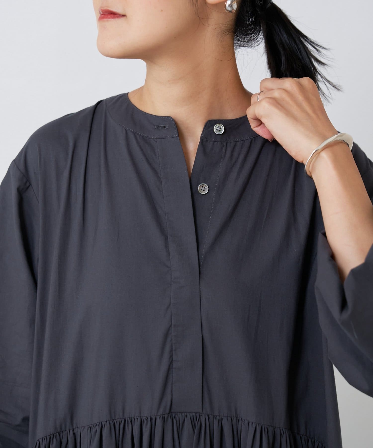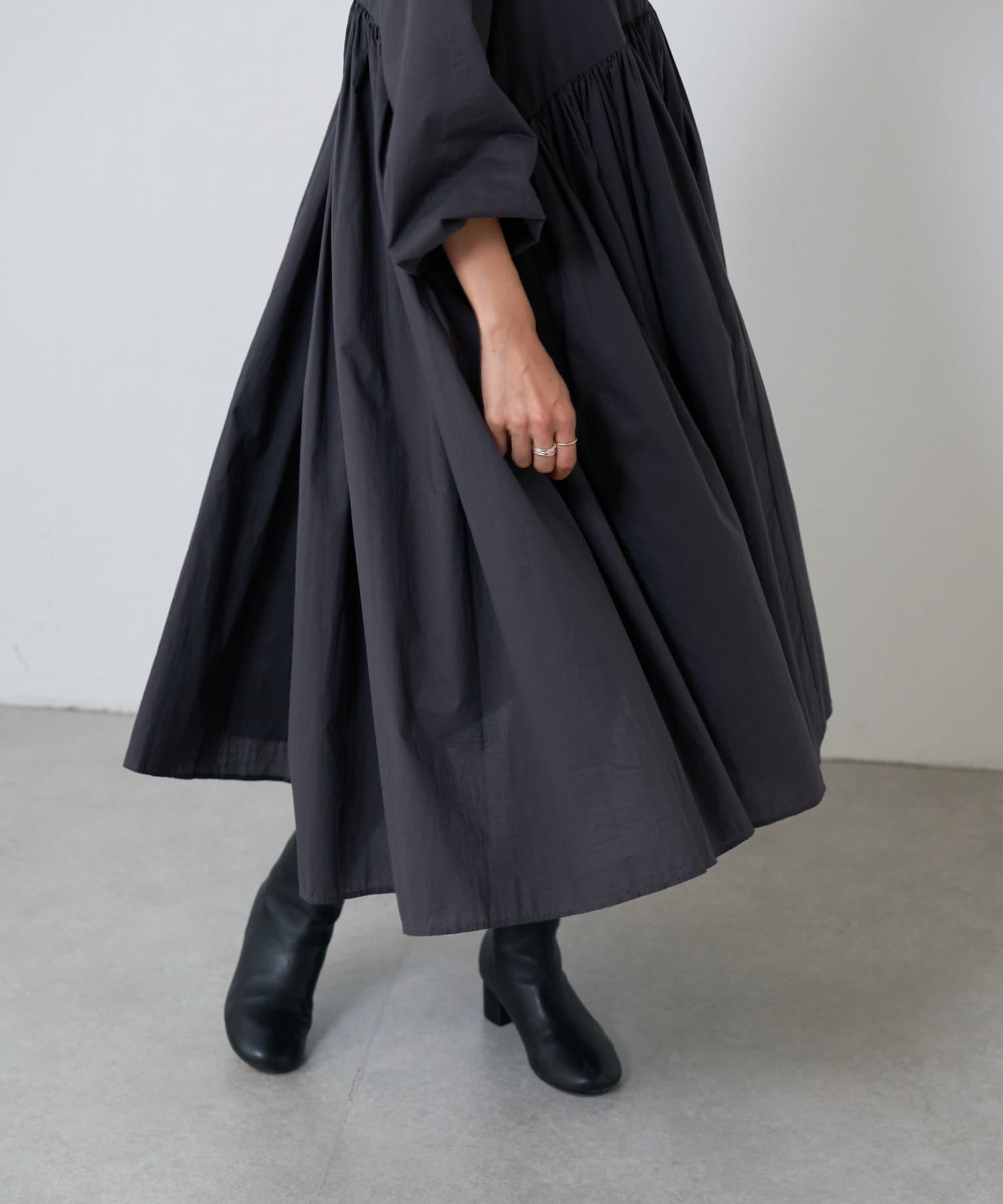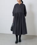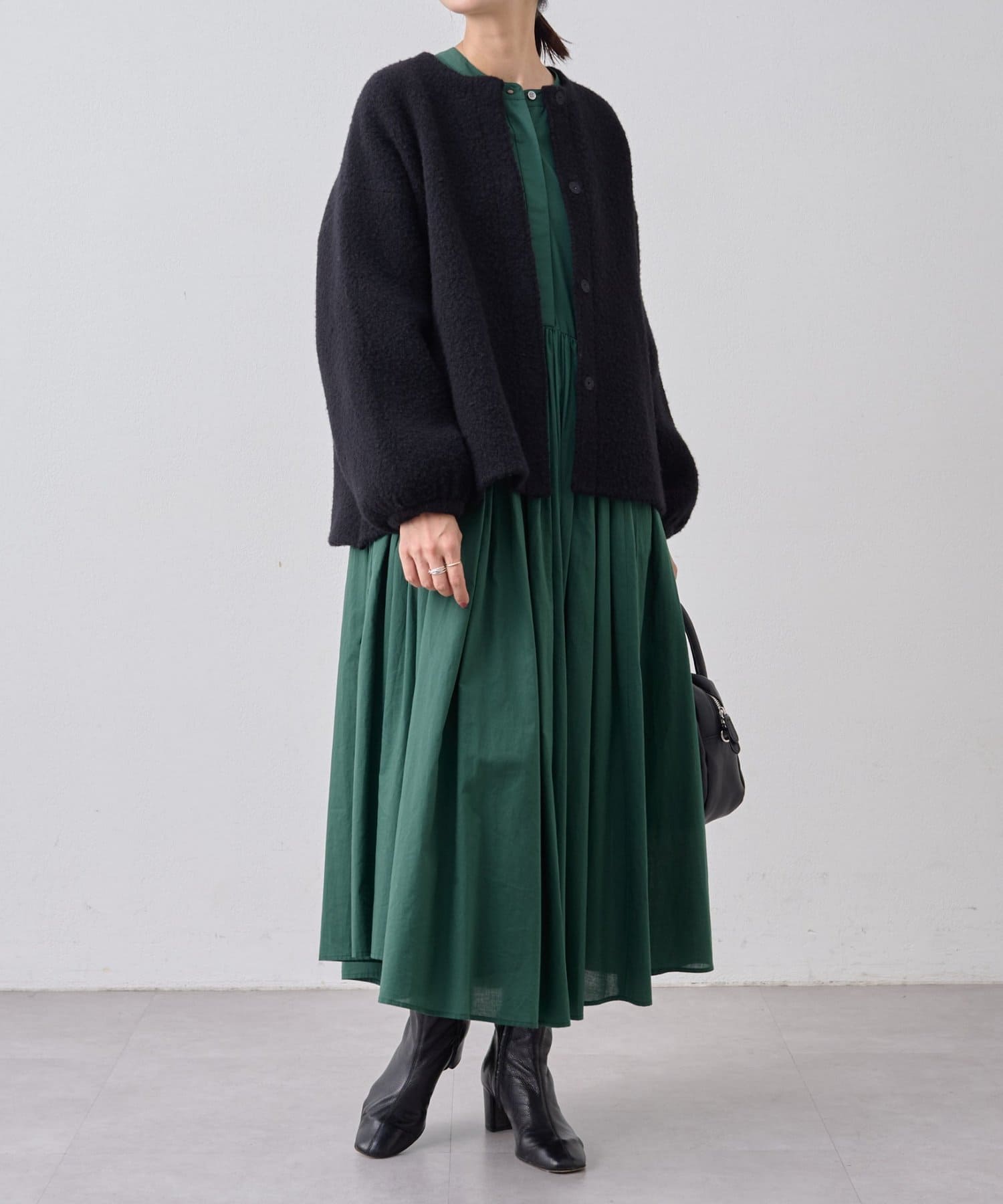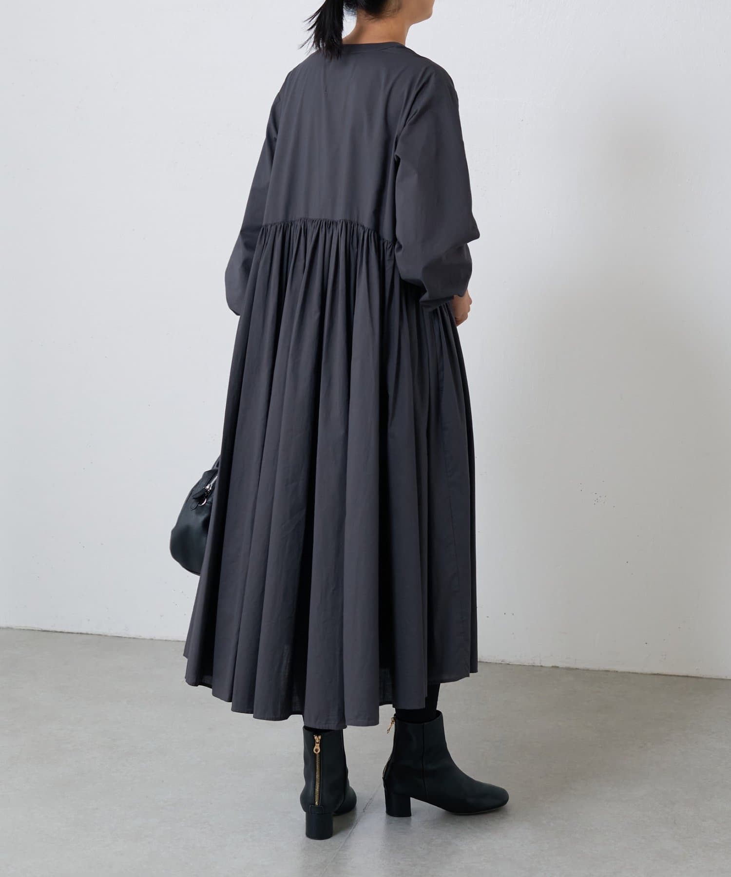 ・こちらの商品は、裾にたっぷりと生地を用いた分量感がデザインポイントになります。多量の生地を使用しており、重力と相まって他の製品・デザインより伸びやすい傾向にある為、着丈等サイズは2%前後を許容範囲とさせて頂きます。