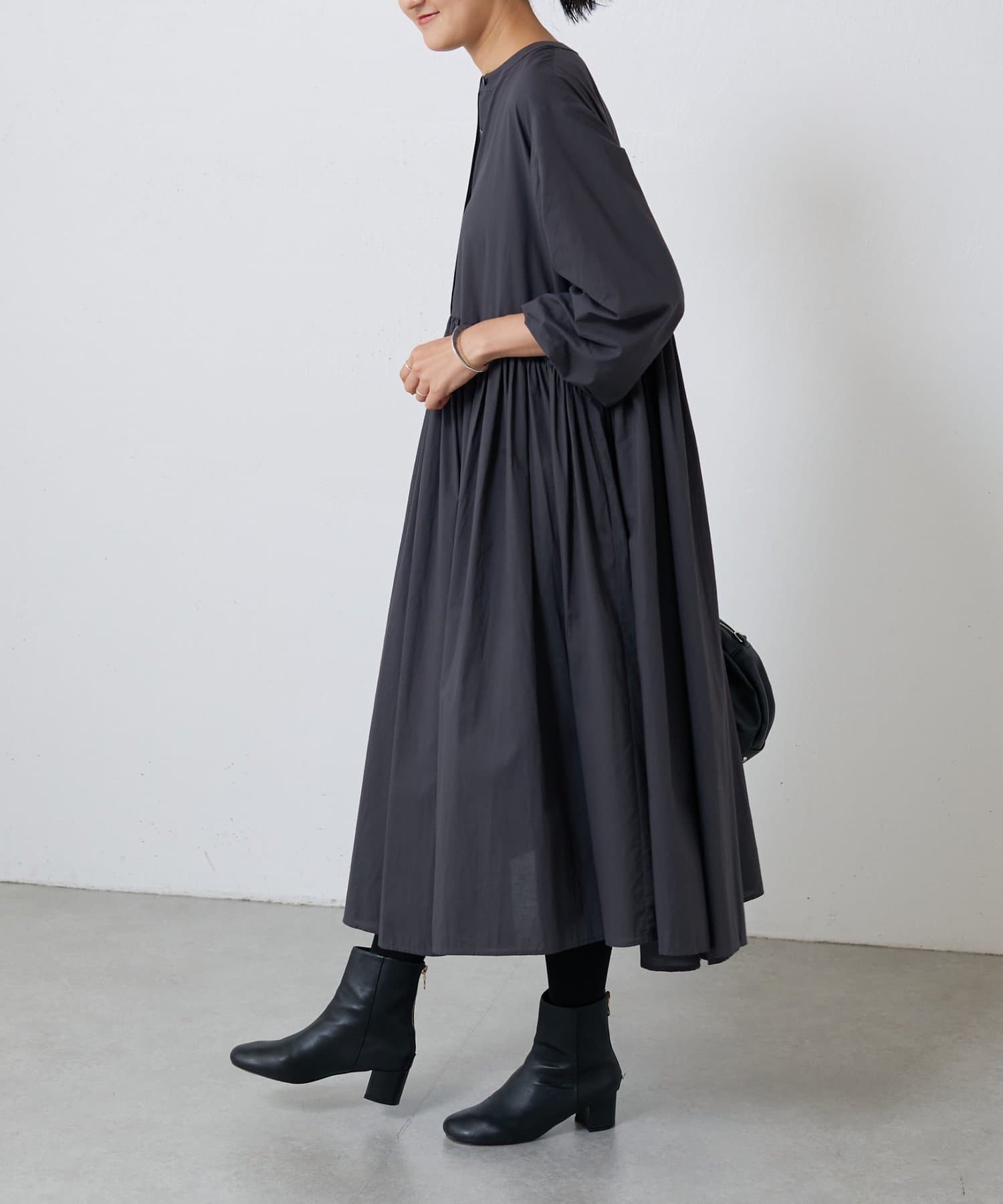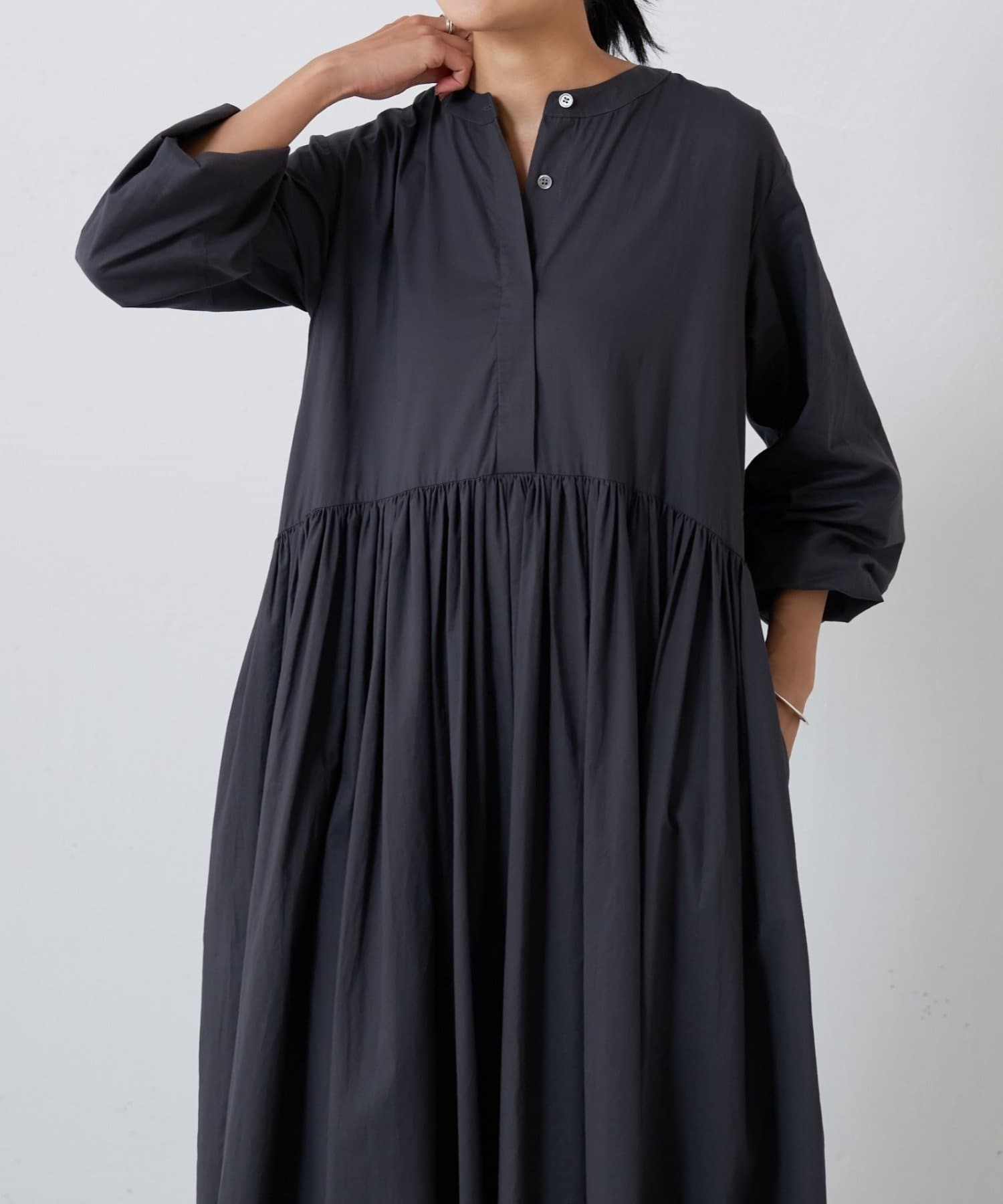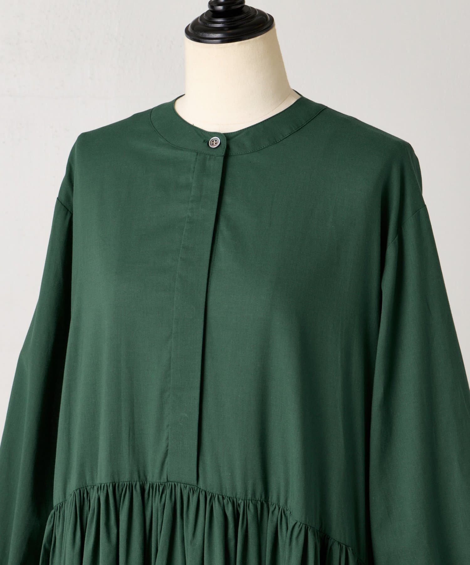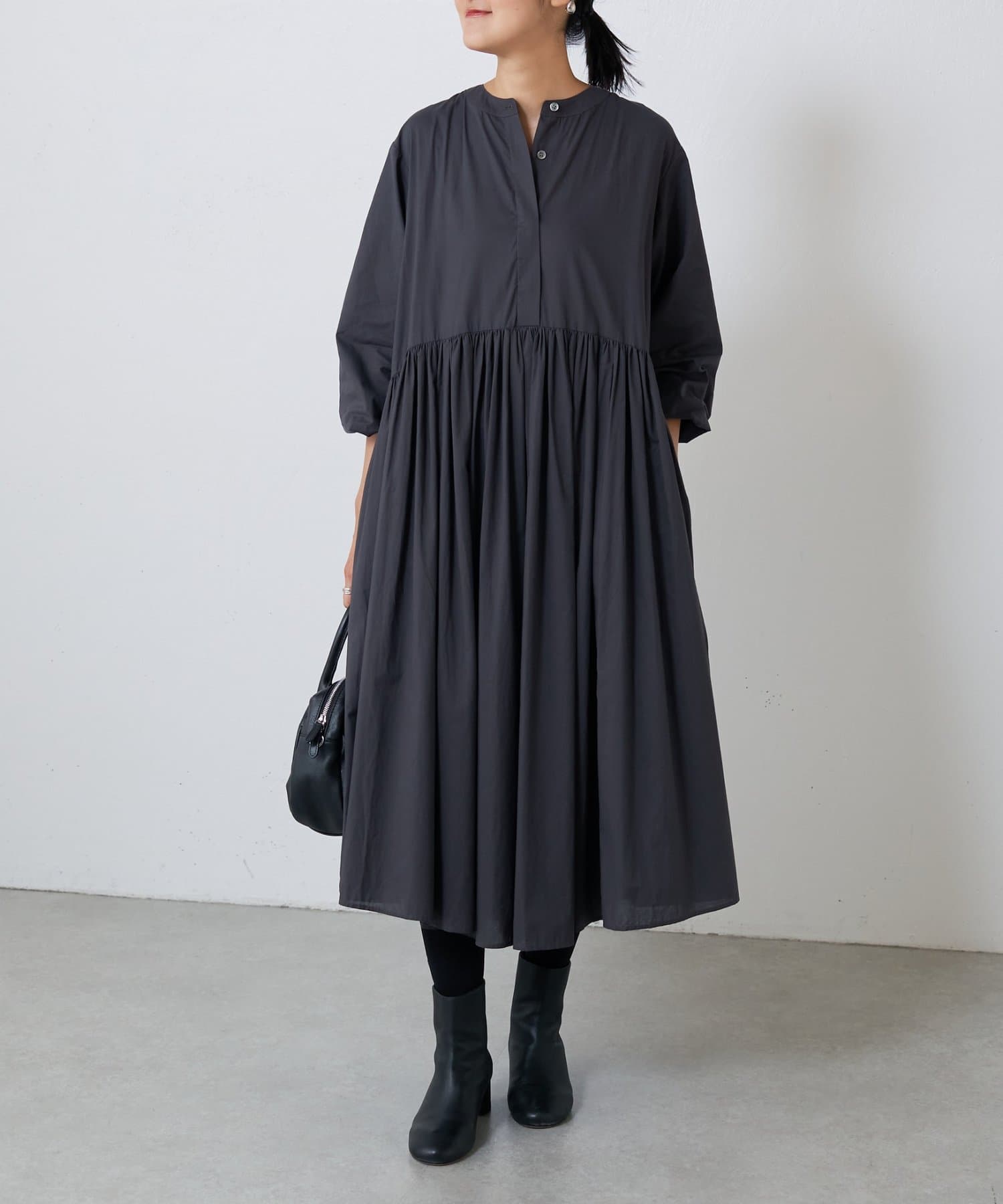 ・こちらの商品は、裾にたっぷりと生地を用いた分量感がデザインポイントになります。多量の生地を使用しており、重力と相まって他の製品・デザインより伸びやすい傾向にある為、着丈等サイズは2%前後を許容範囲とさせて頂きます。