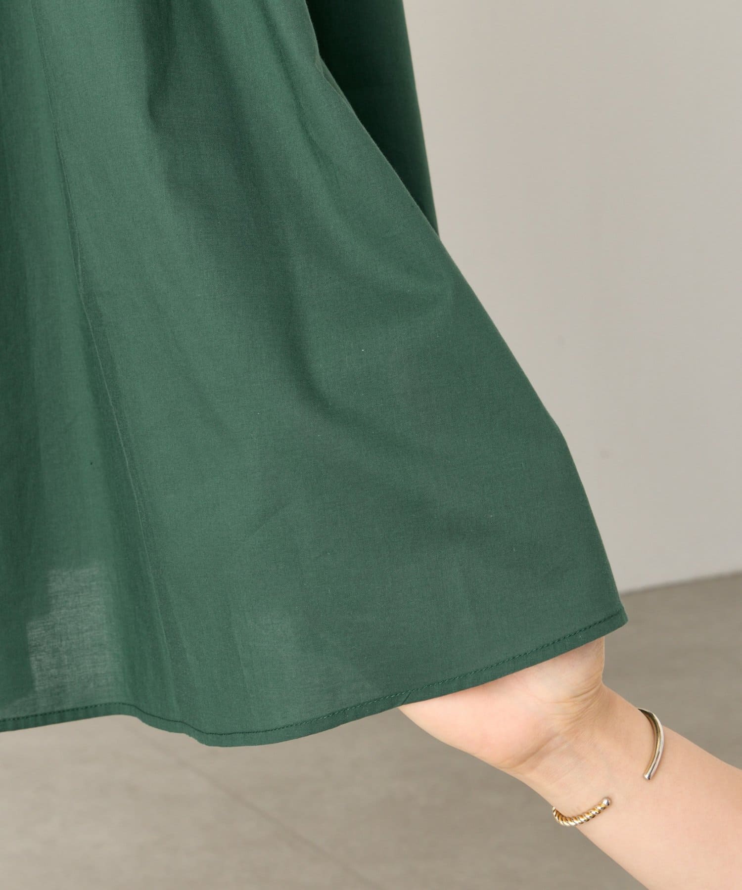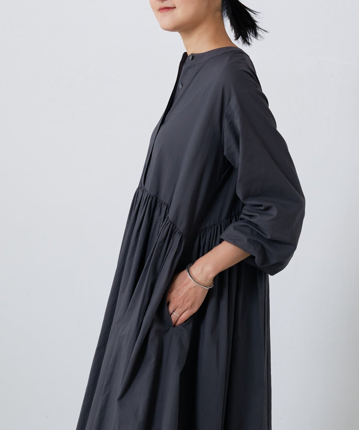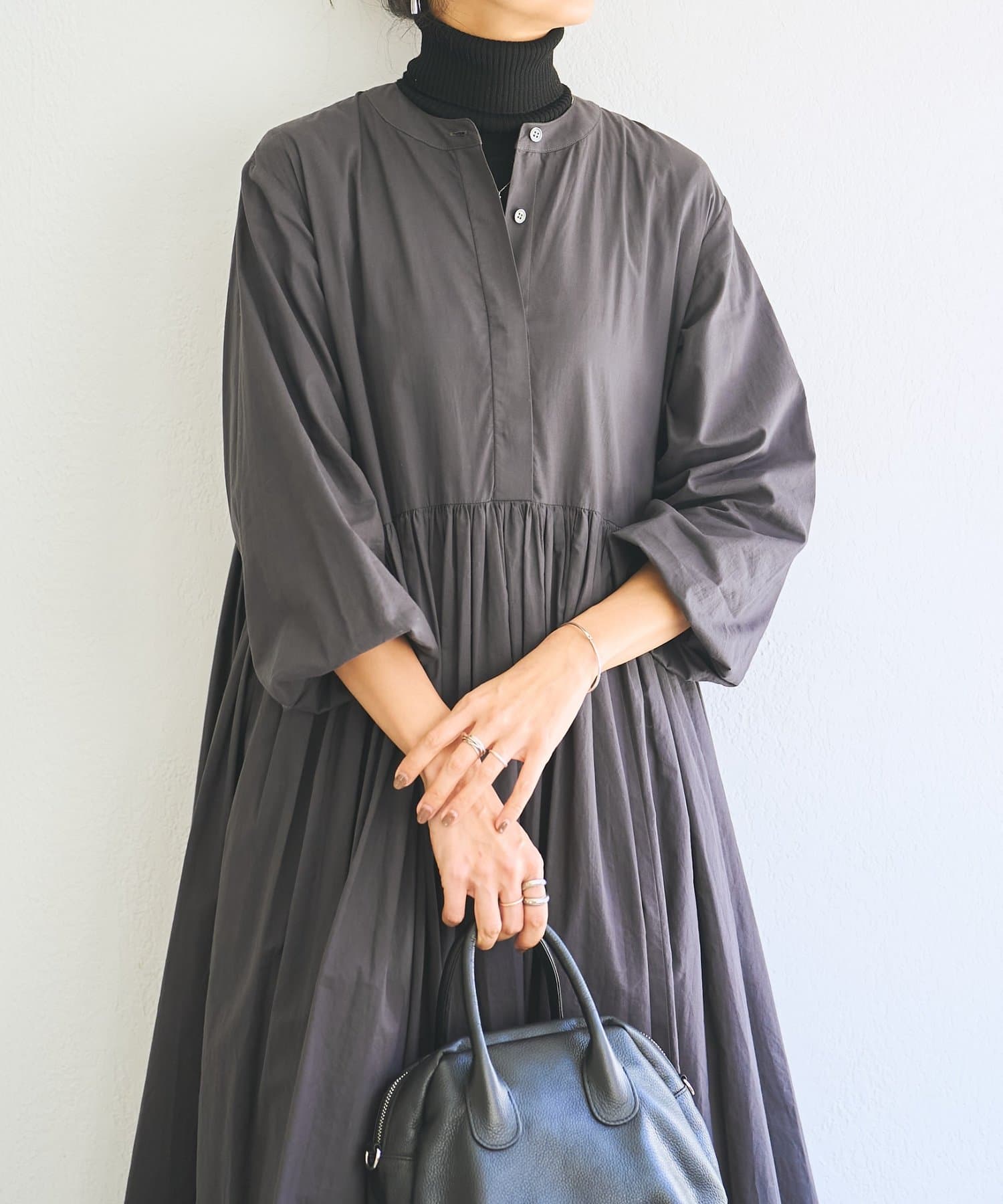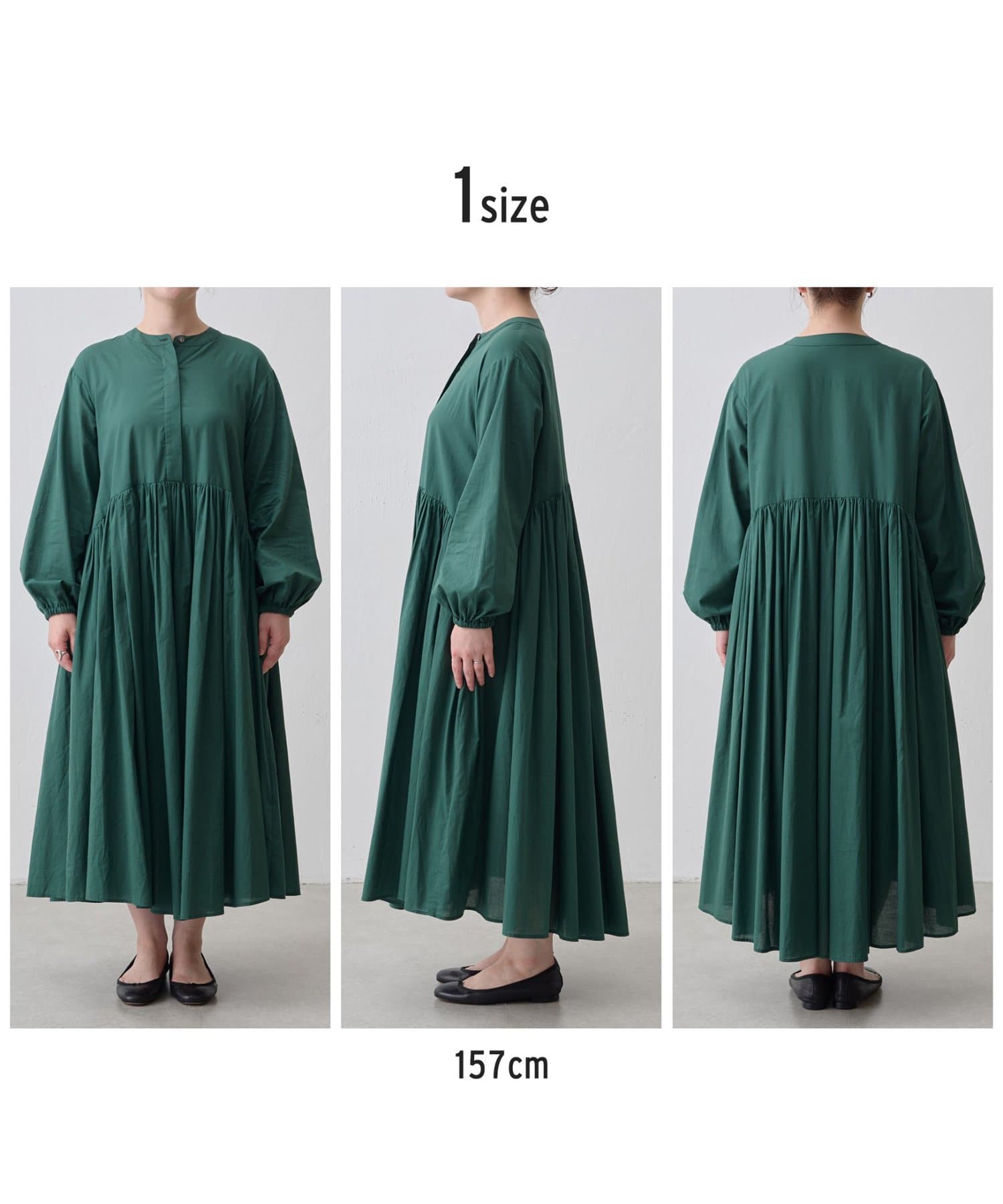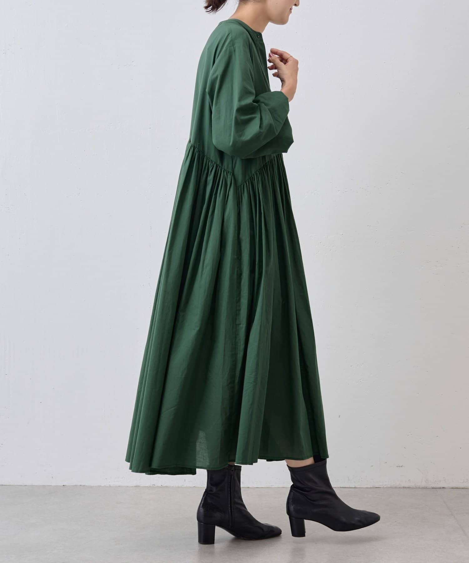 ・こちらの商品は、裾にたっぷりと生地を用いた分量感がデザインポイントになります。多量の生地を使用しており、重力と相まって他の製品・デザインより伸びやすい傾向にある為、着丈等サイズは2%前後を許容範囲とさせて頂きます。