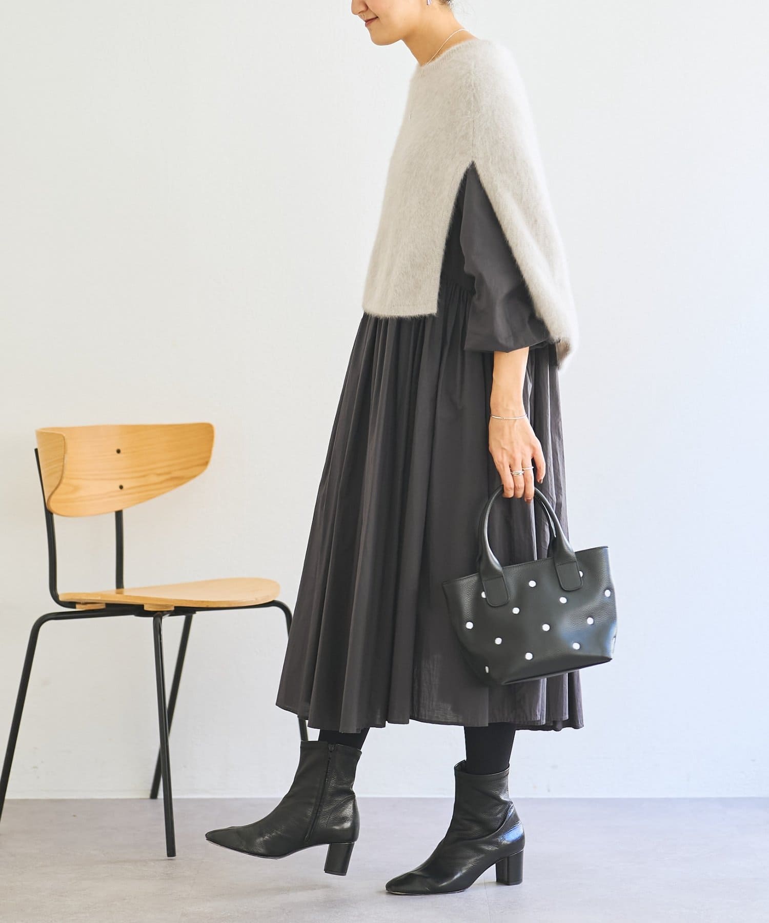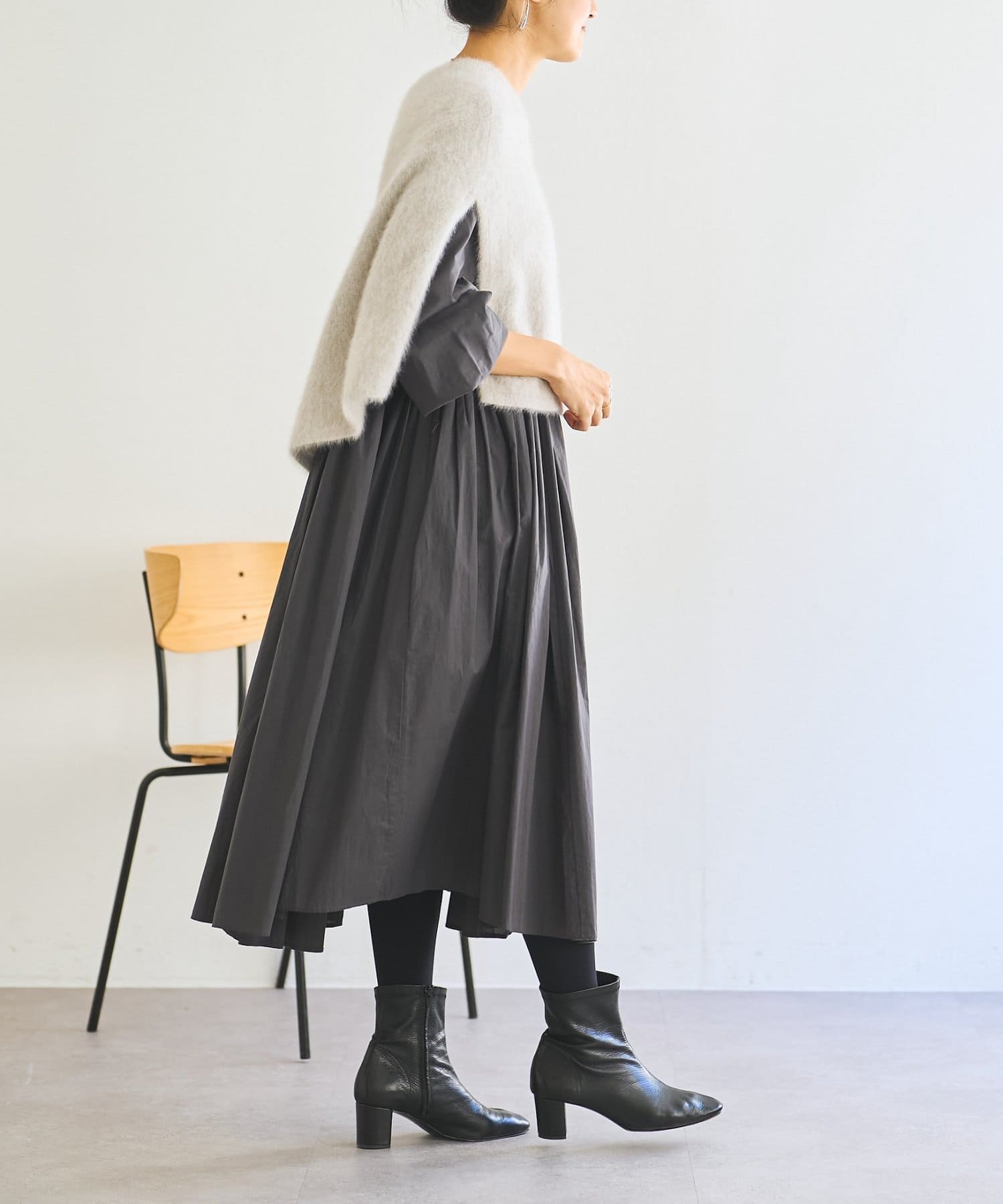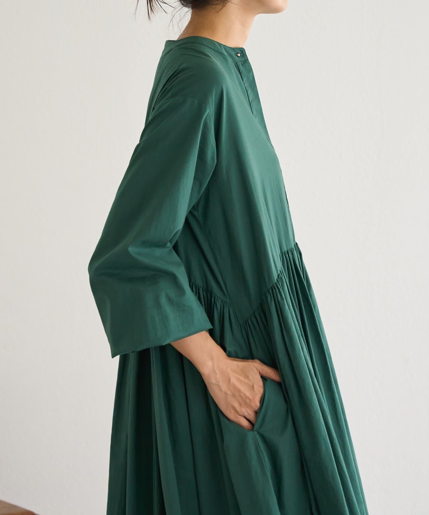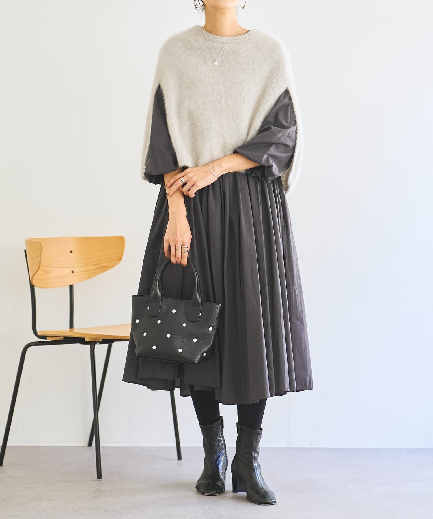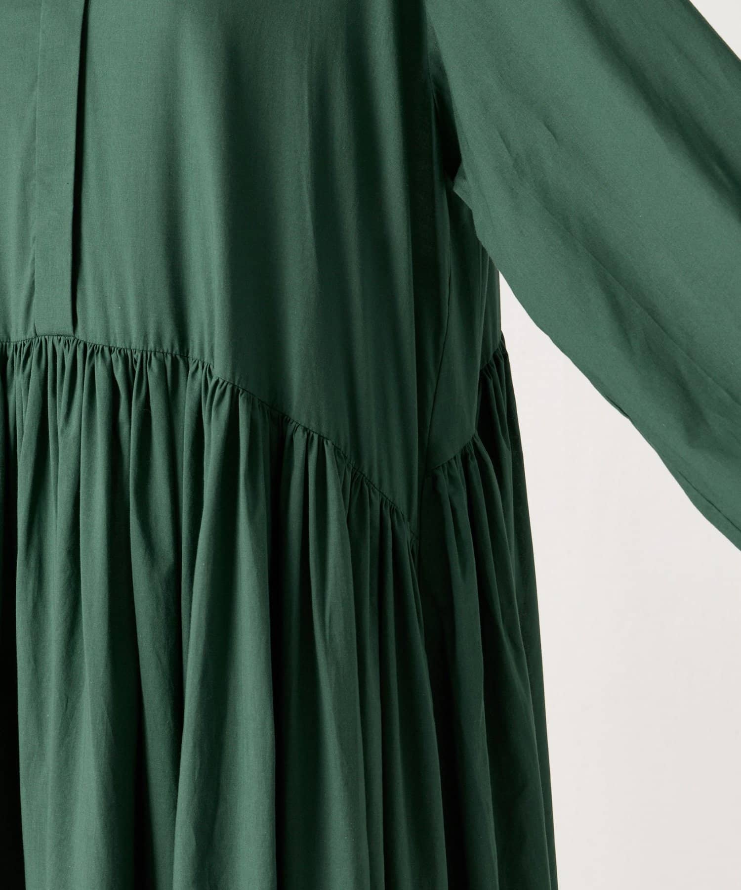 ・こちらの商品は、裾にたっぷりと生地を用いた分量感がデザインポイントになります。多量の生地を使用しており、重力と相まって他の製品・デザインより伸びやすい傾向にある為、着丈等サイズは2%前後を許容範囲とさせて頂きます。