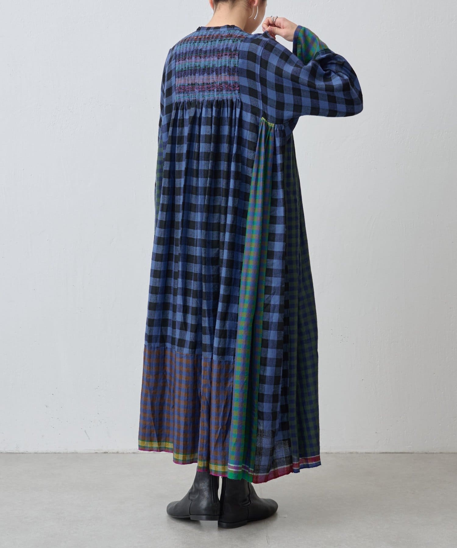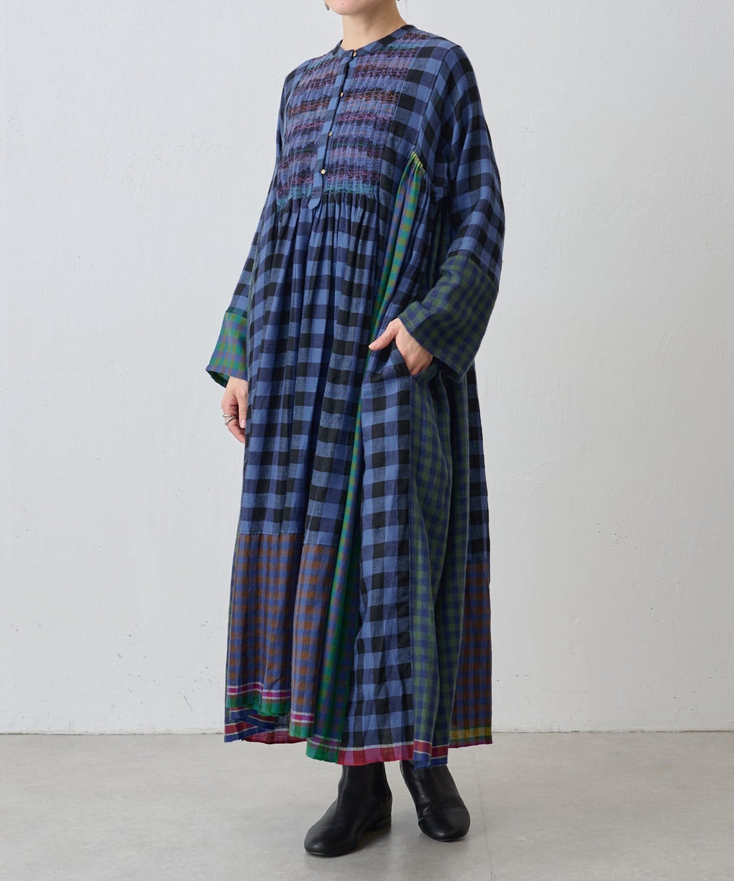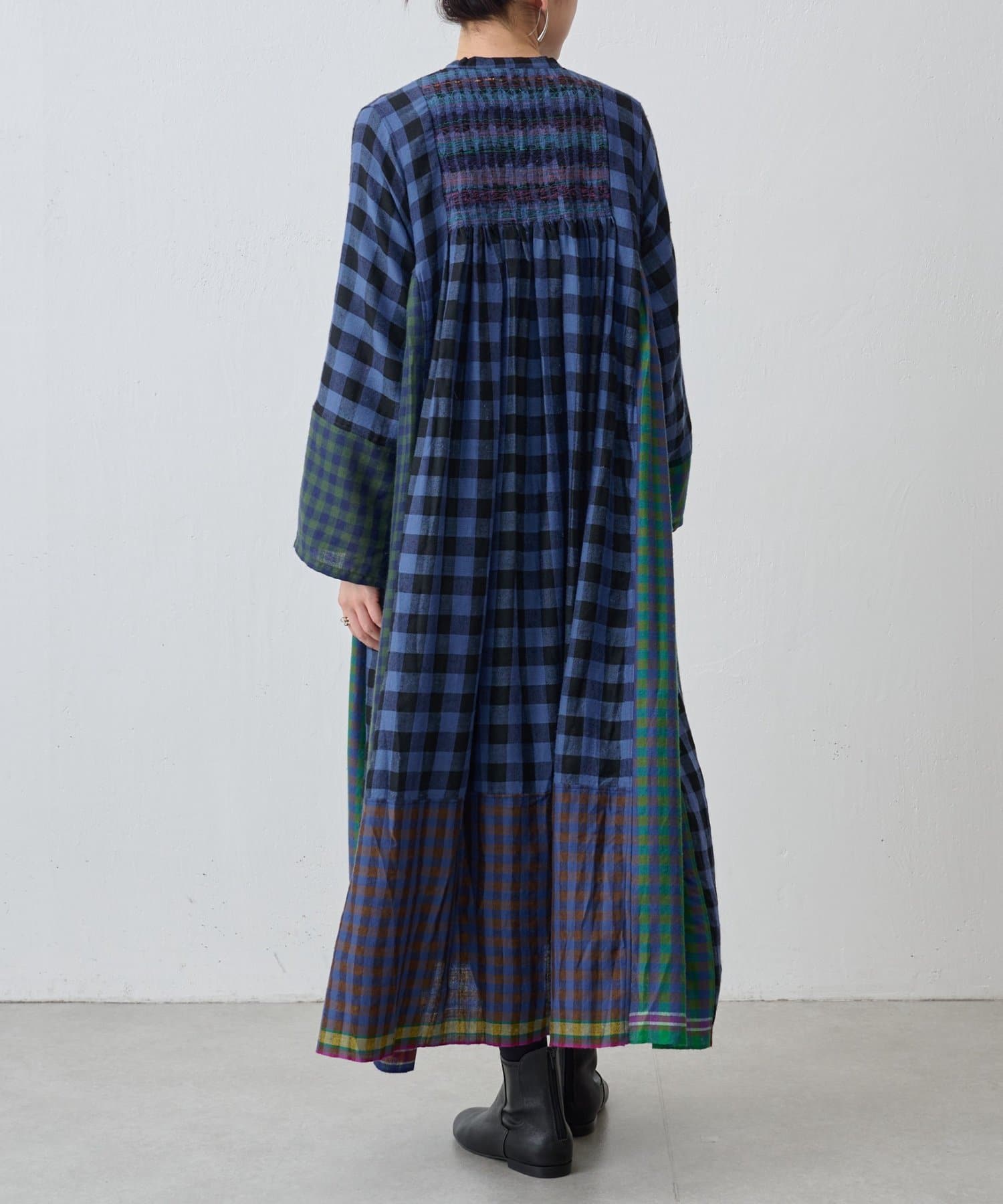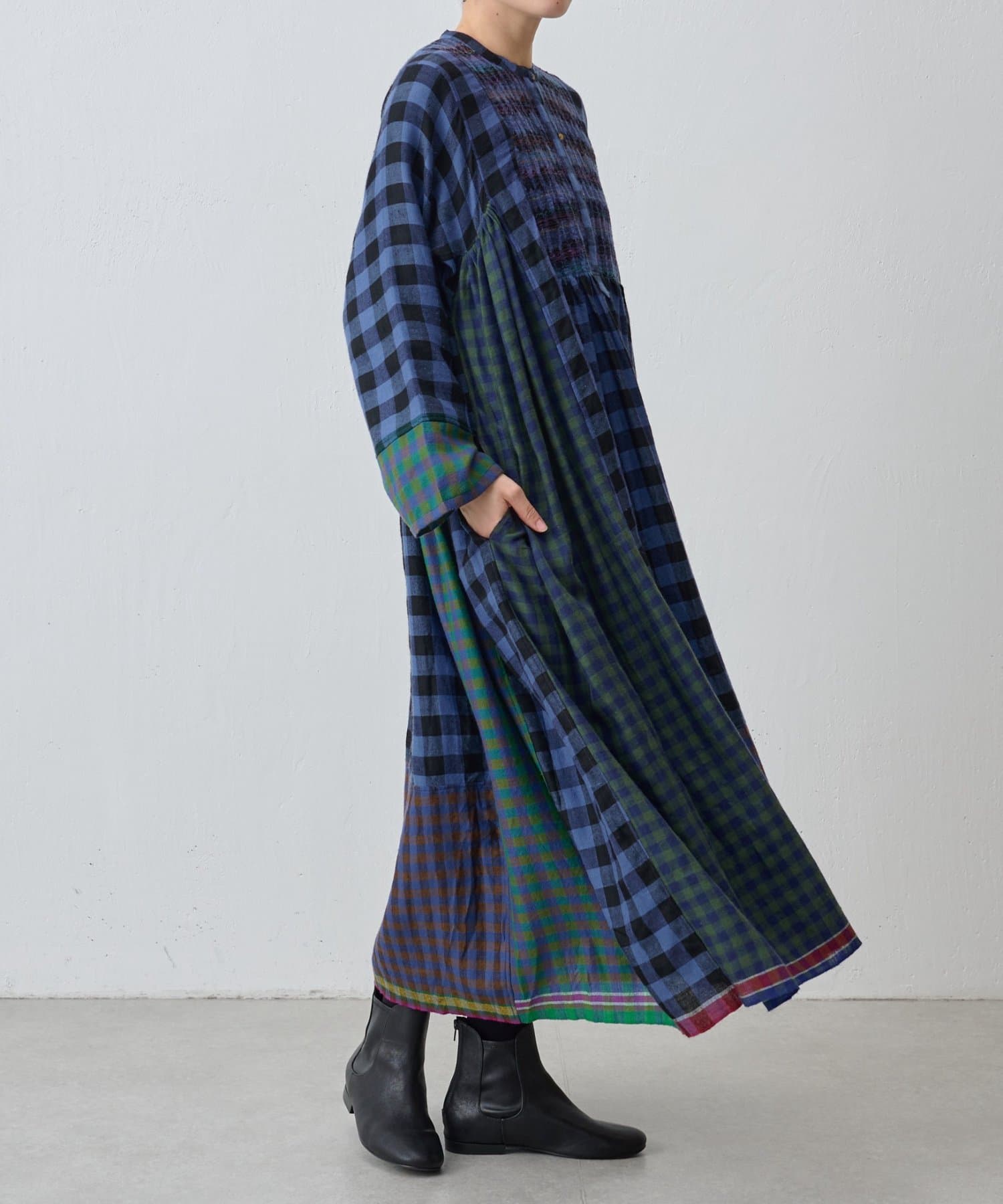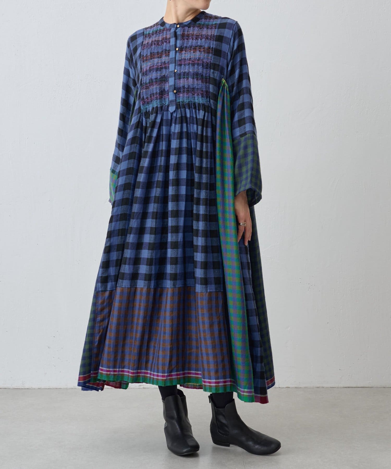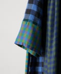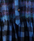 様々なカラーのブロックチェック生地を組み合わせたシャツワンピース。