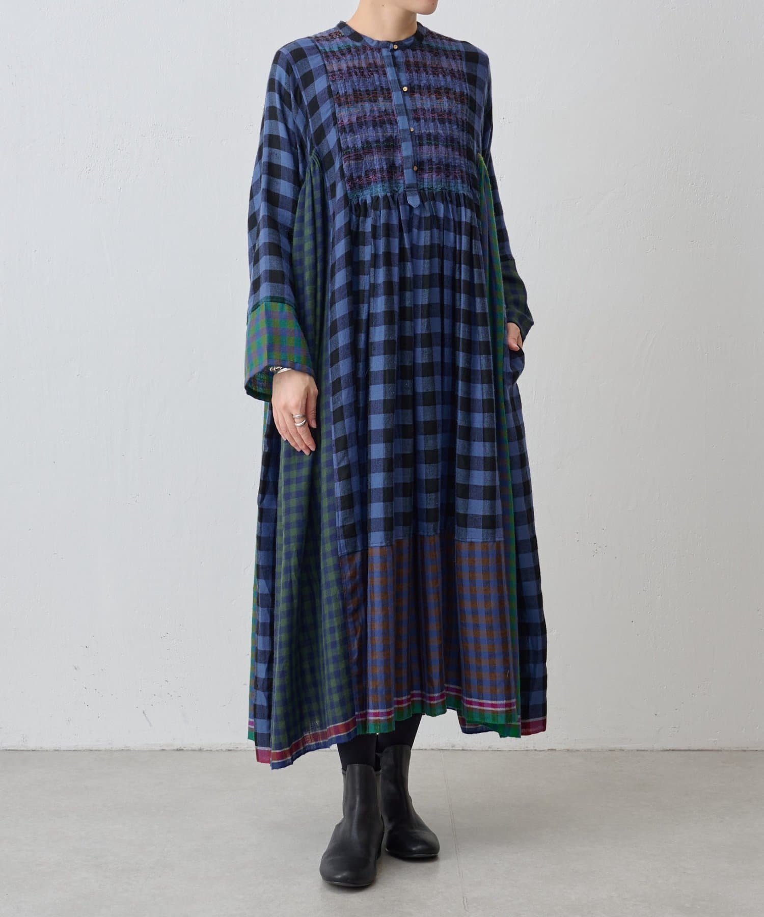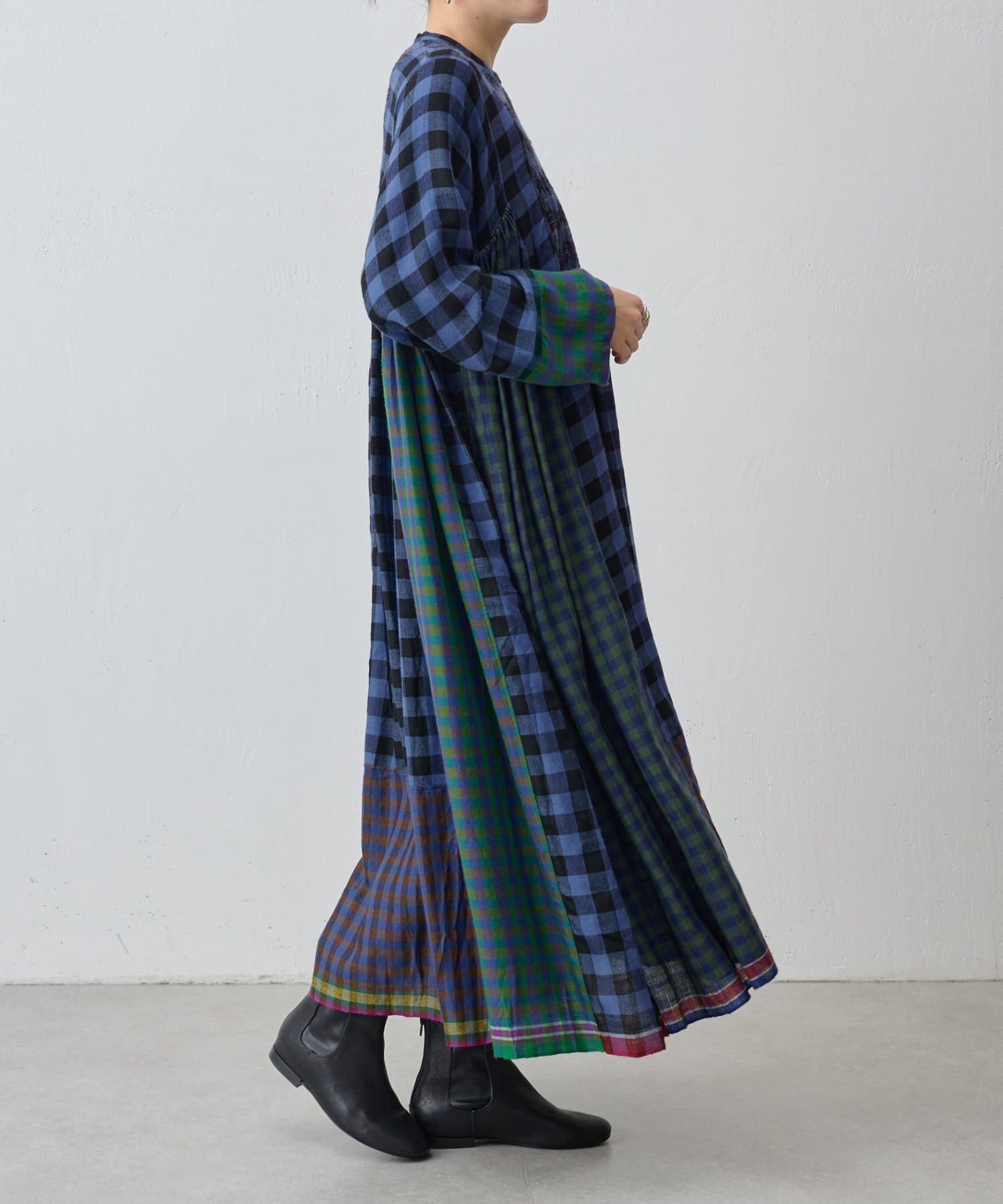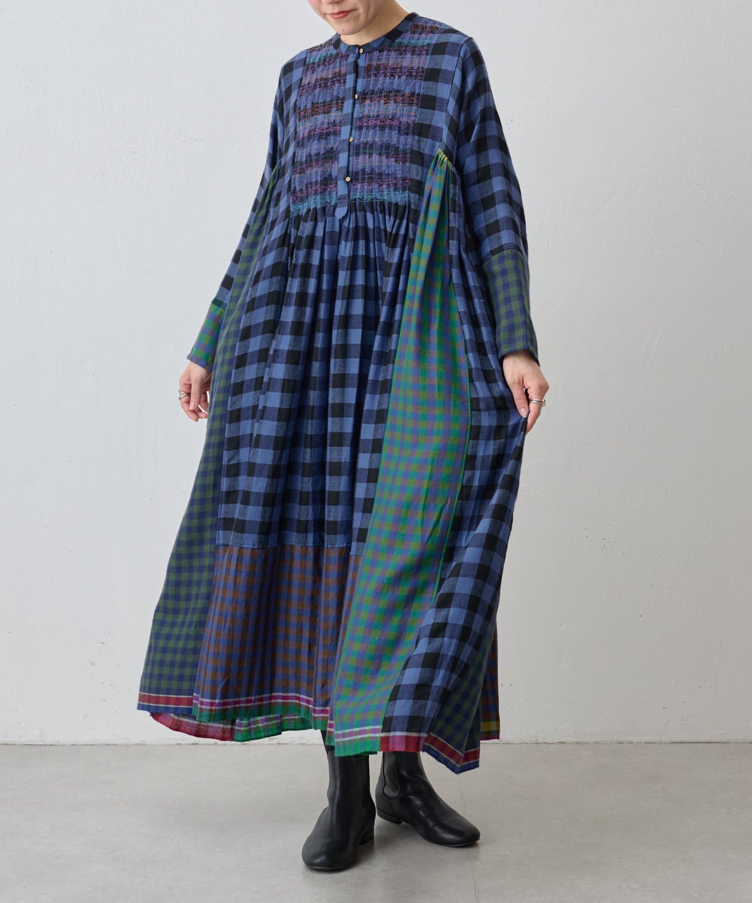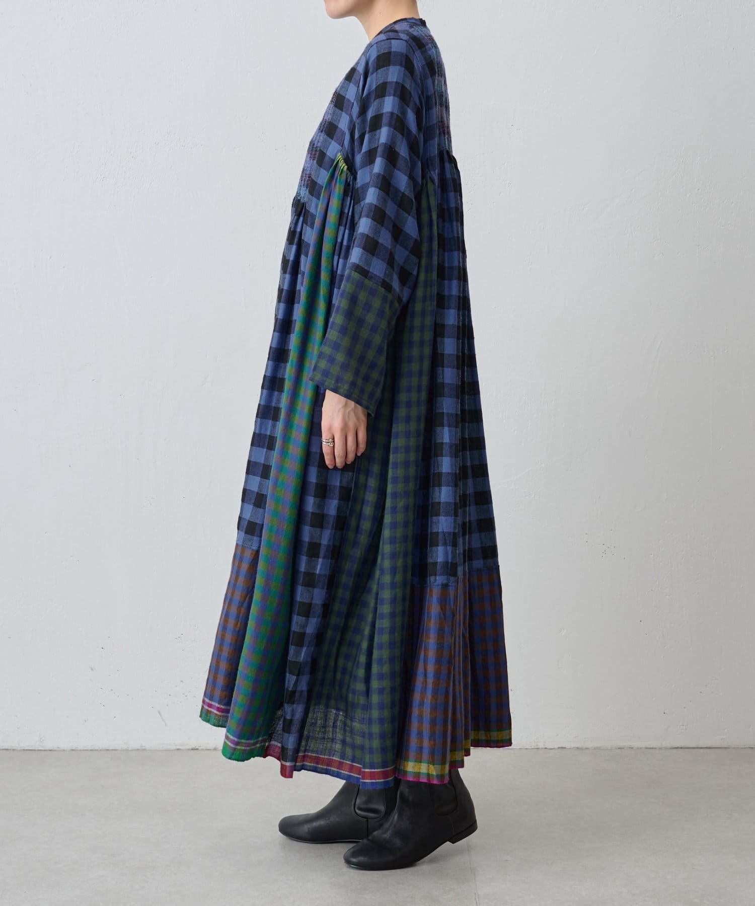 様々なカラーのブロックチェック生地を組み合わせたシャツワンピース。