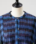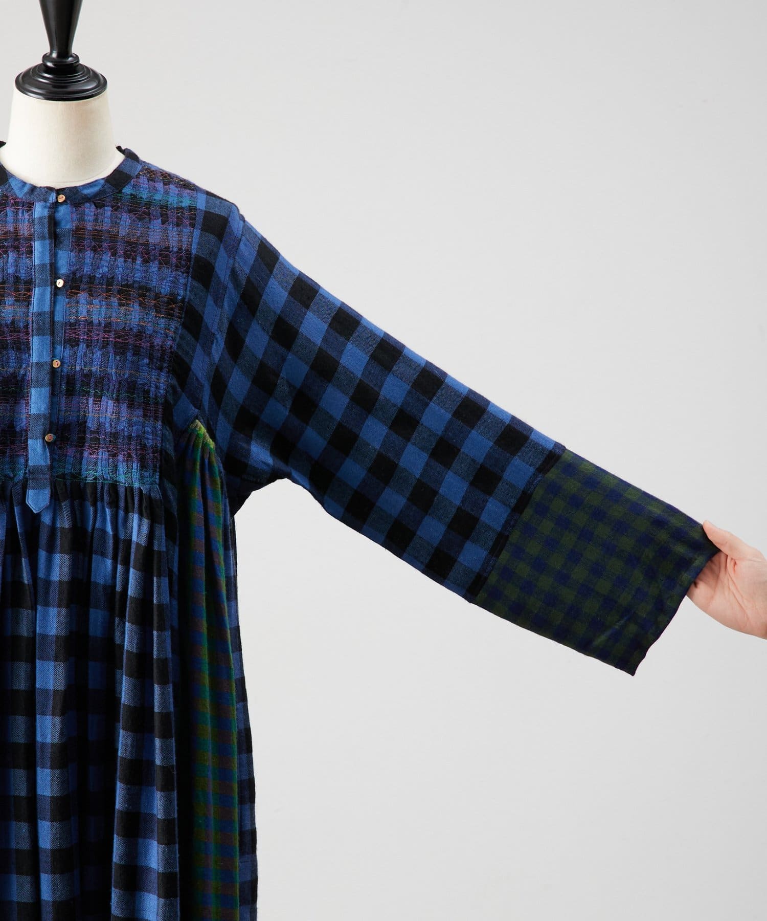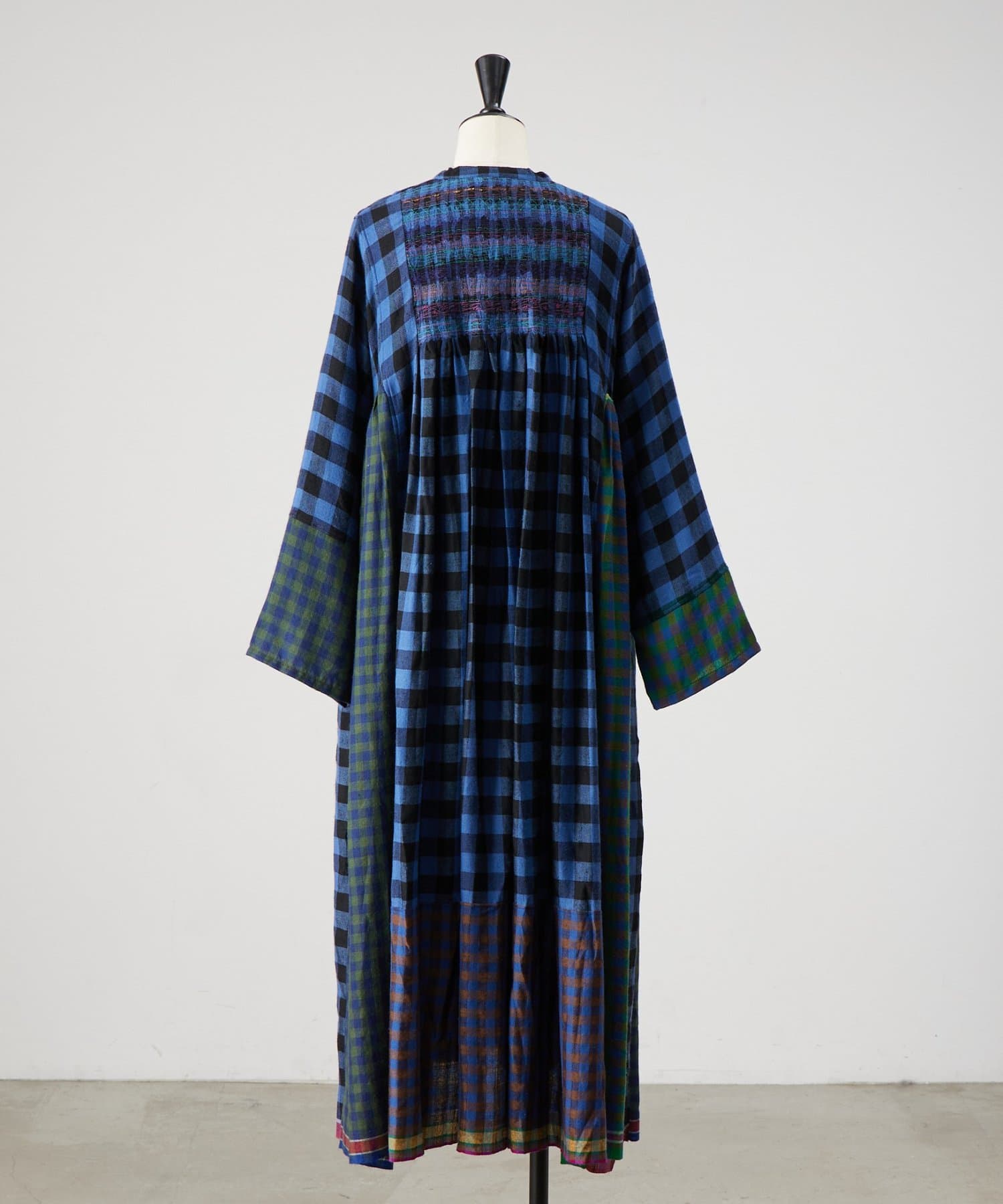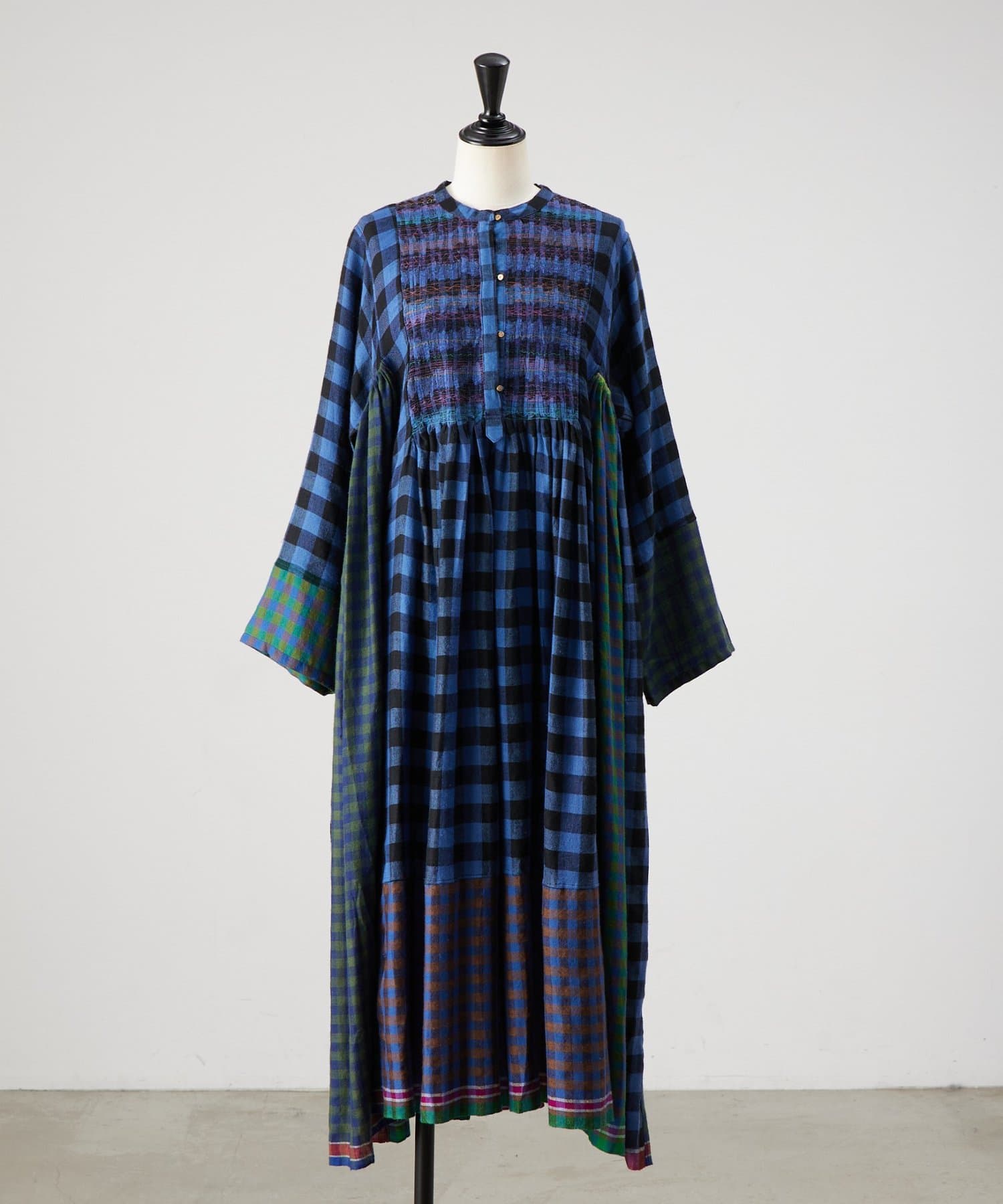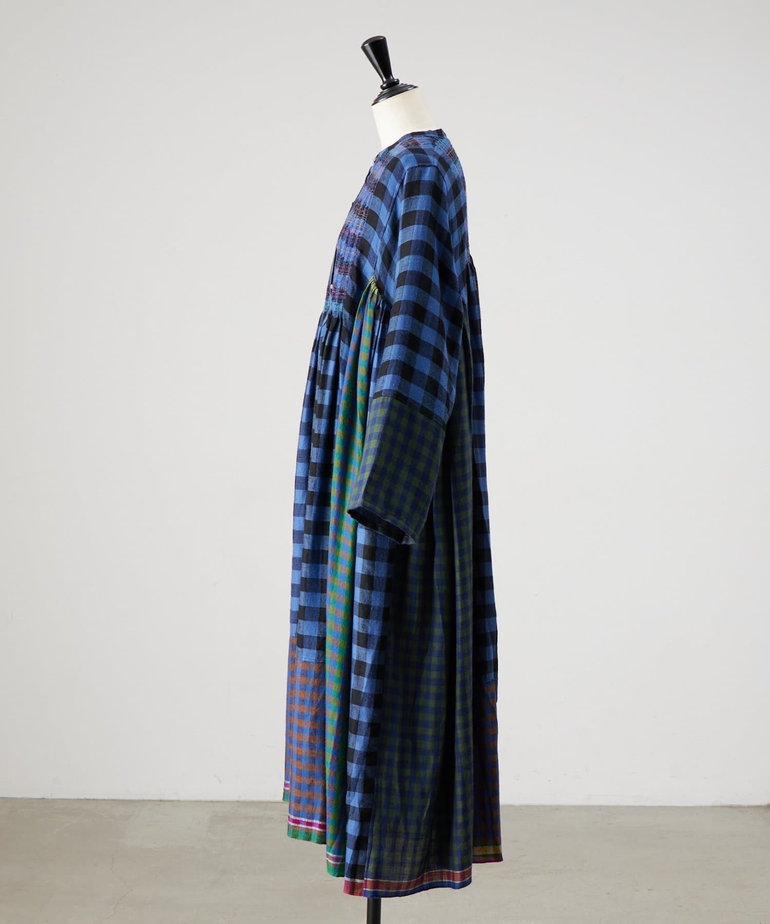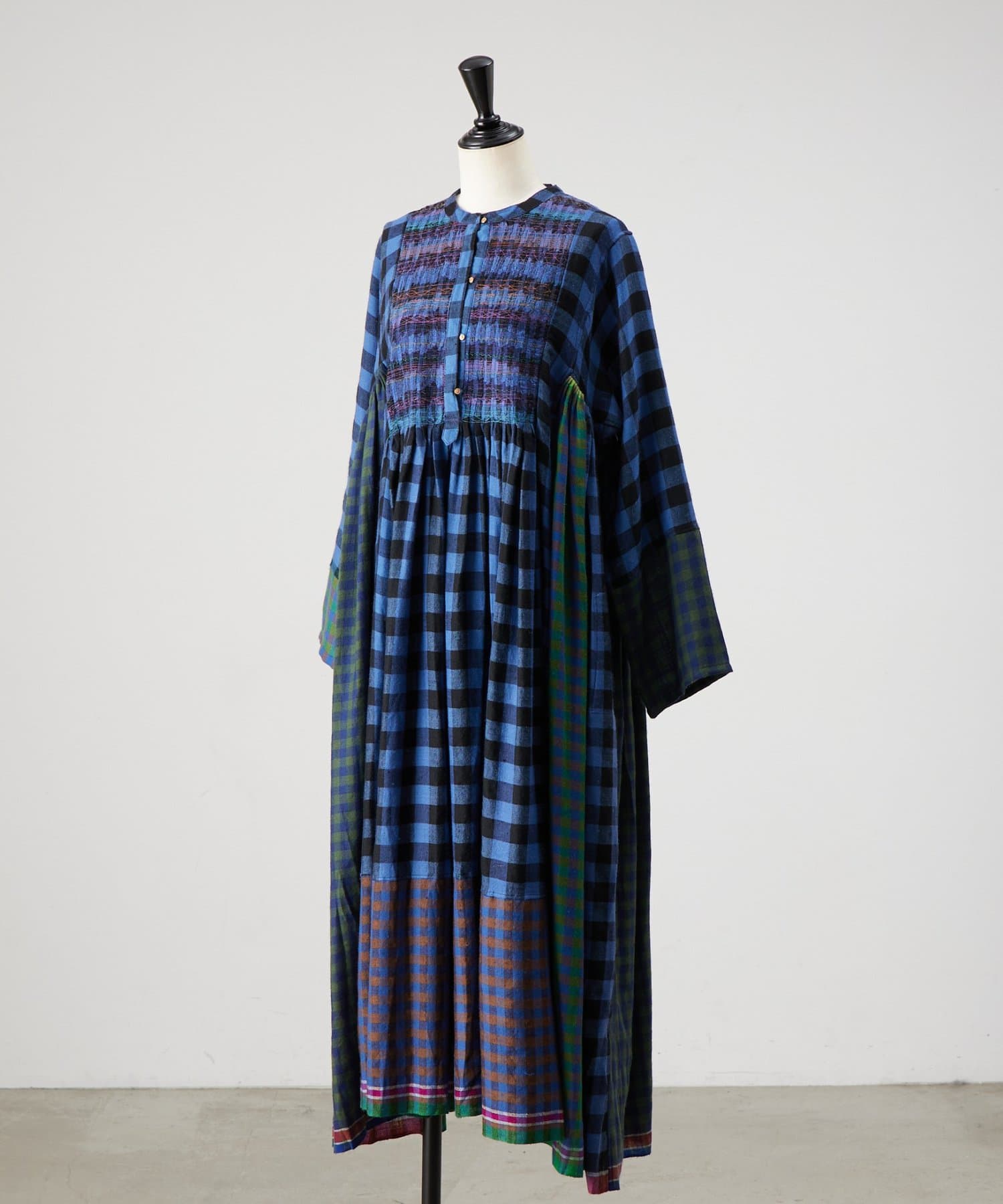 様々なカラーのブロックチェック生地を組み合わせたシャツワンピース。