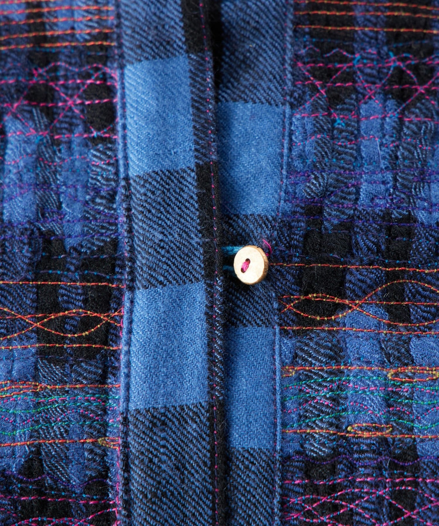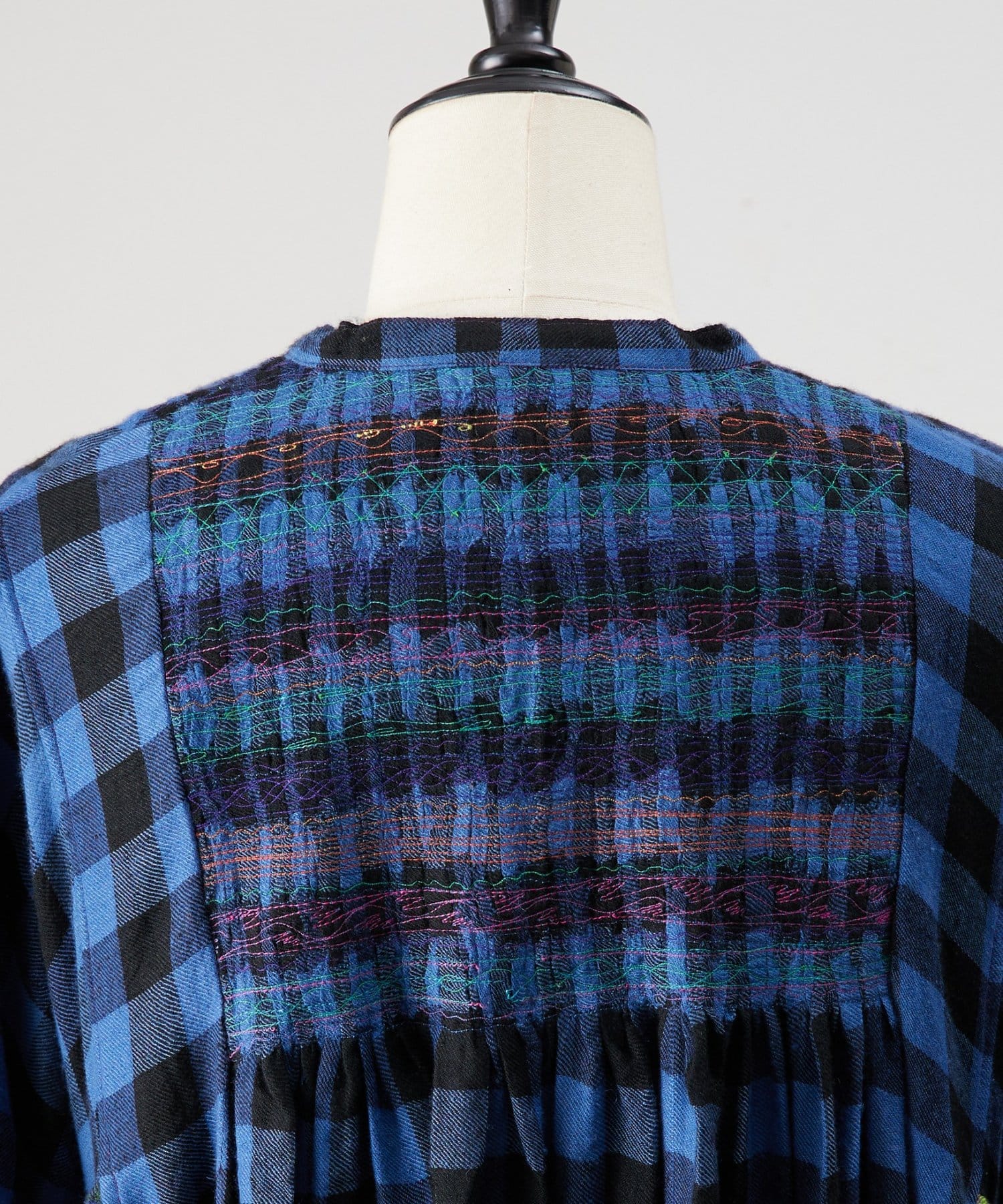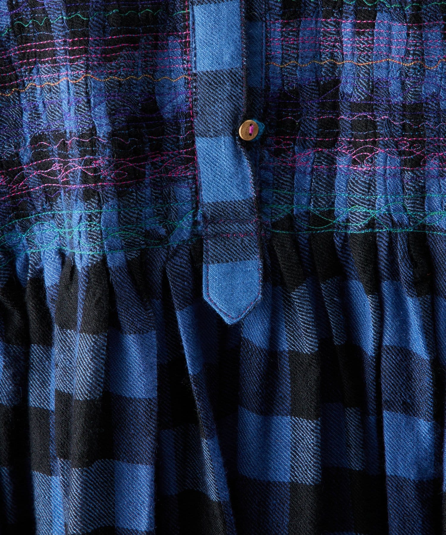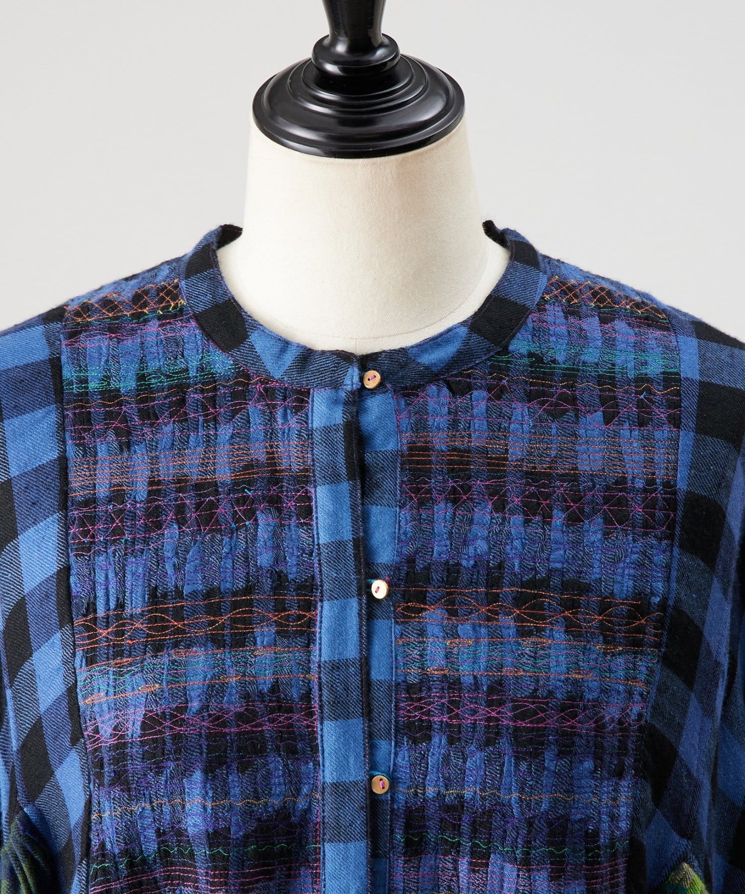 衿元はバンドカラーで、カラフルなミシンステッチで模様を描き、ゴールドの小さなボタンがポイント。