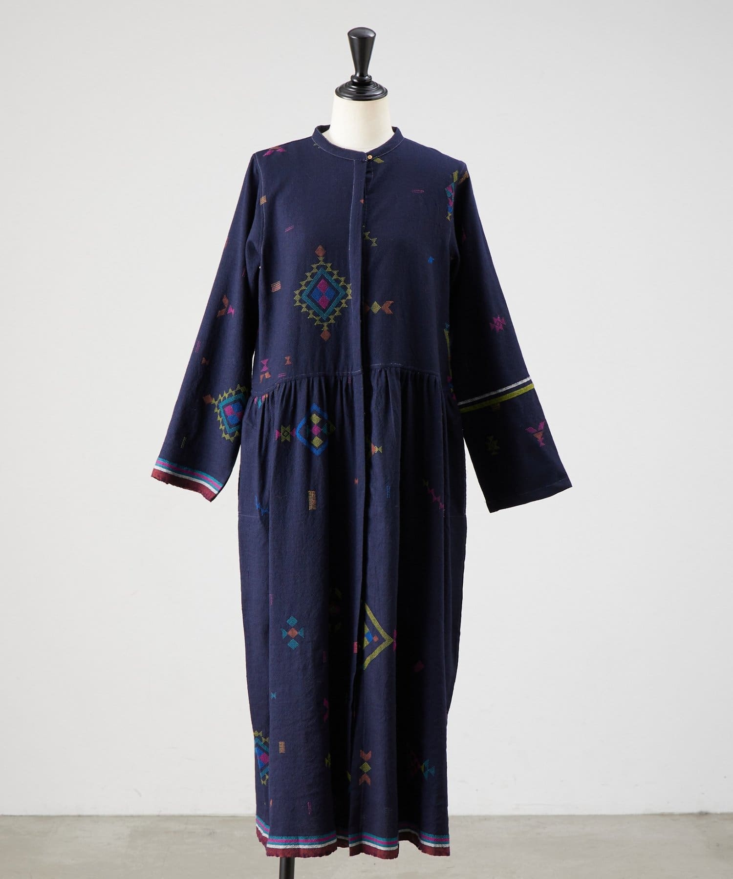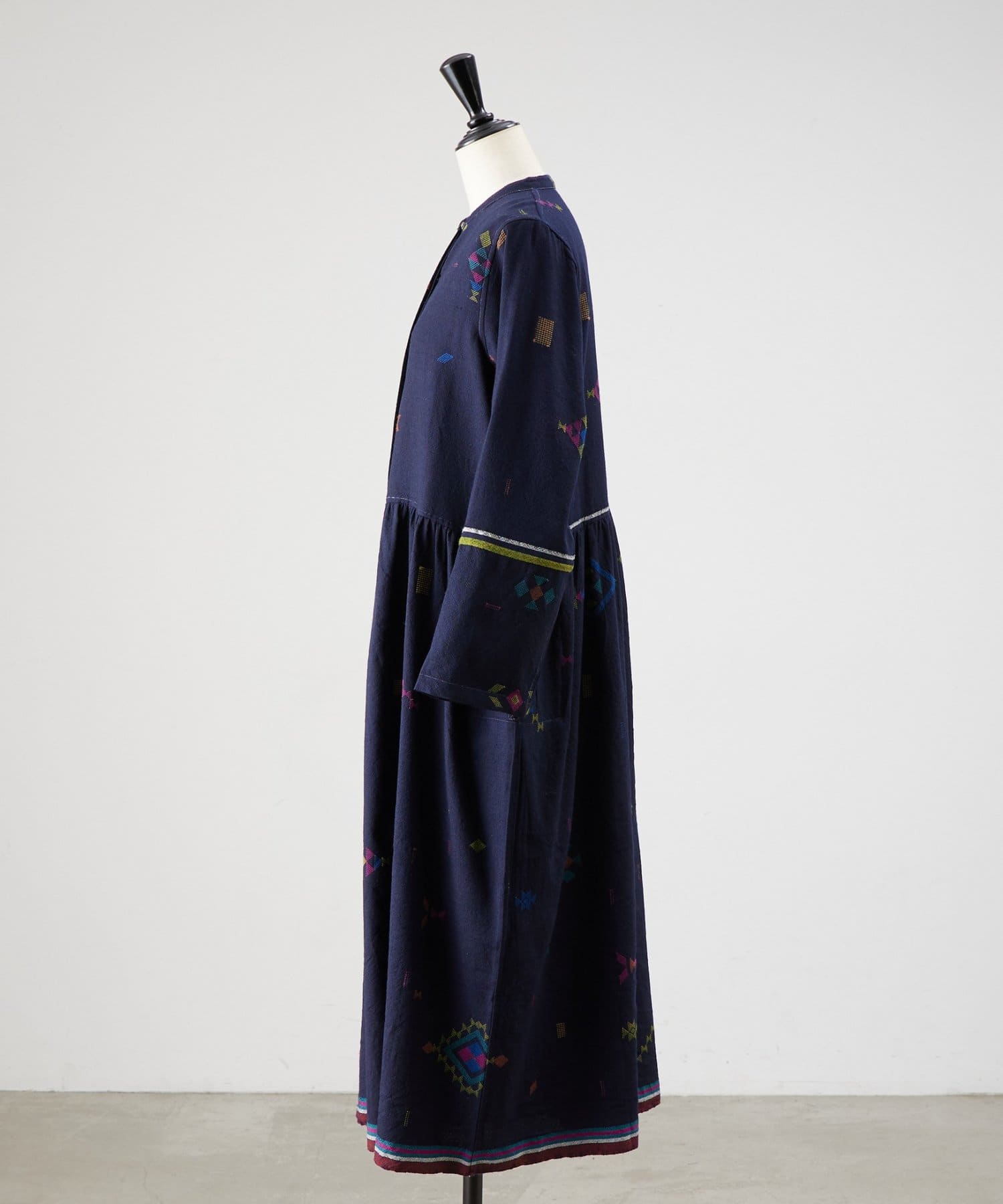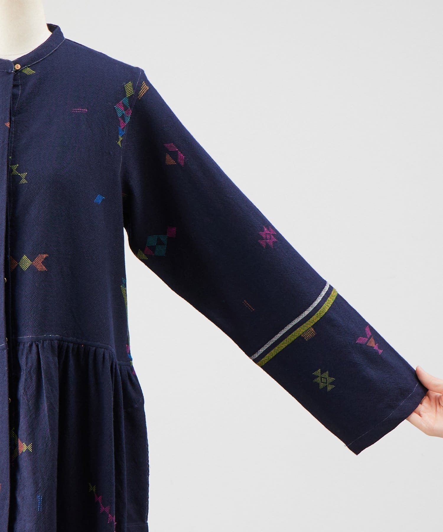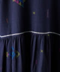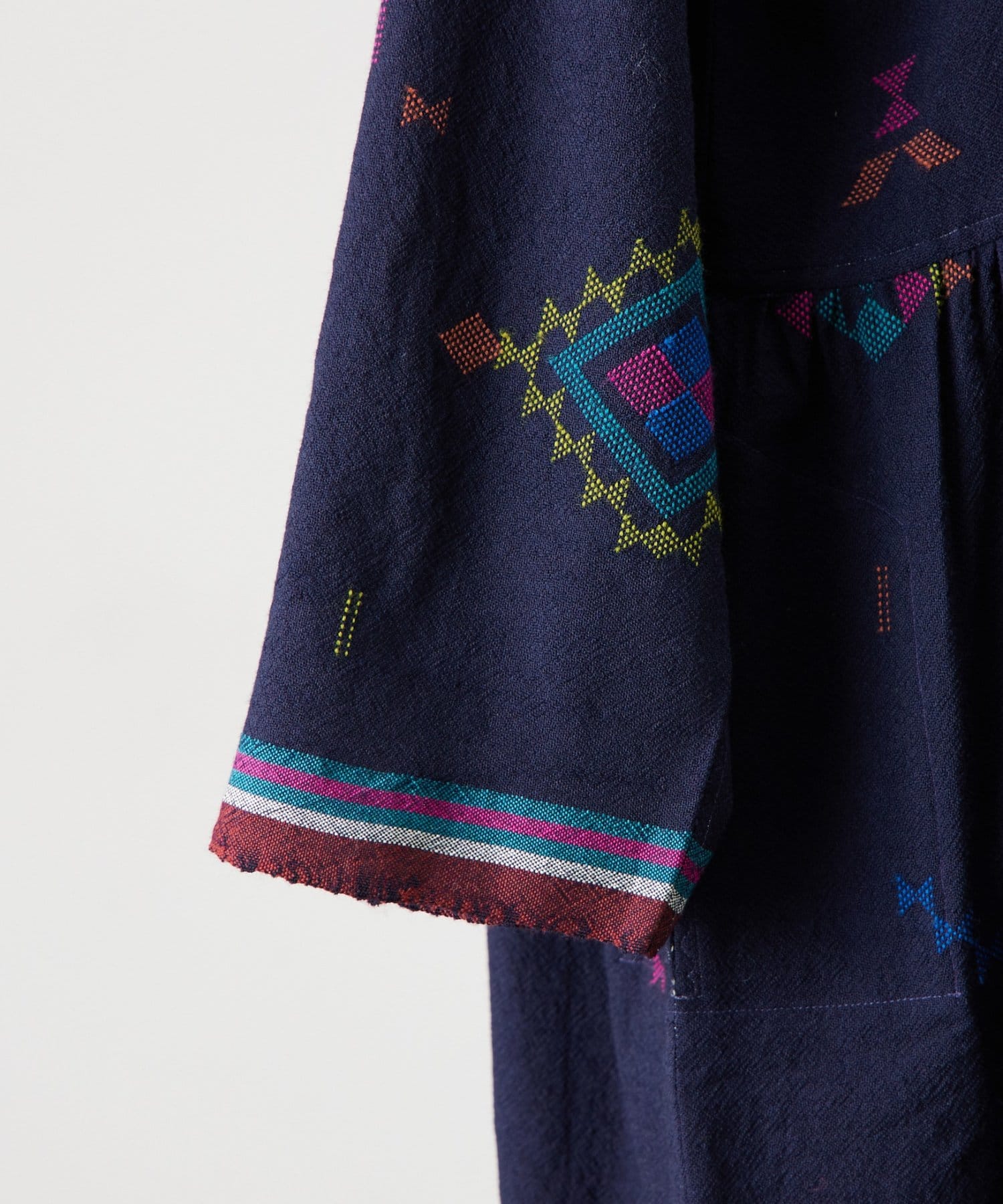 こちらのワンピースは、ダークネイビーをベースにカラフルな糸で幾何学模様を織りで表現した、どこか温かみのある表情が印象的な一着。