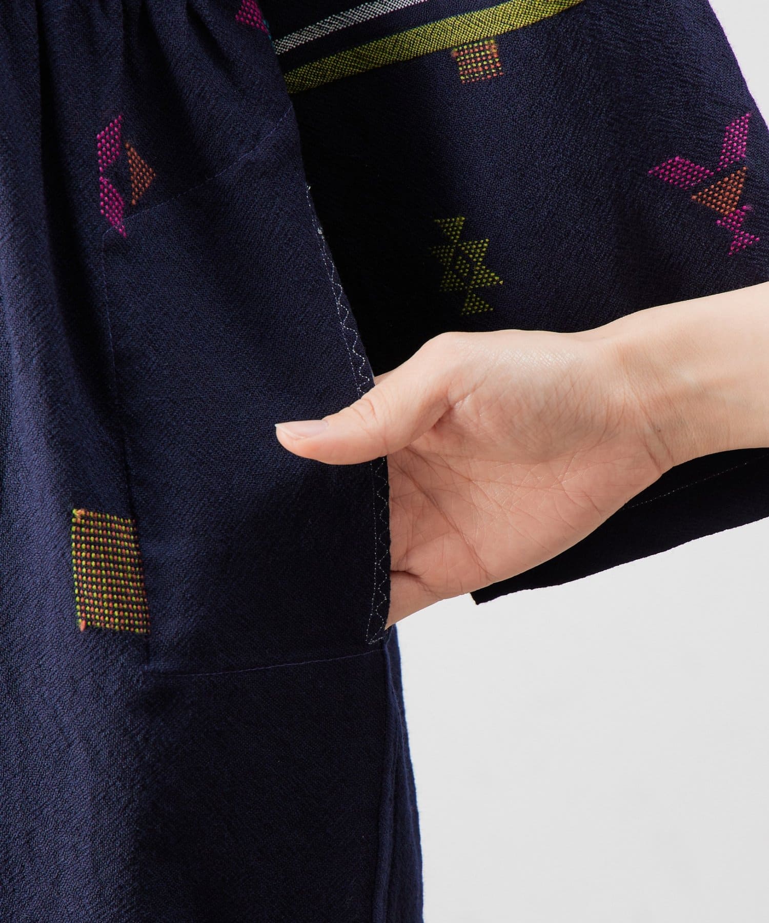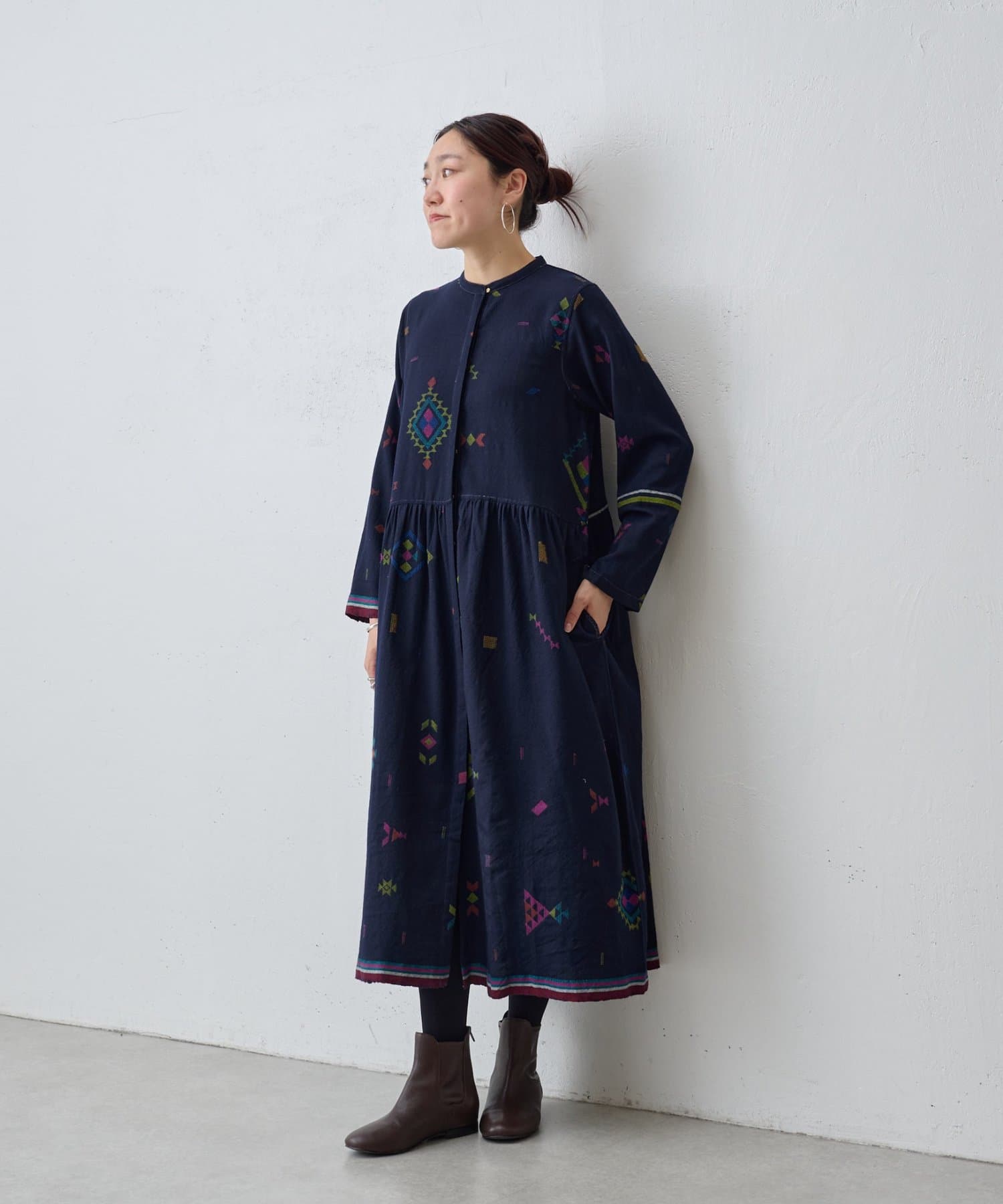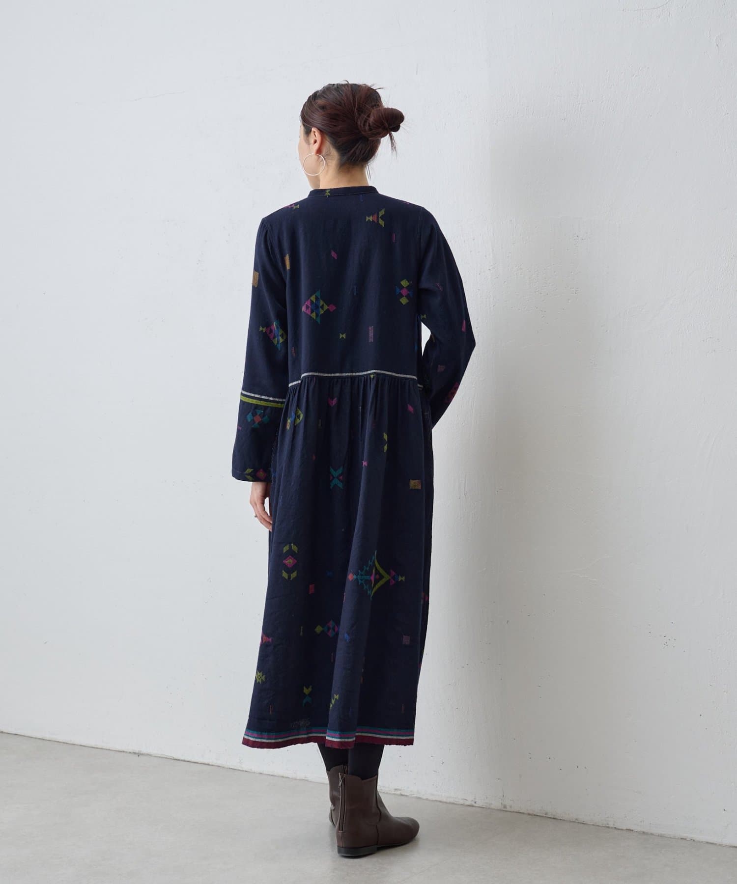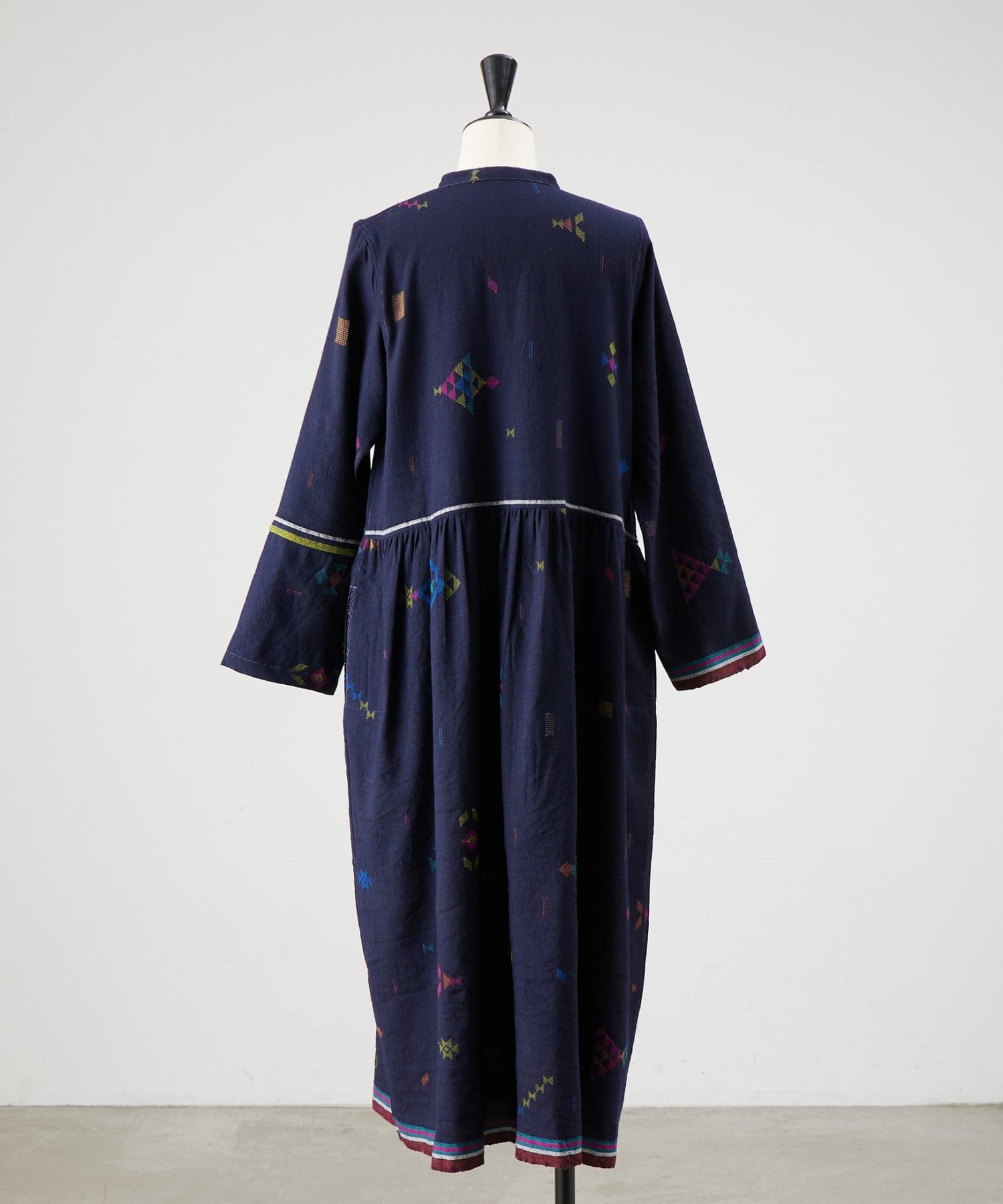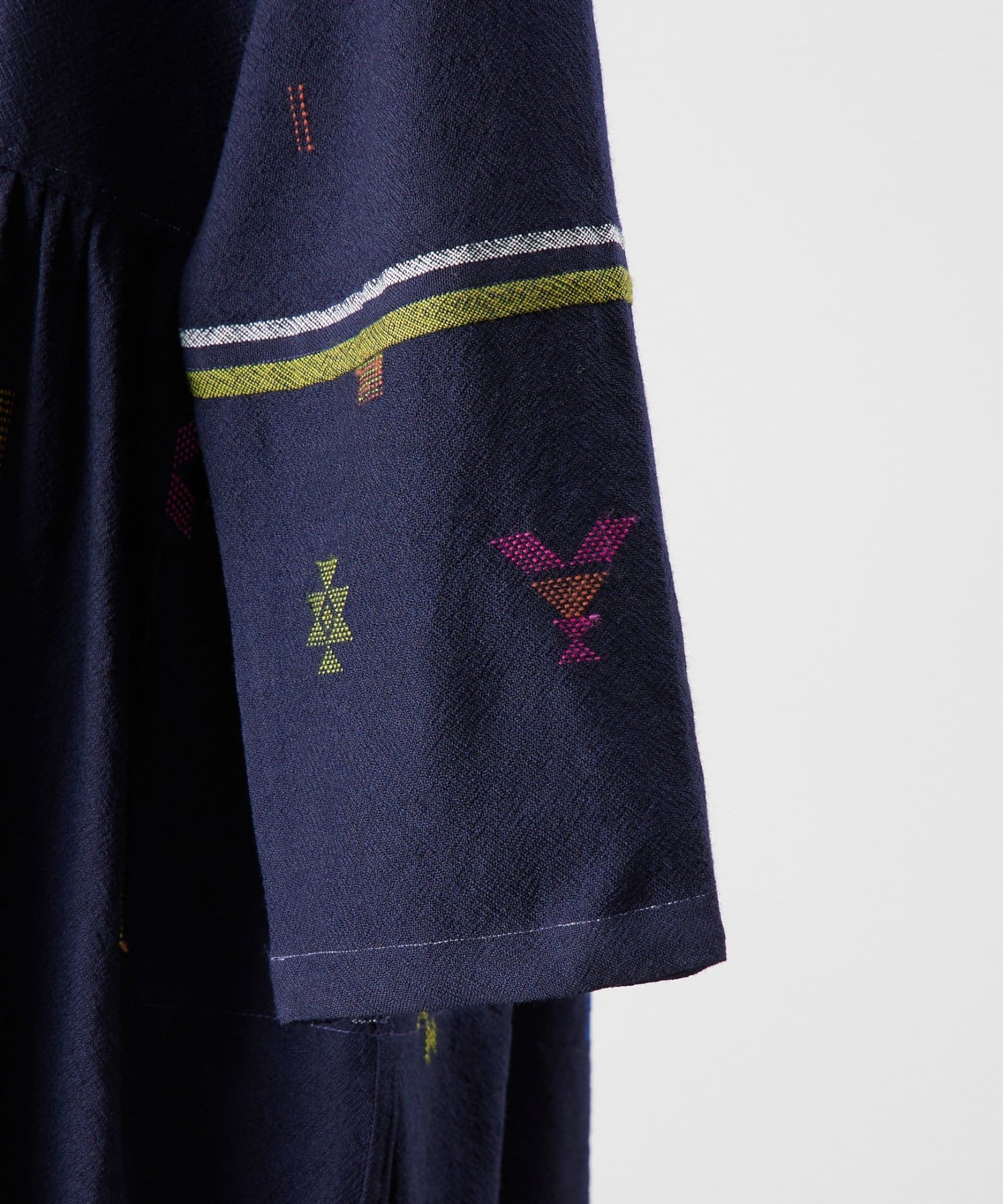 こちらのワンピースは、ダークネイビーをベースにカラフルな糸で幾何学模様を織りで表現した、どこか温かみのある表情が印象的な一着。
