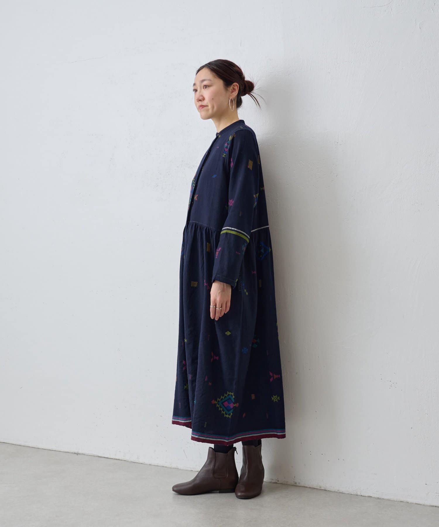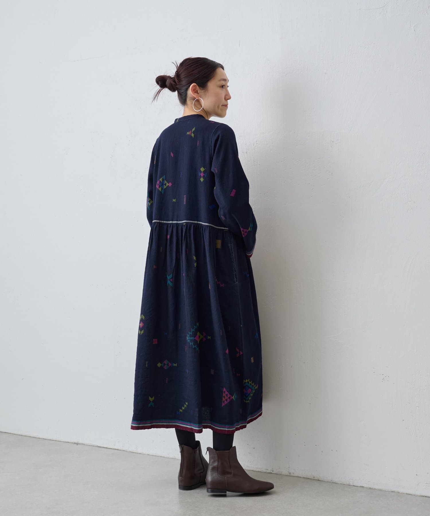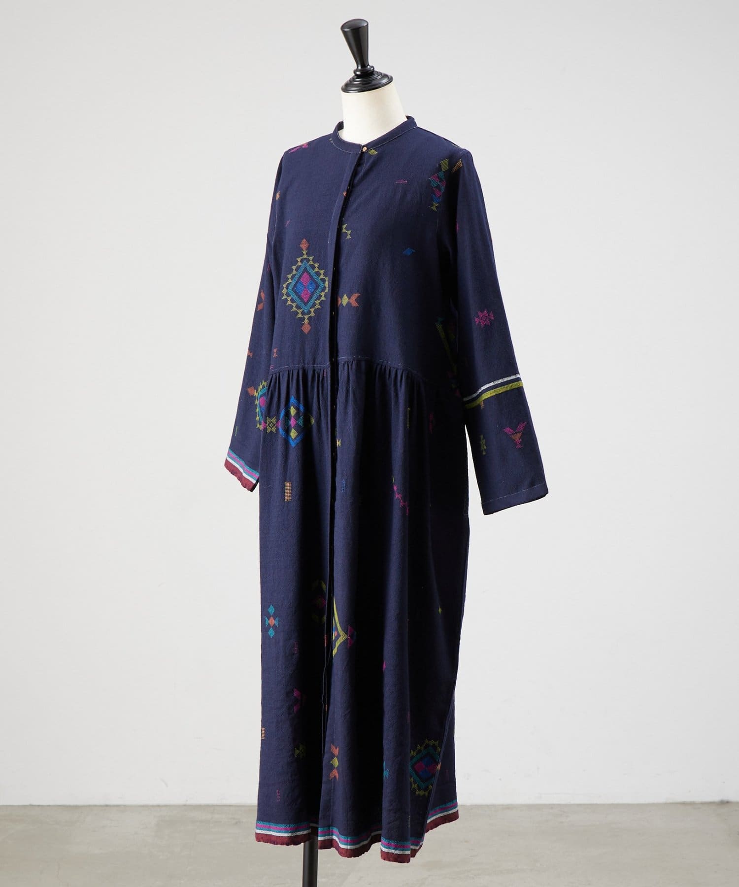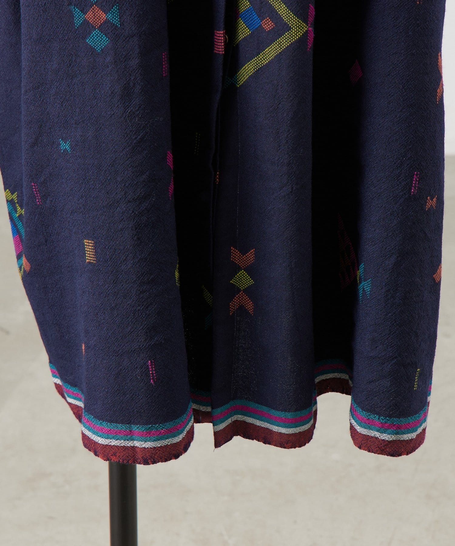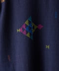 こちらのワンピースは、ダークネイビーをベースにカラフルな糸で幾何学模様を織りで表現した、どこか温かみのある表情が印象的な一着。
