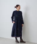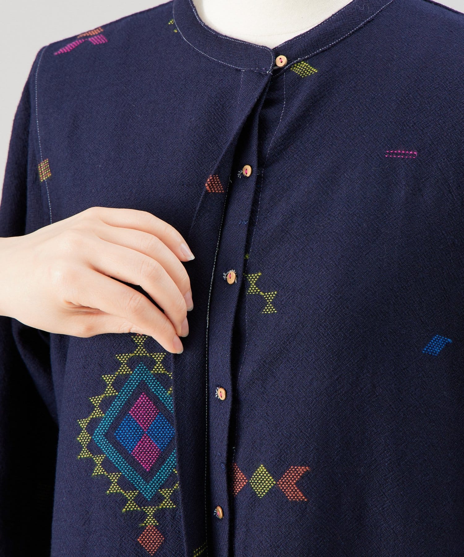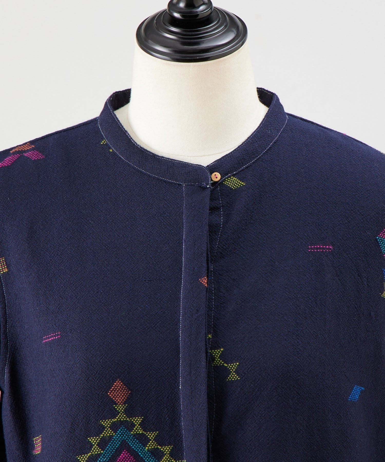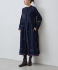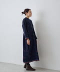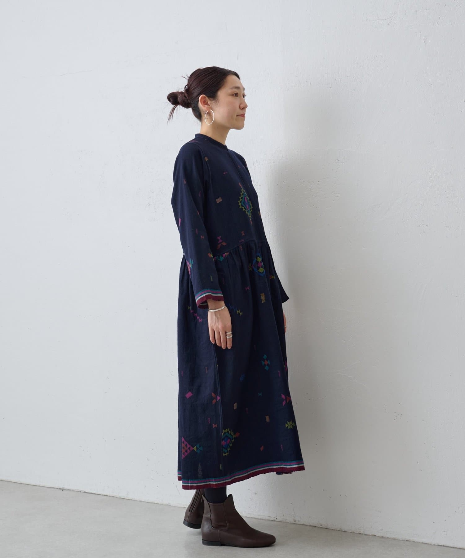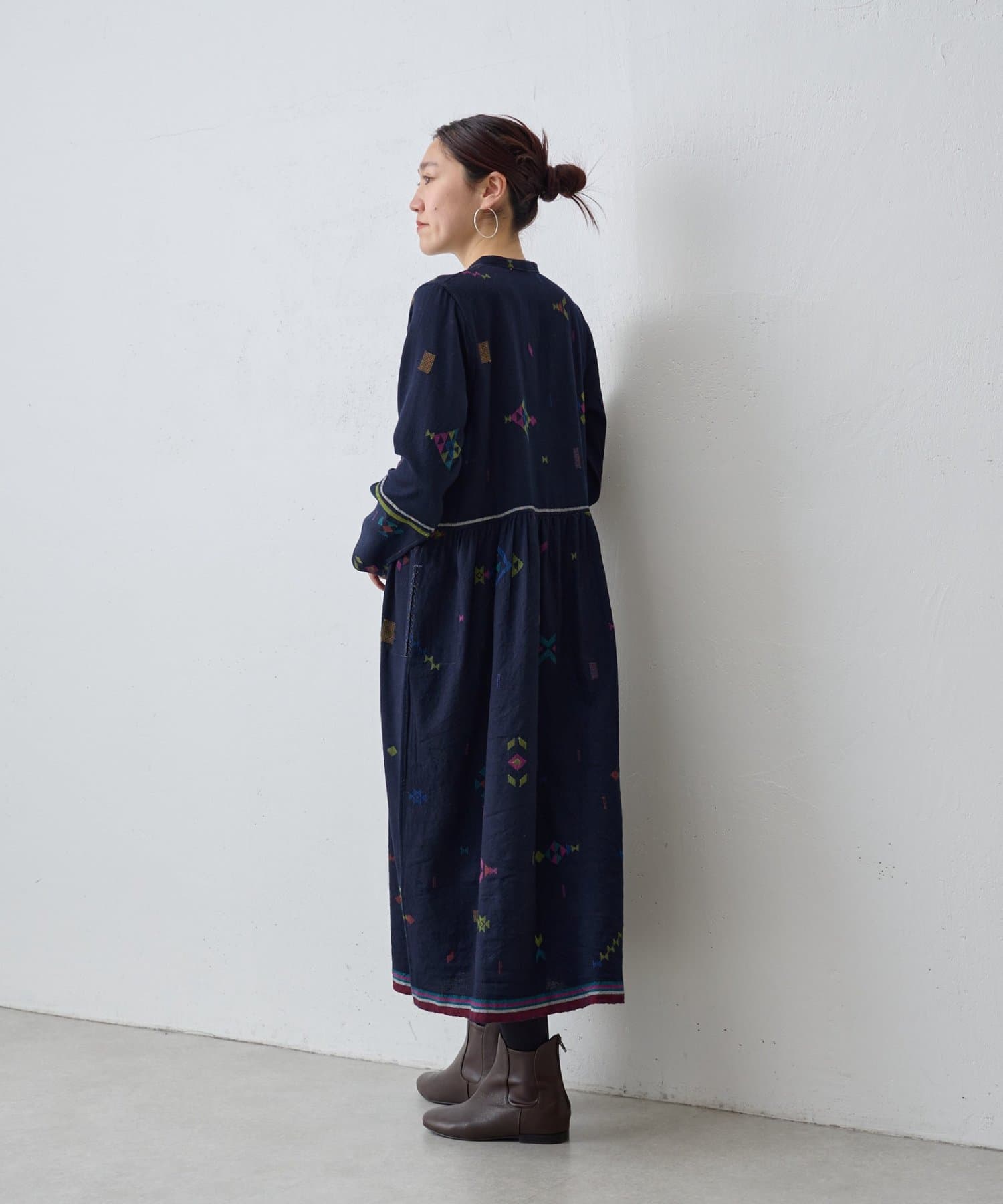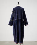 こちらのワンピースは、ダークネイビーをベースにカラフルな糸で幾何学模様を織りで表現した、どこか温かみのある表情が印象的な一着。
