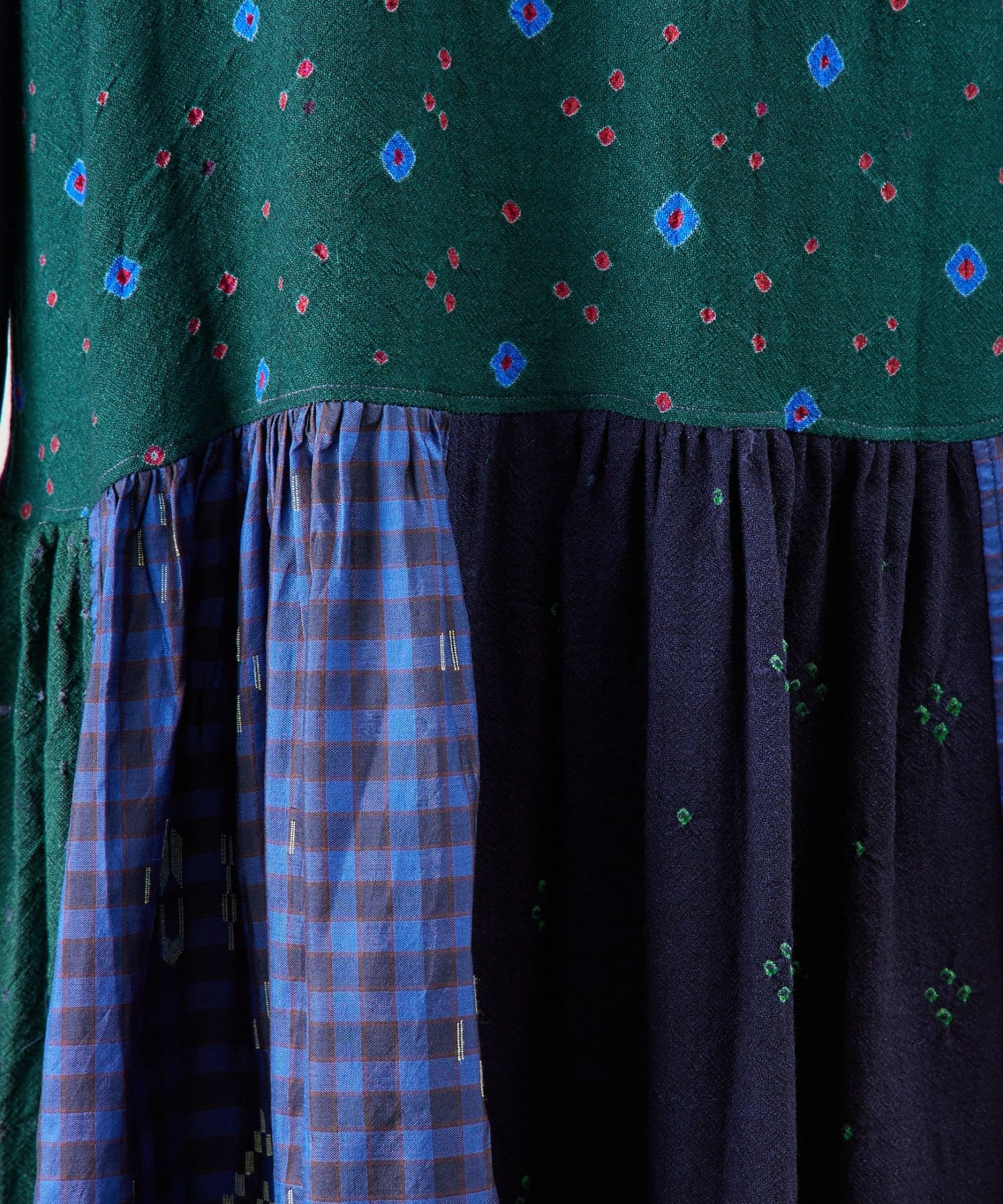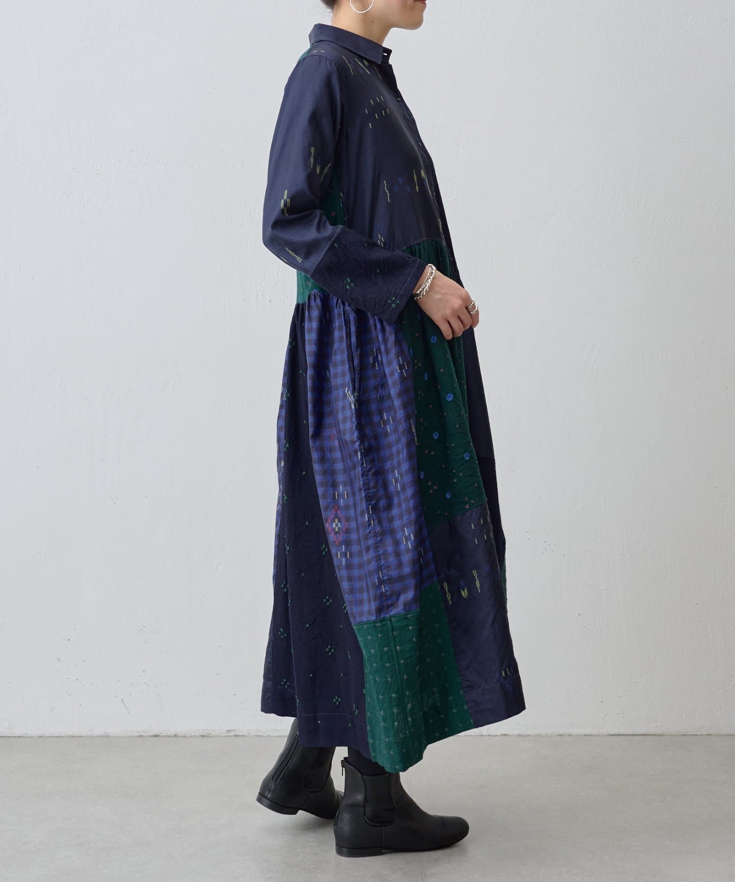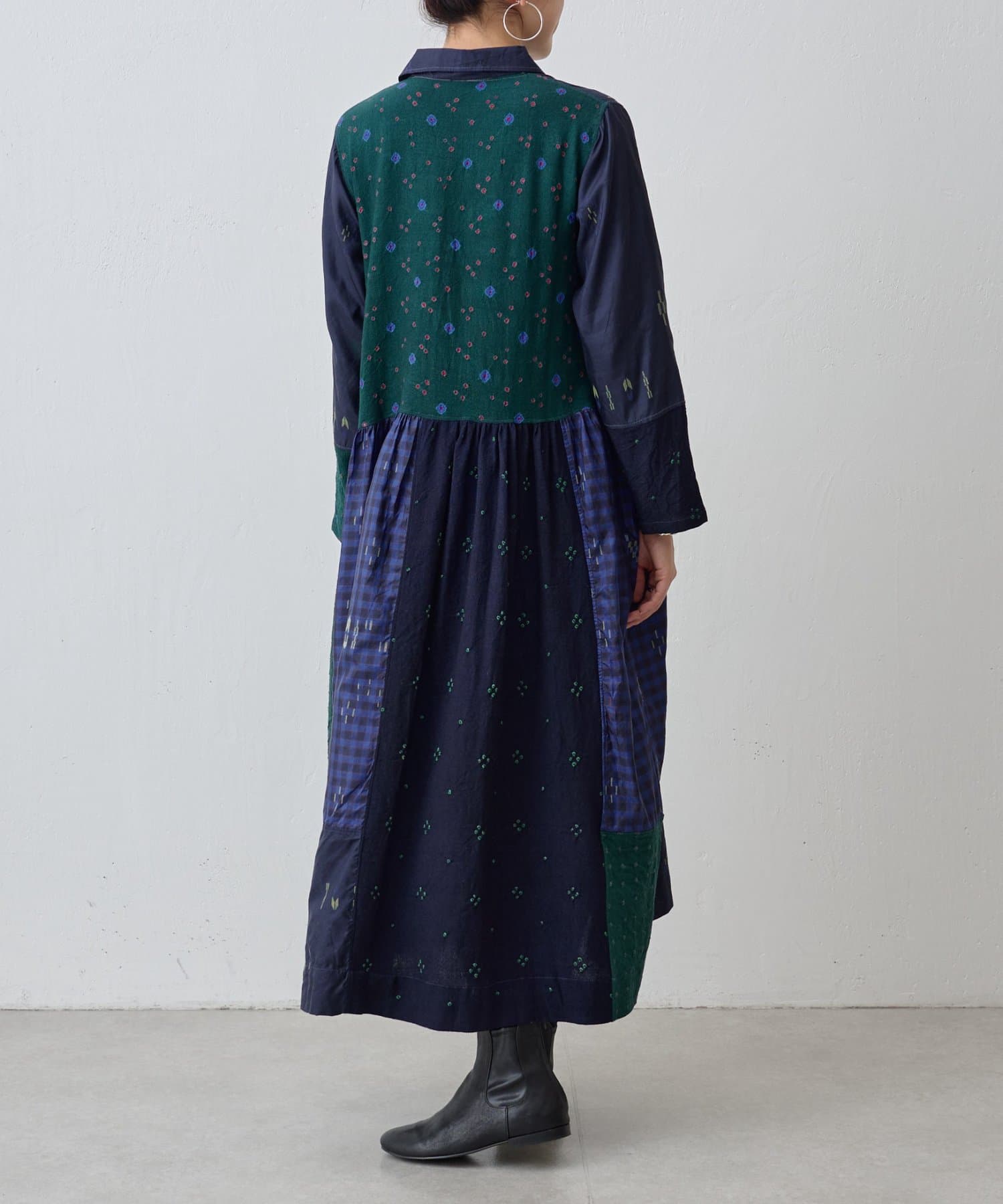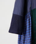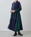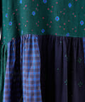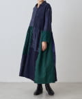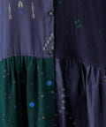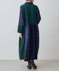絞り染めで模様を表現した生地を交互に組み合わせたドッキングワンピースです。