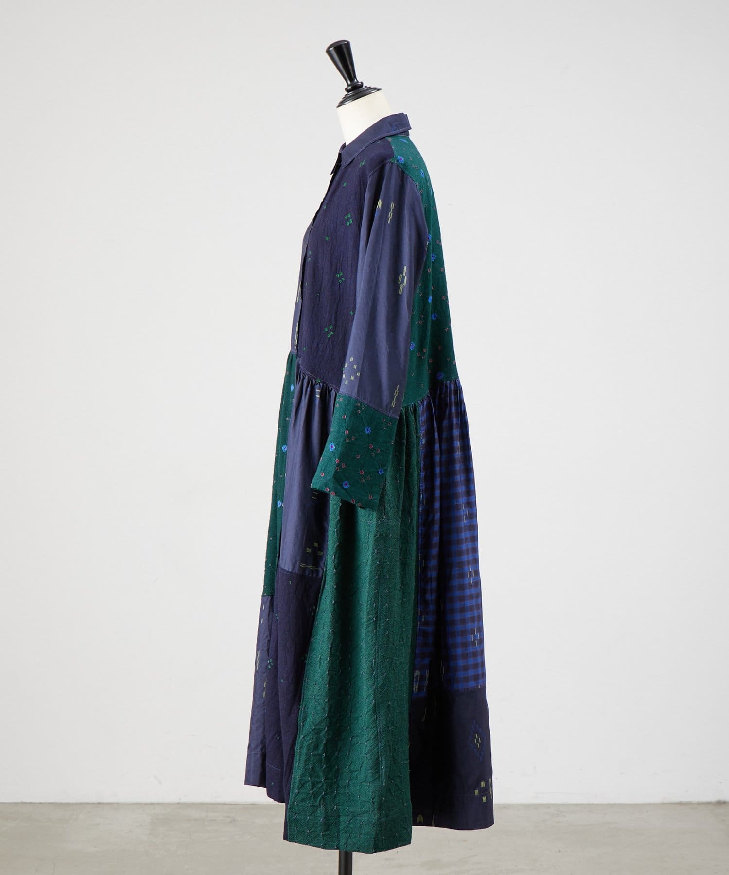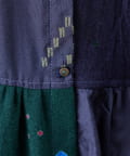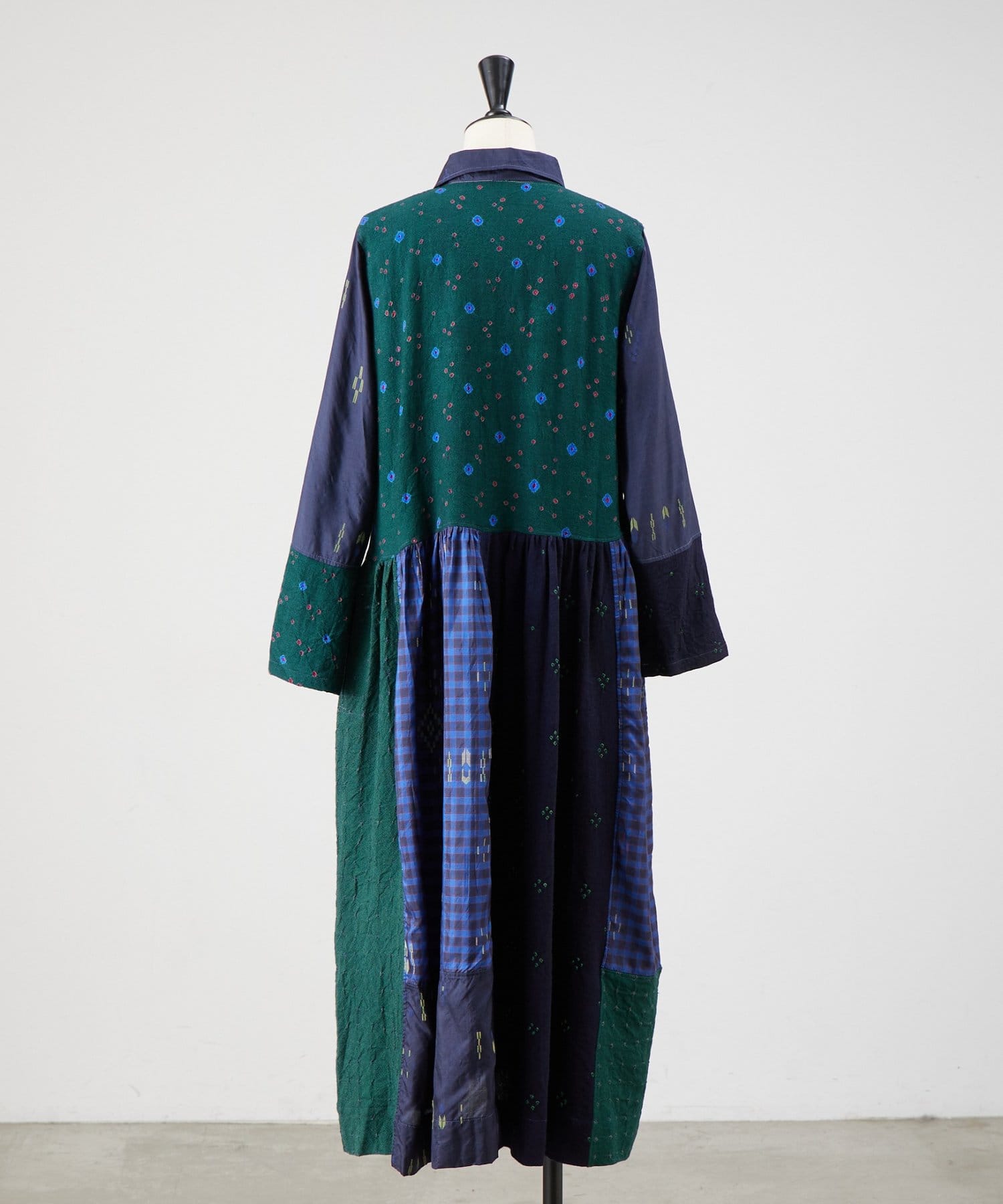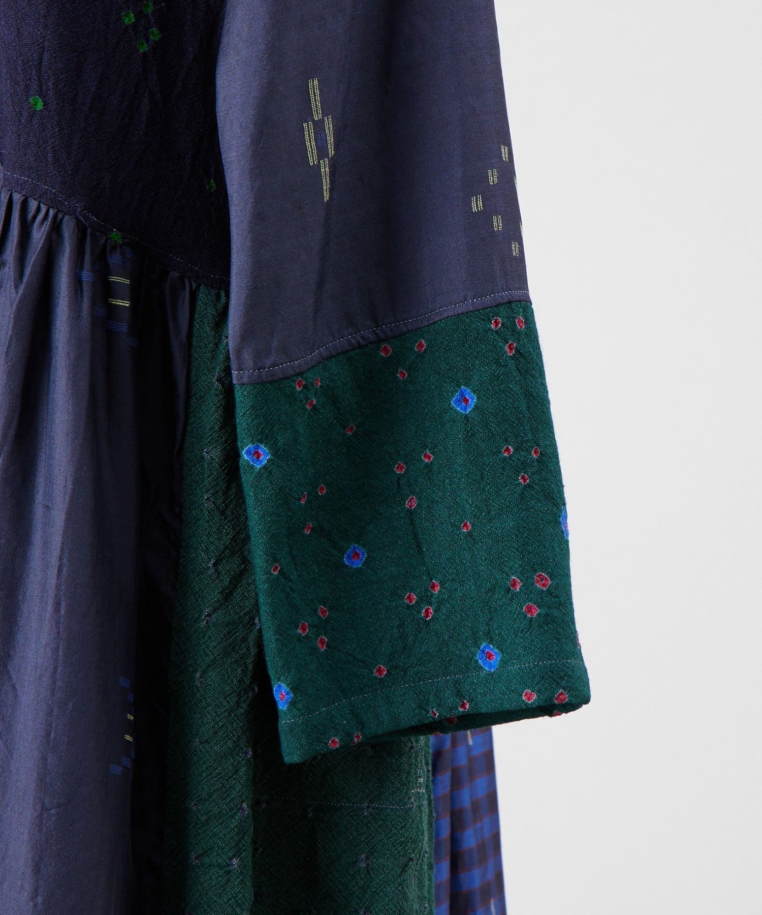 絞り染めで模様を表現した生地を交互に組み合わせたドッキングワンピースです。