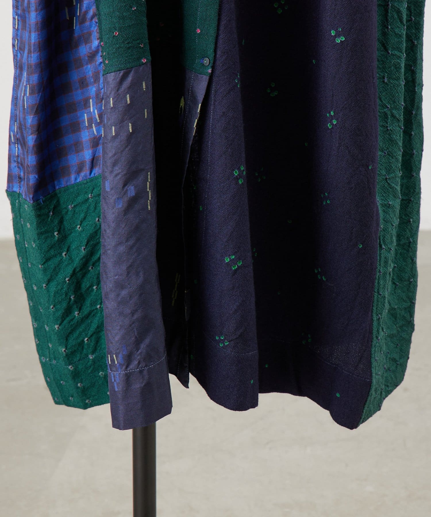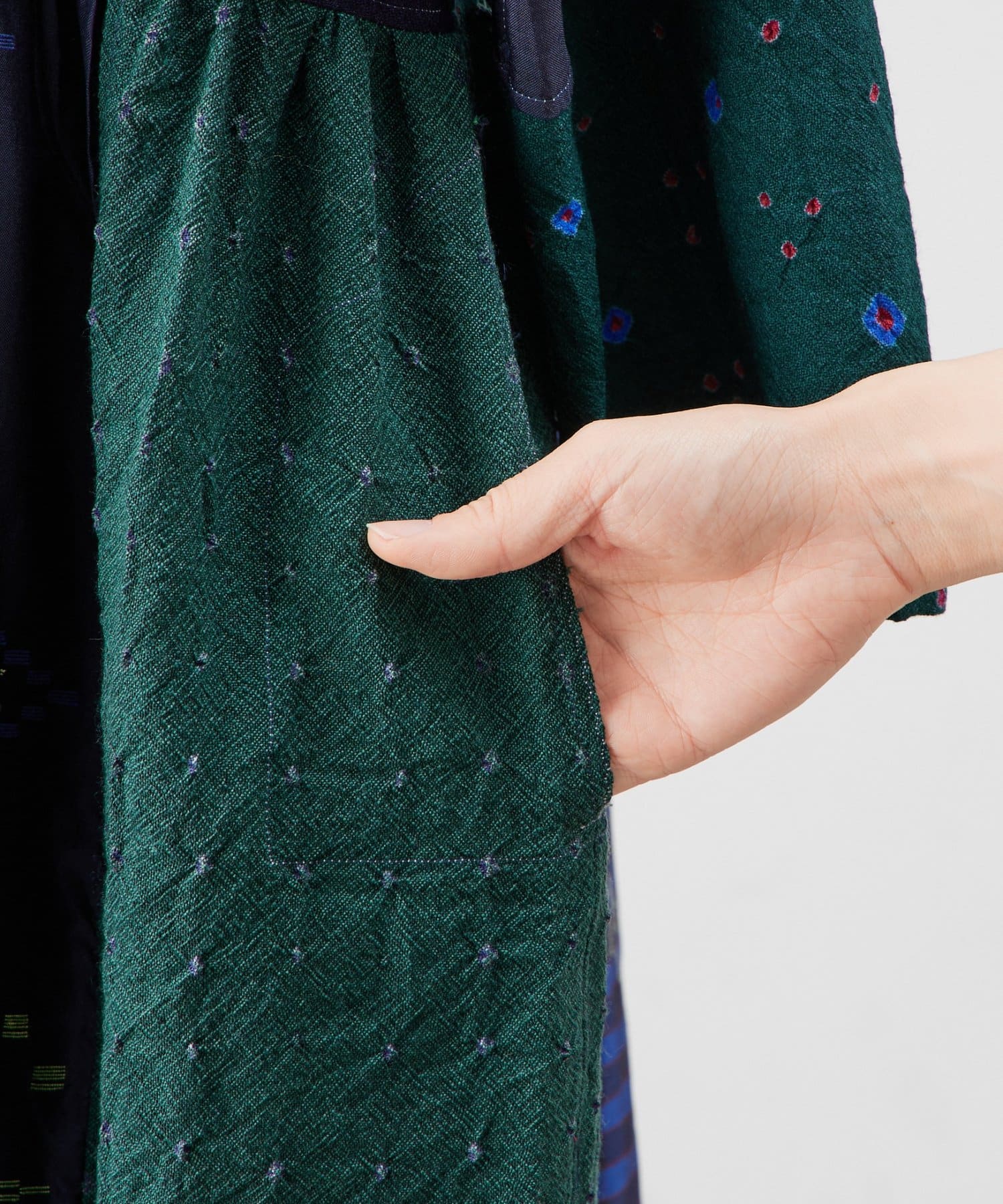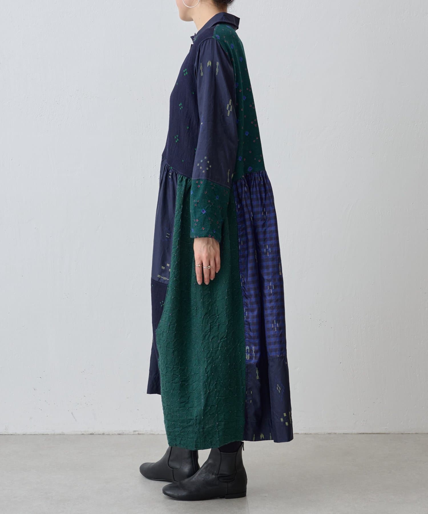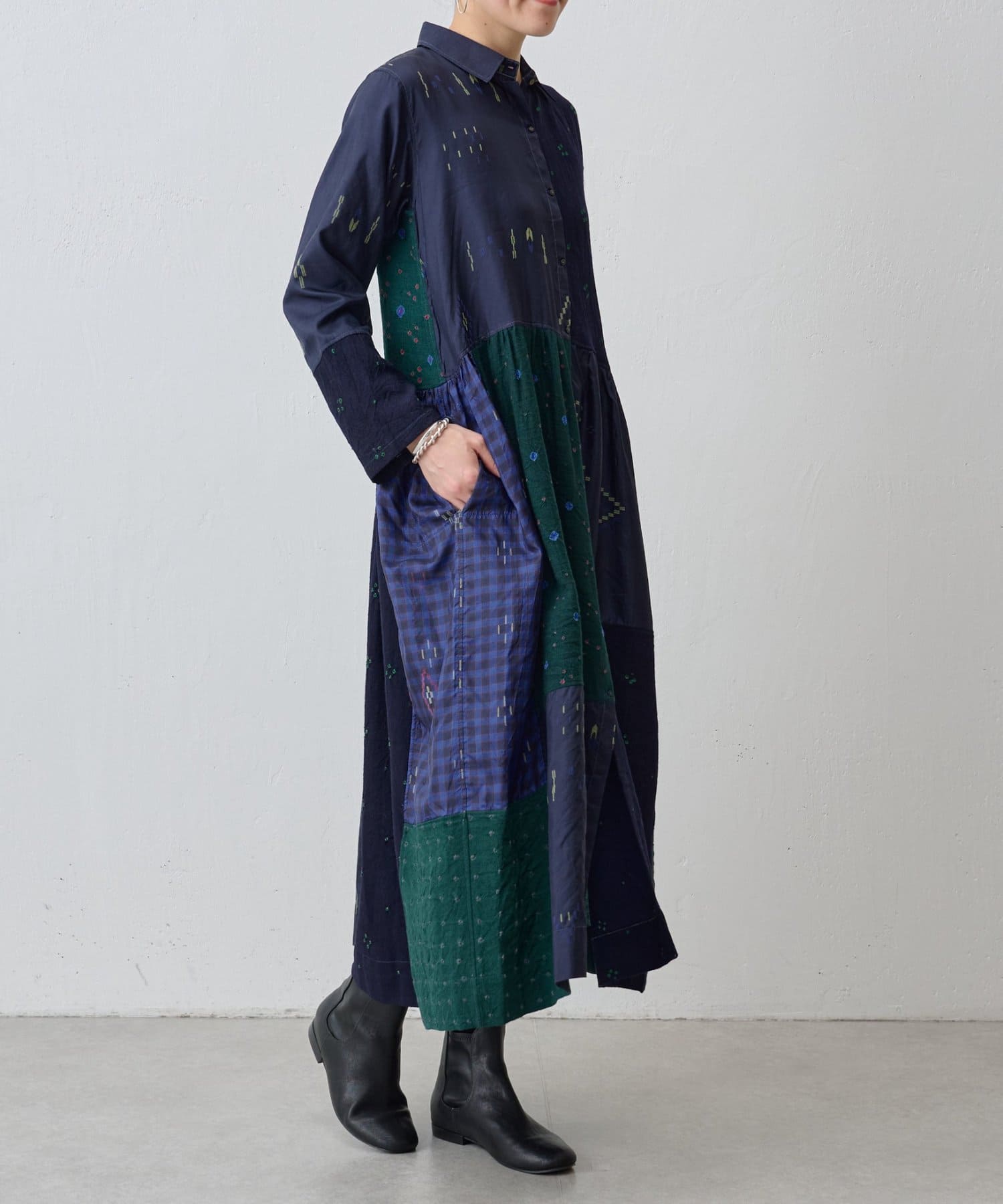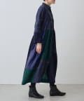 こちらのワンピースは幾何学模様やチェック柄を織りで表現したシルク生地と、