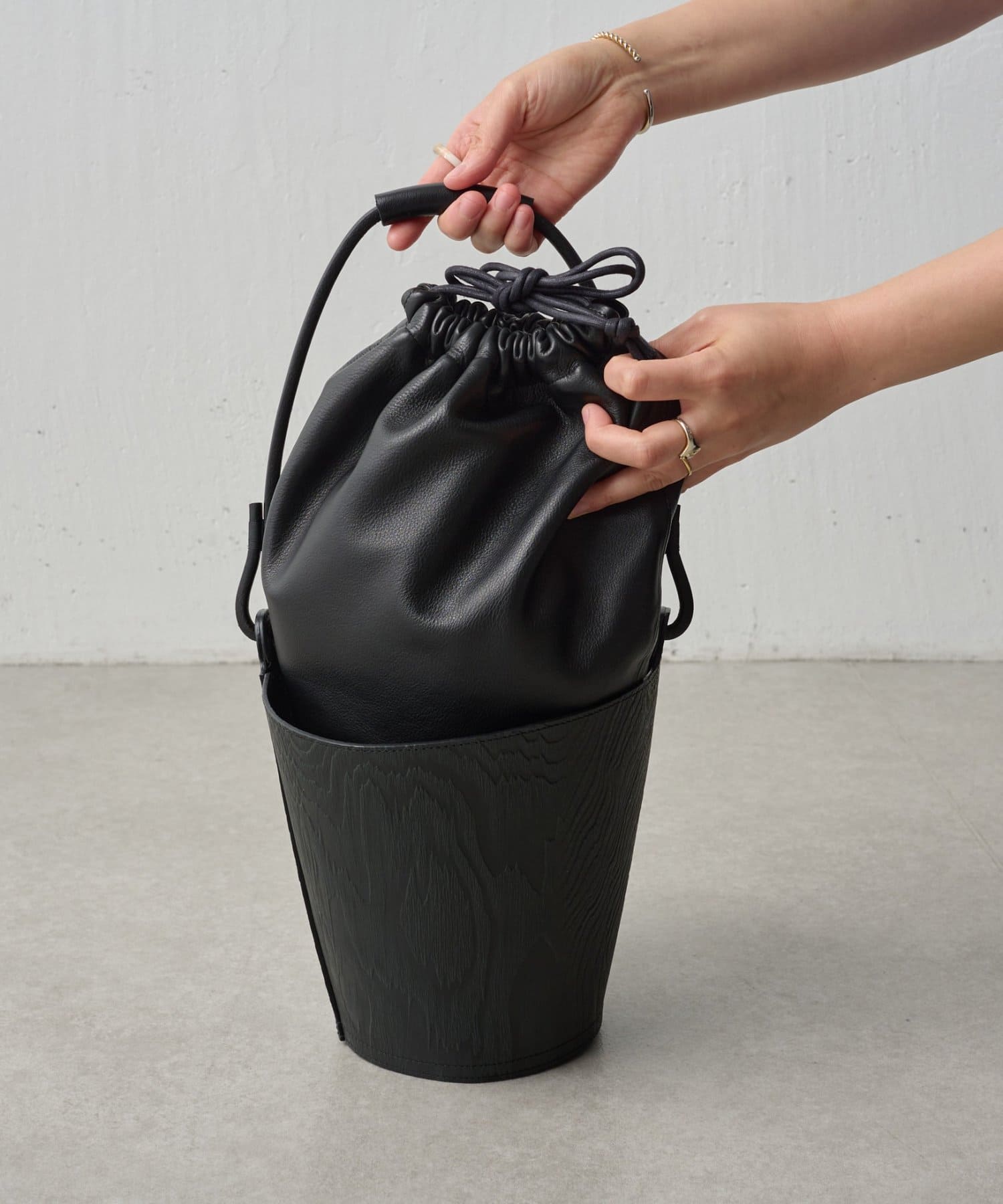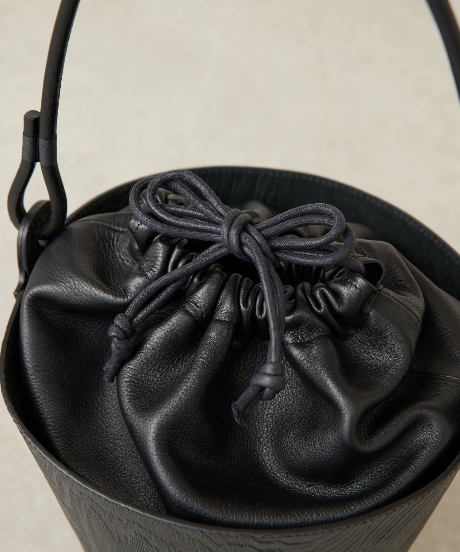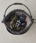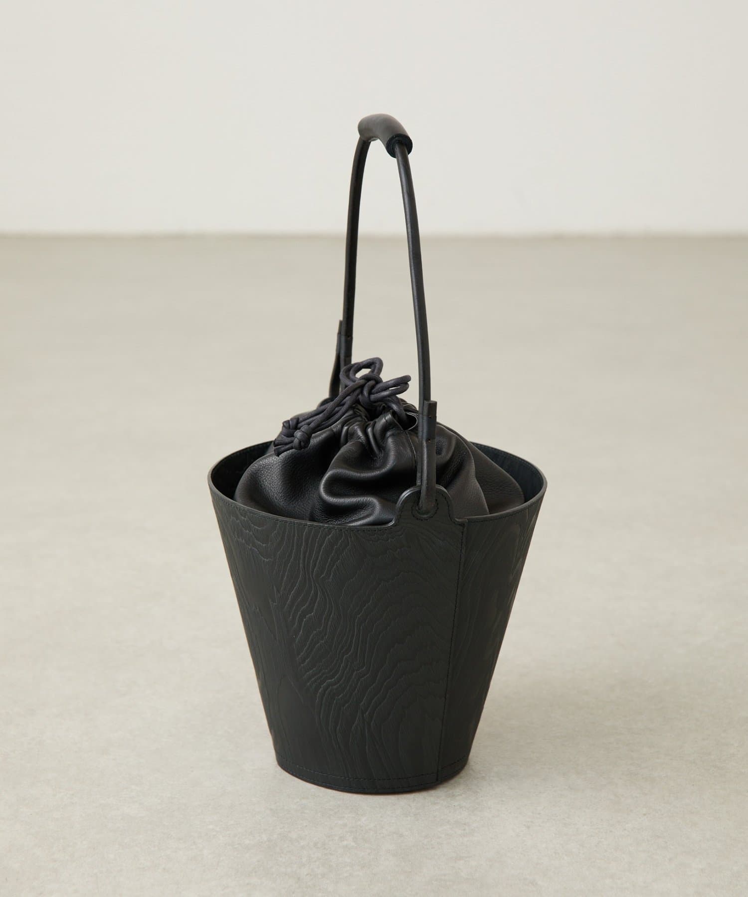 外のバケツ側のレザーには型押しで木彫の模様がデザインされほかのカバンと雰囲気を変えて使って頂けます。