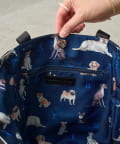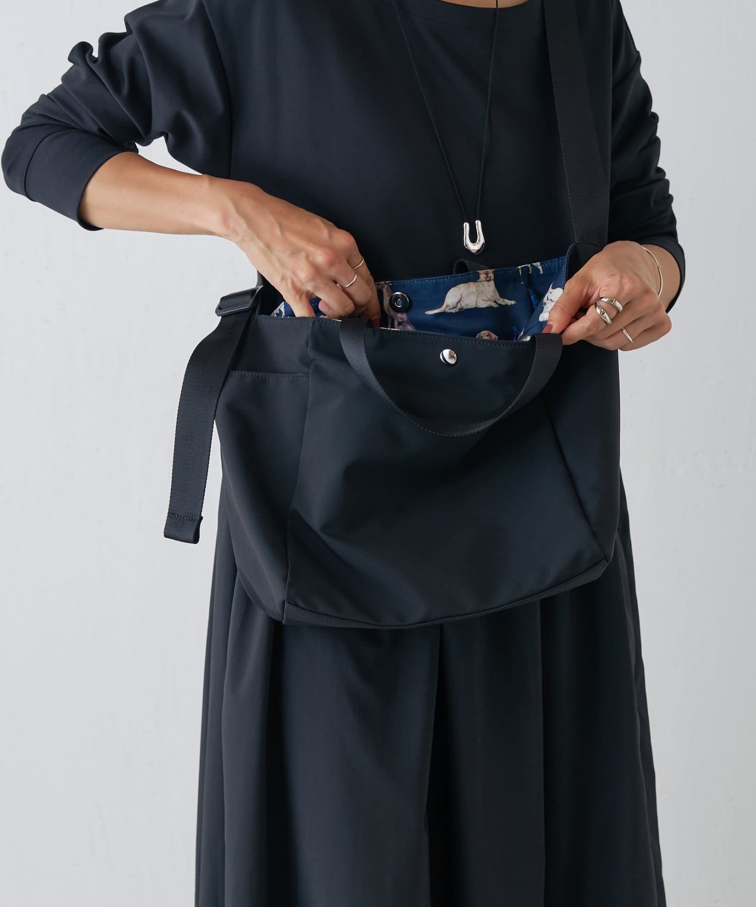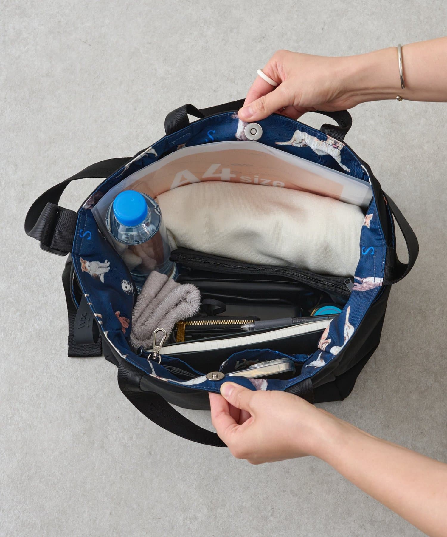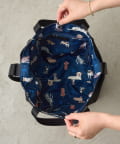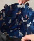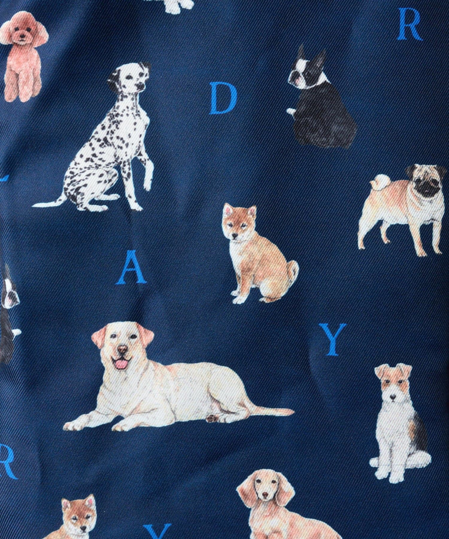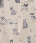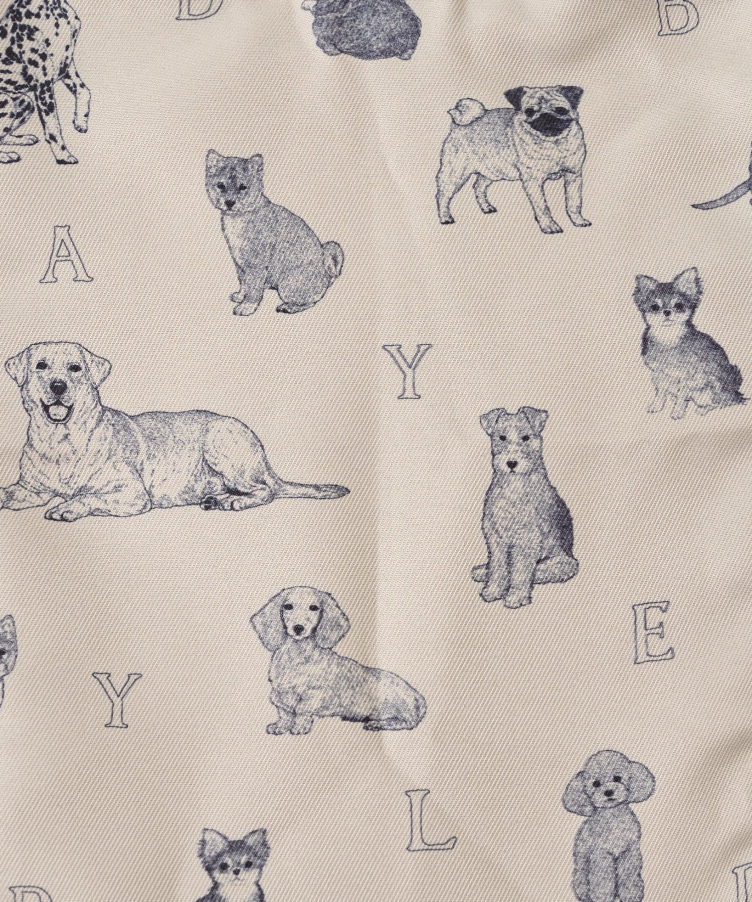 表地はシンプルな無地で、毎日のコーディネートに取り入れやすく、内側にはチワワやダックスフント、パグや柴犬と、たくさんの愛犬のイラストとビアズリーのアルファベットをあしらったテキスタイルを使用し、ふと目に入るたび気分が上がります。