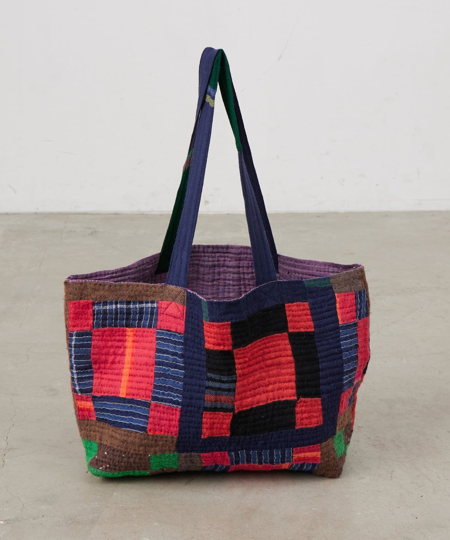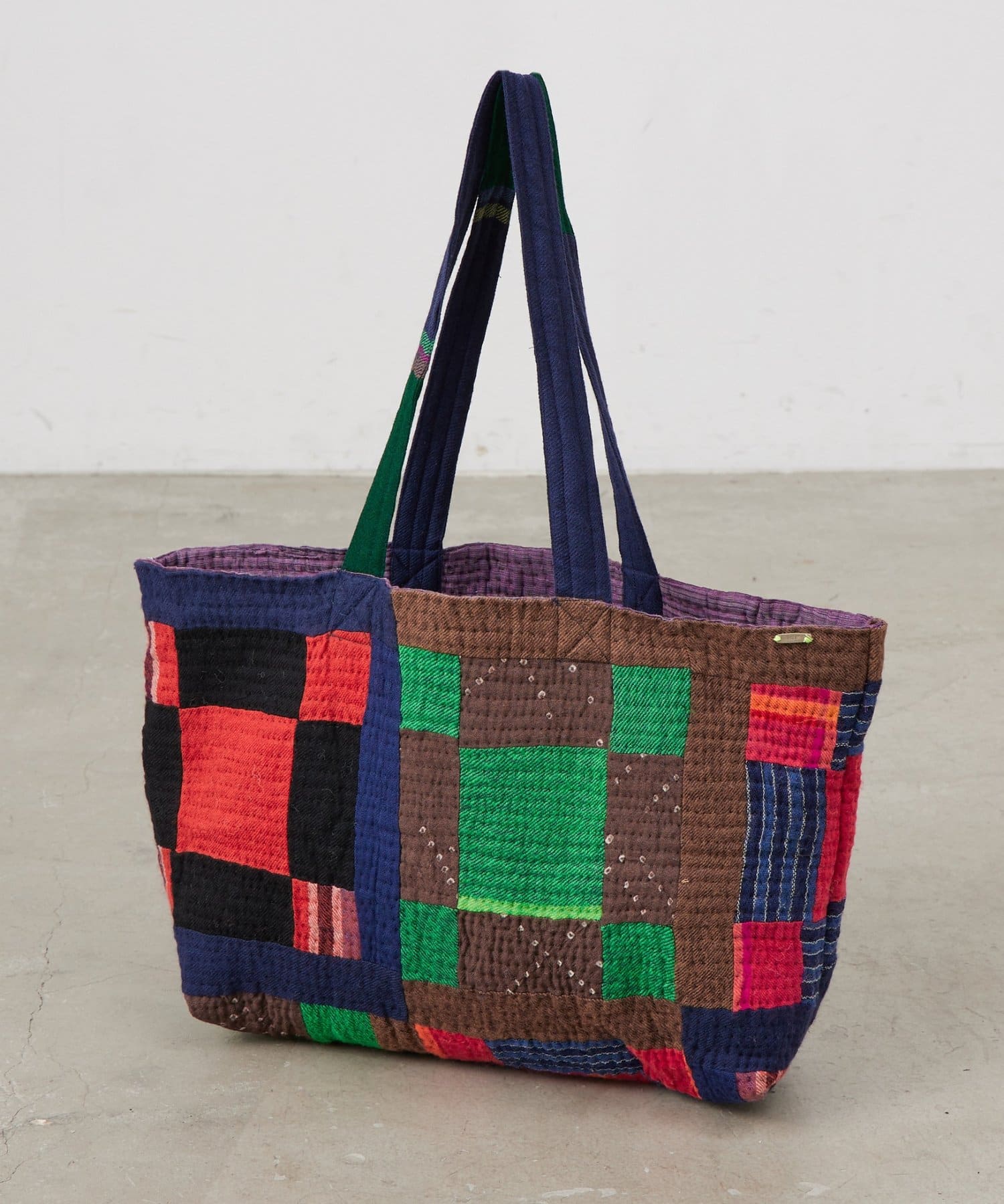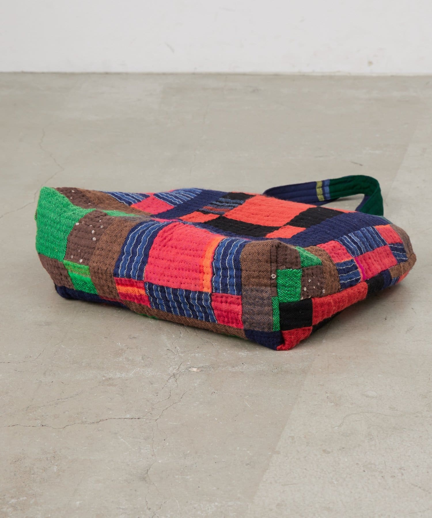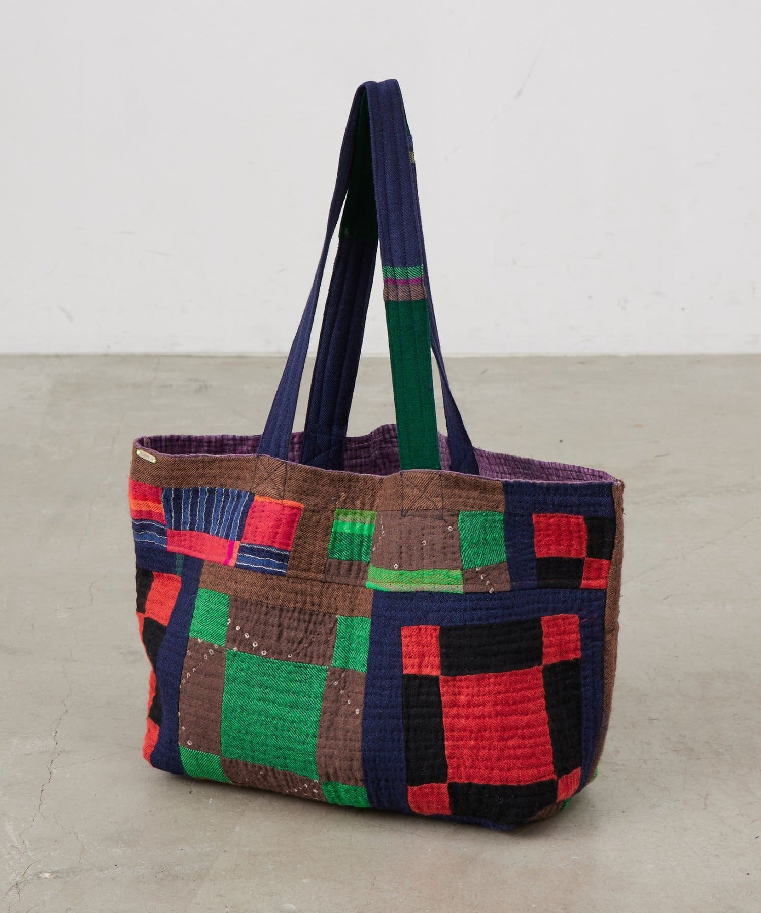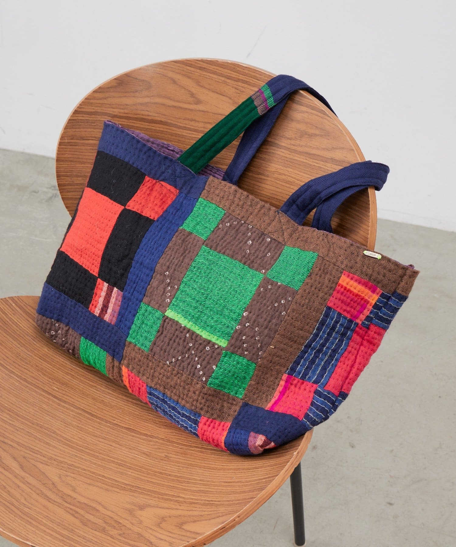 カラフルなウールやコットン生地をパッチワークにしたキルトトートバッグ。