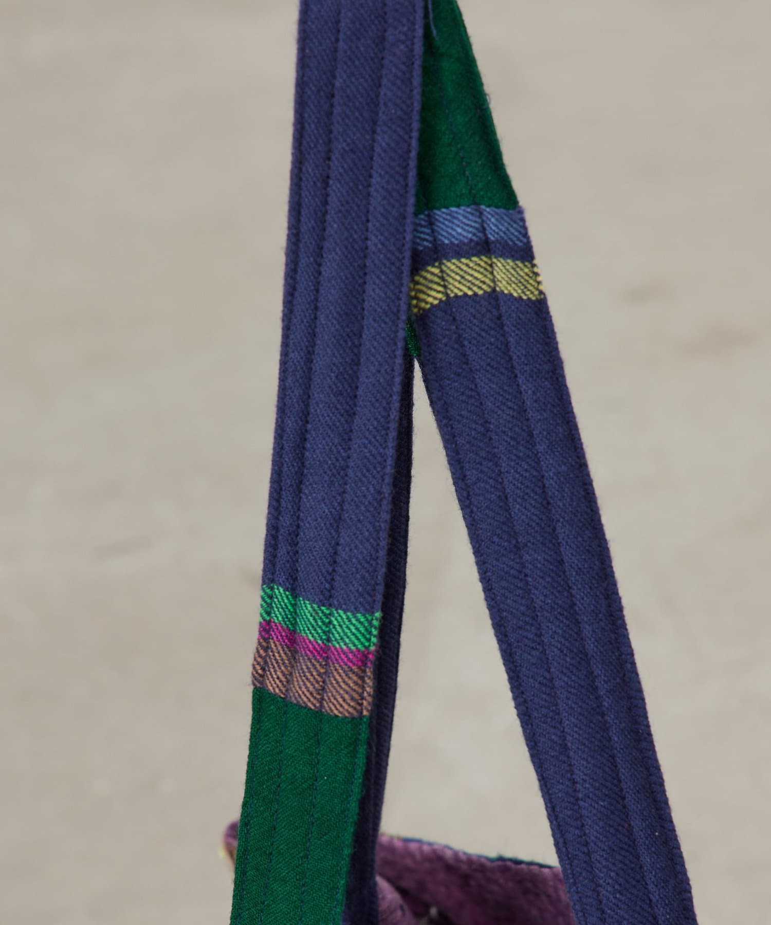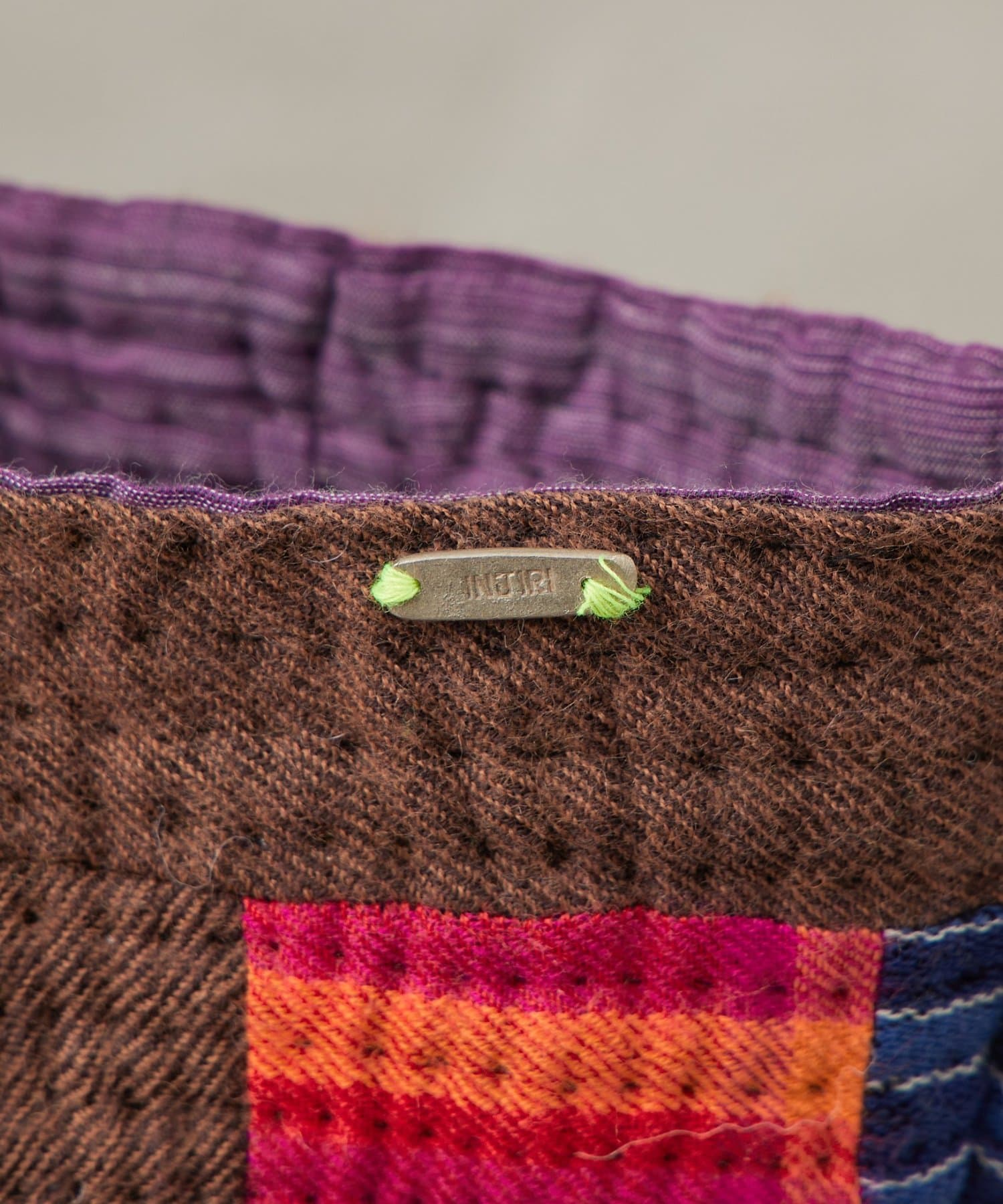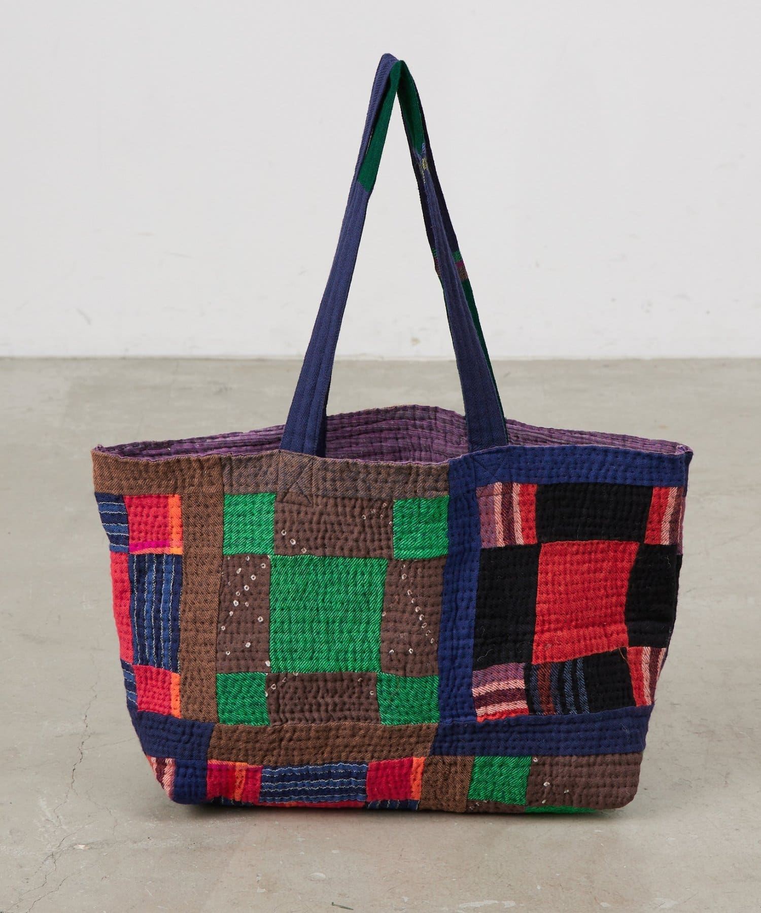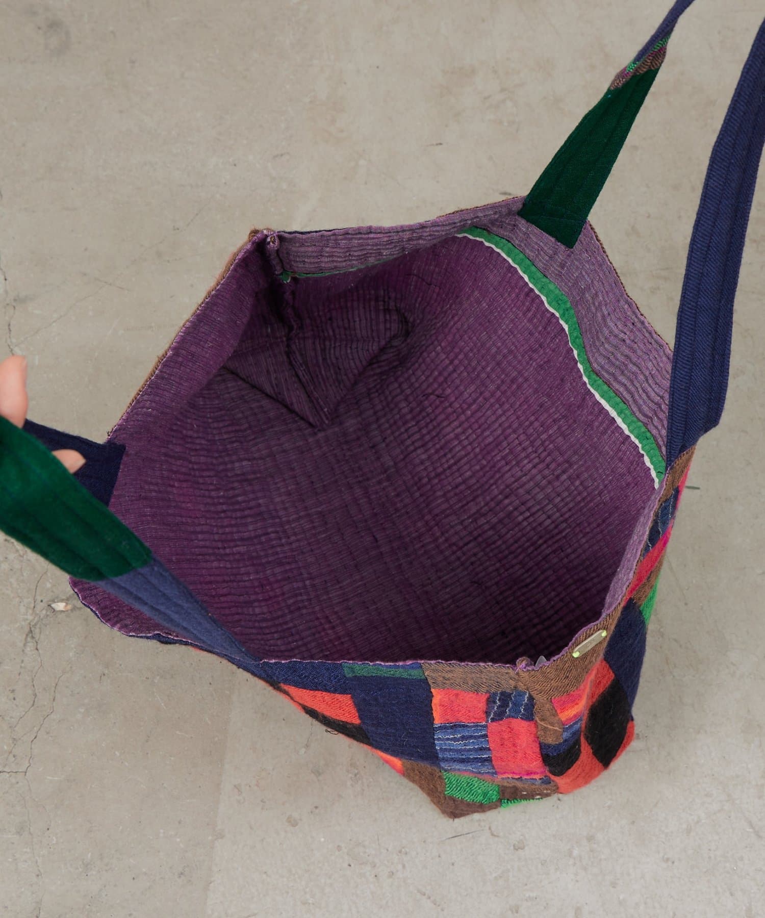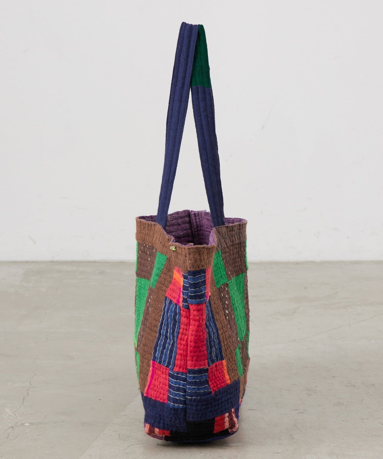 カラフルなウールやコットン生地をパッチワークにしたキルトトートバッグ。