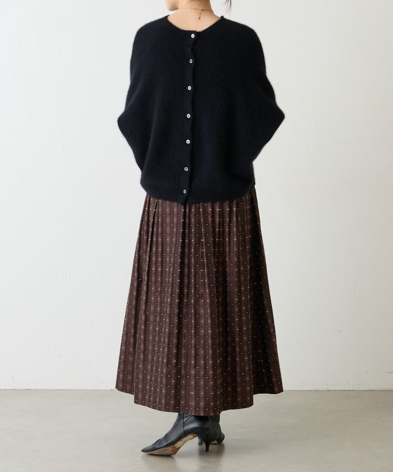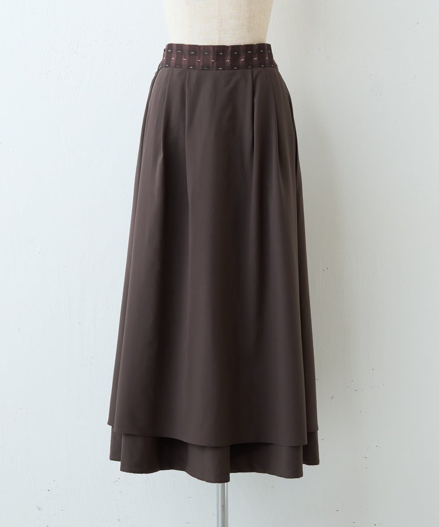 複数のタックが腰まわりをすっきり見せ、広がりすぎない落ち着いたラインに仕上げています。