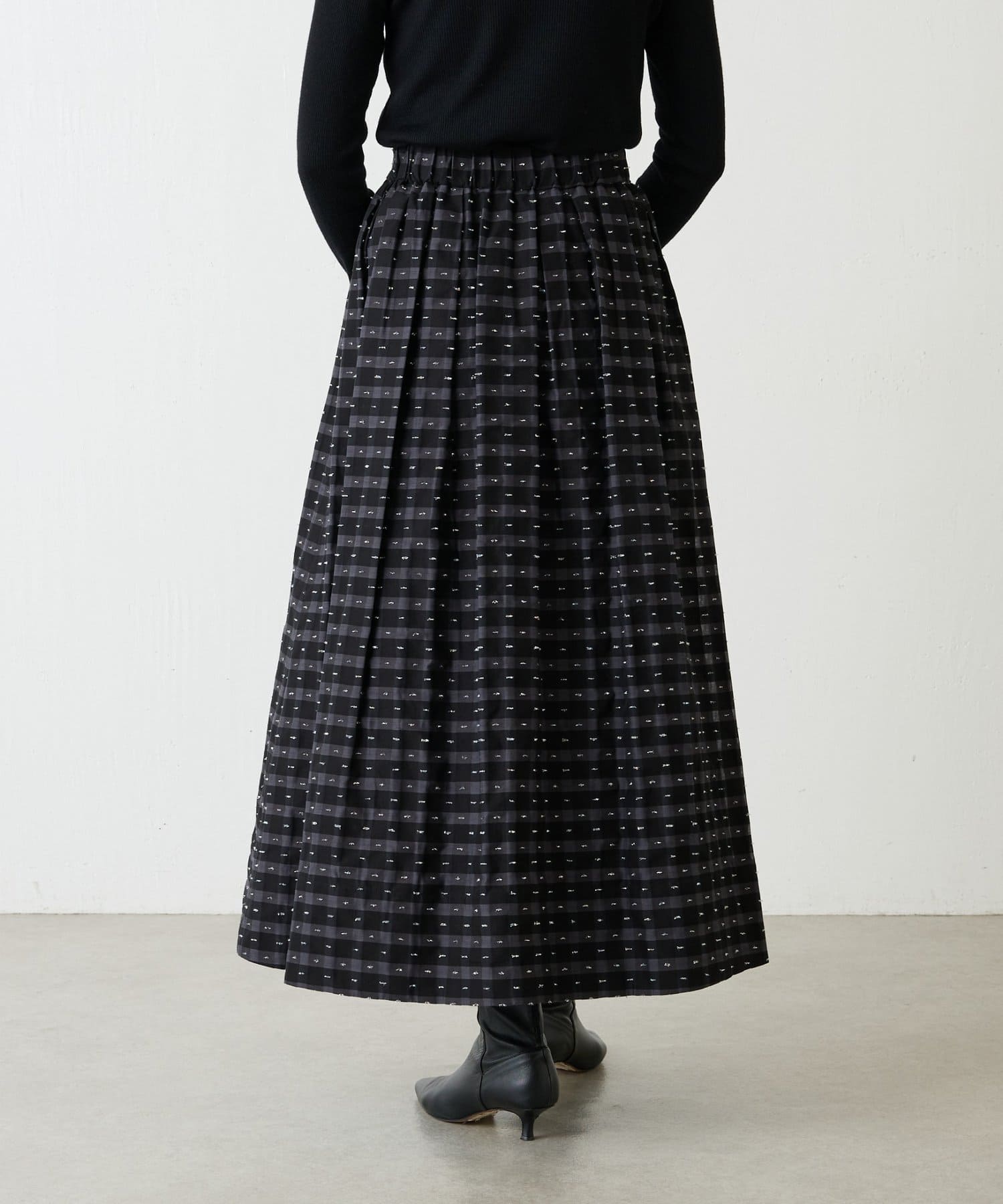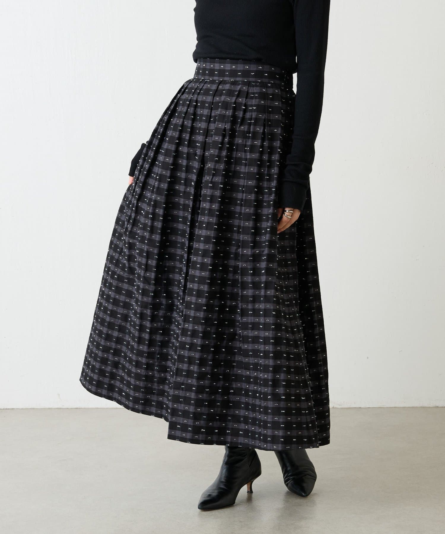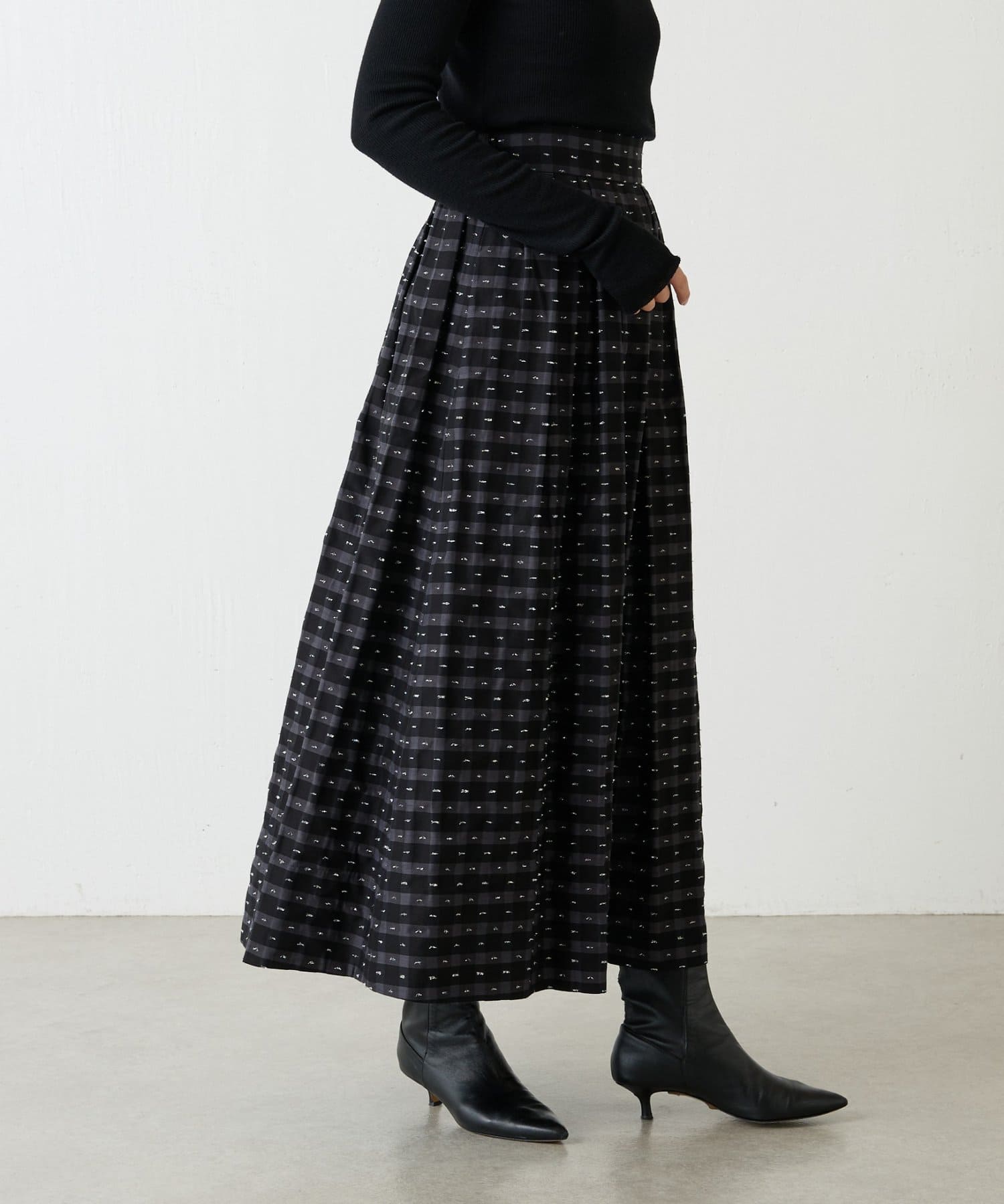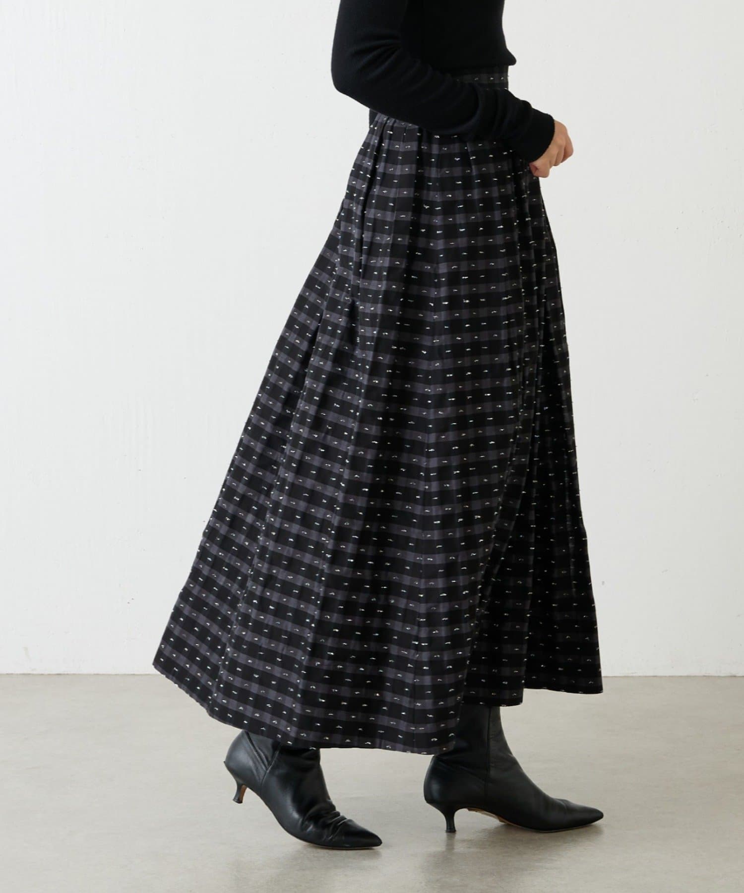 繊細な先染めチェックに、さりげないラメ糸が上品なタックスカート。