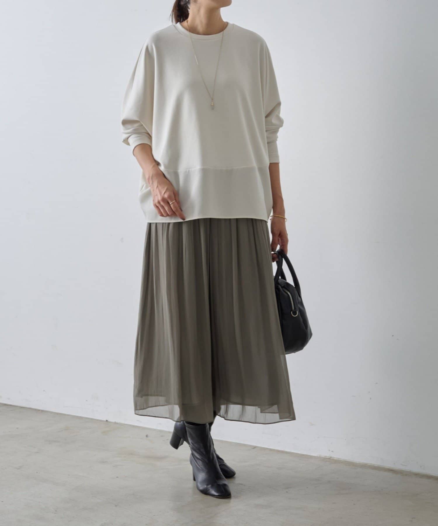 たっぷりと寄せたギャザーが生み出す柔らかなドレープは、まるでスカートのようなフェミニンな表情。