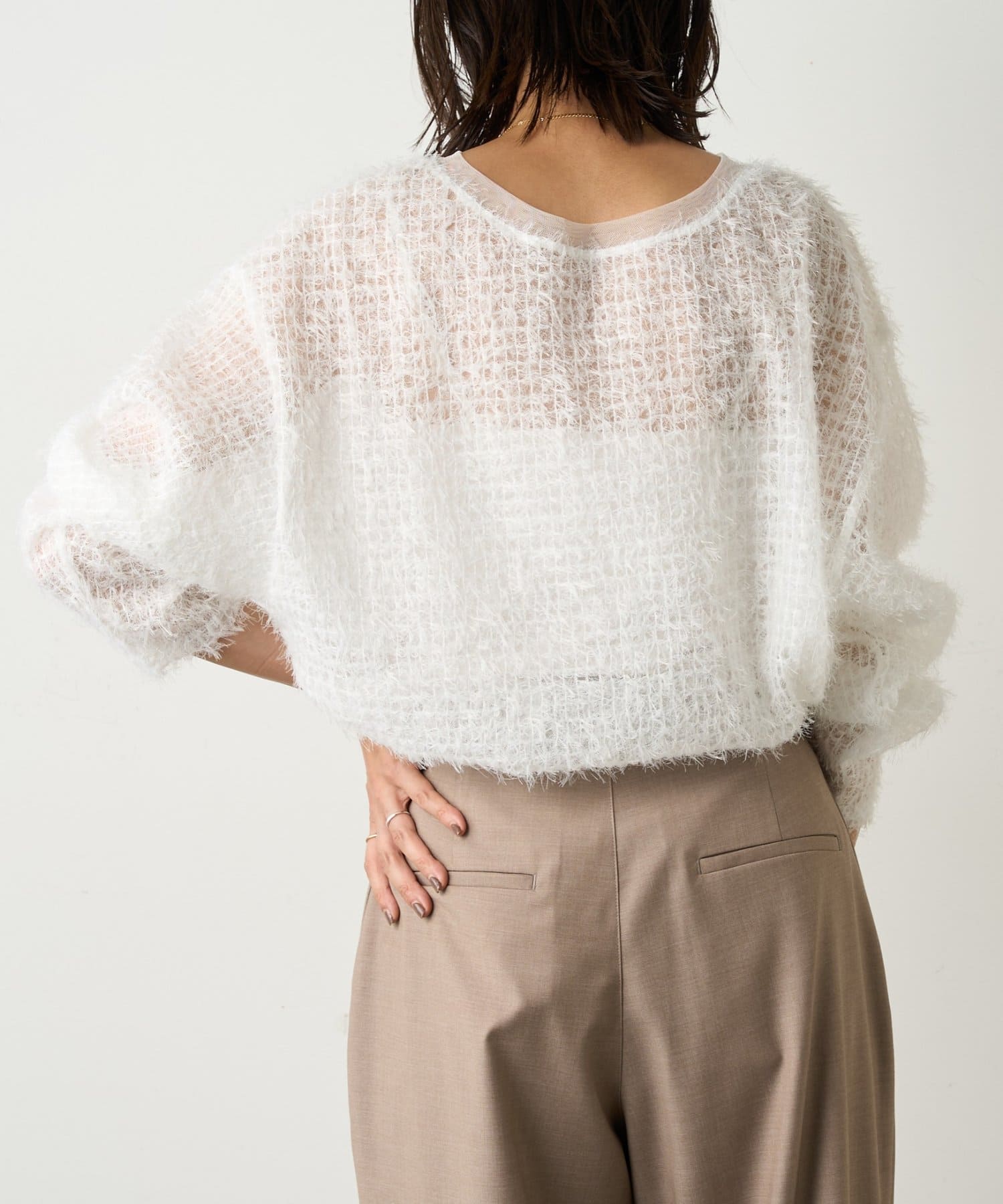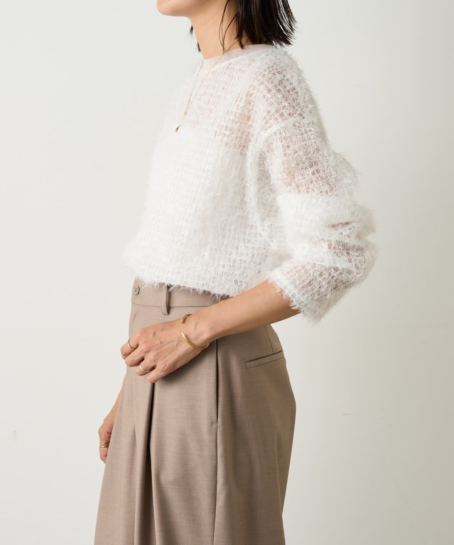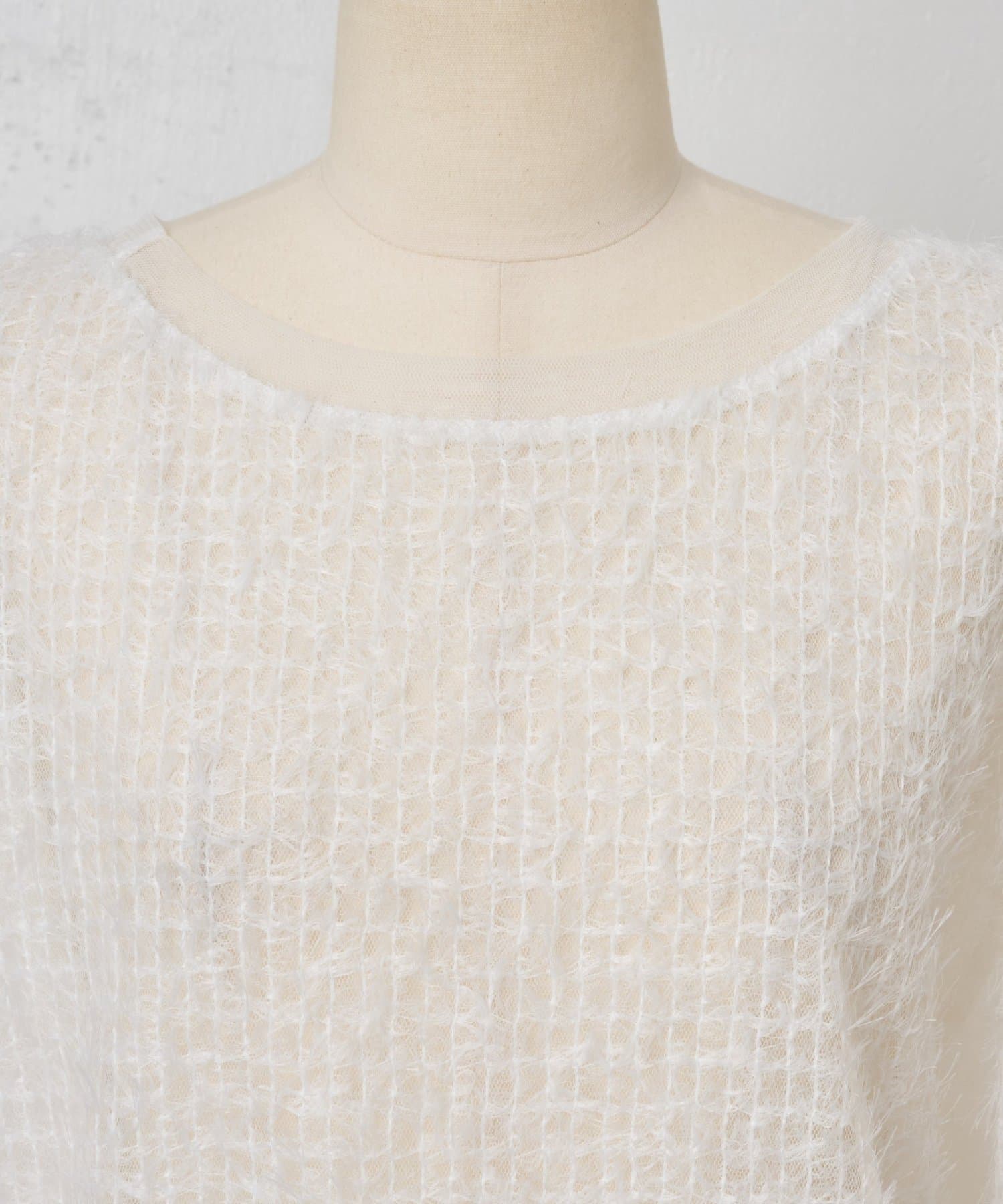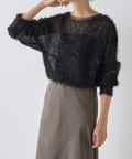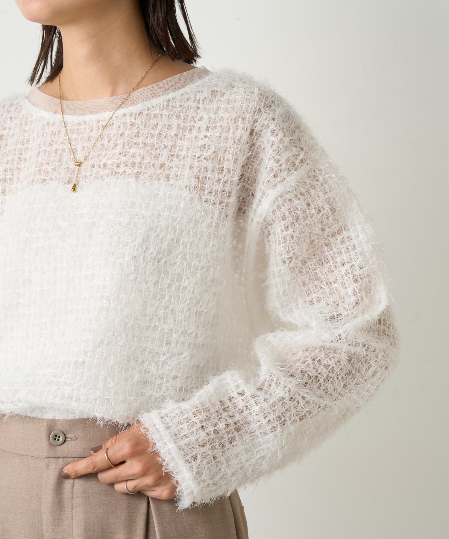 チュールにフェザーヤーンを縫い付けた、ふわっとした立体感と繊細な表情が魅力のトップス。