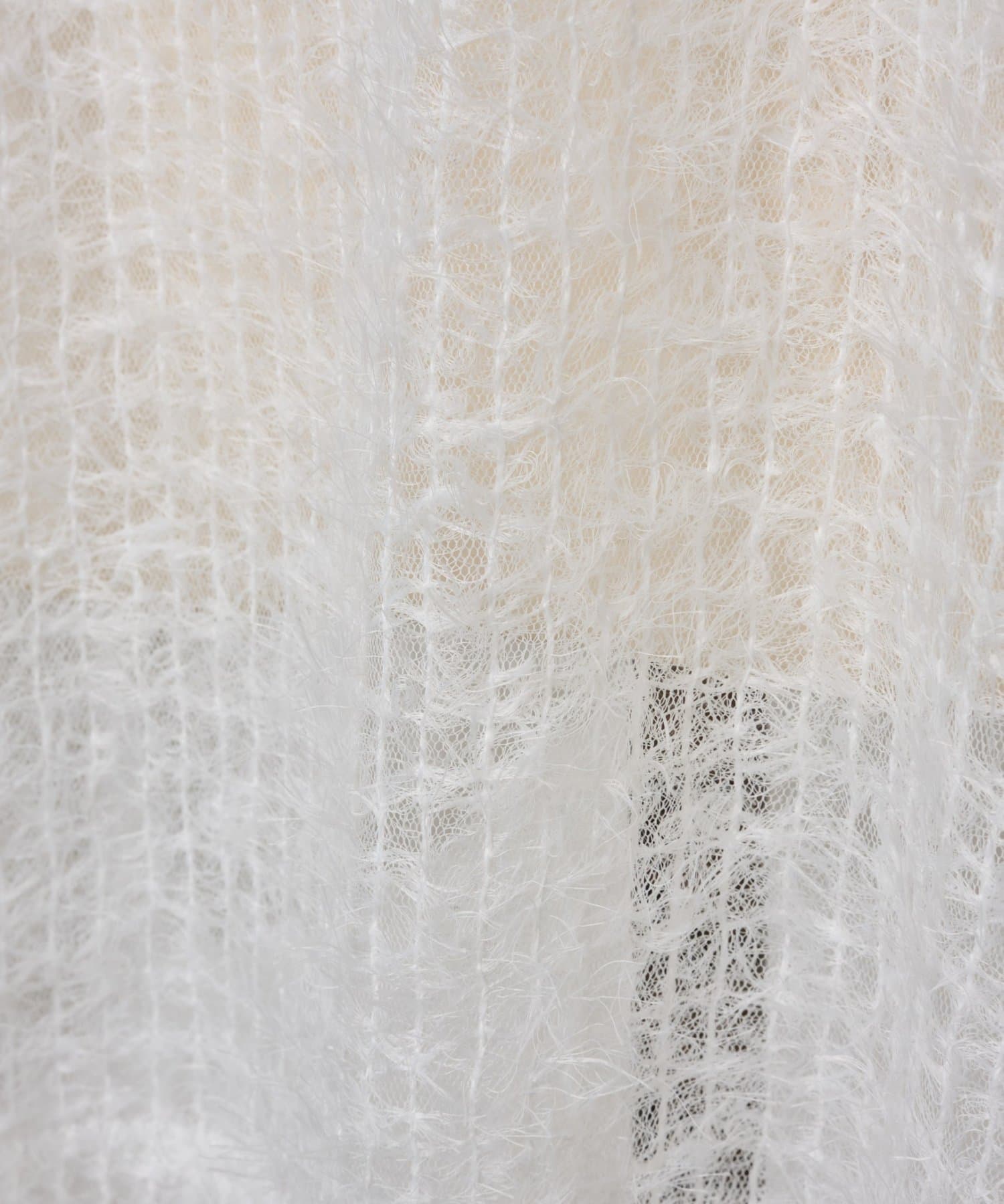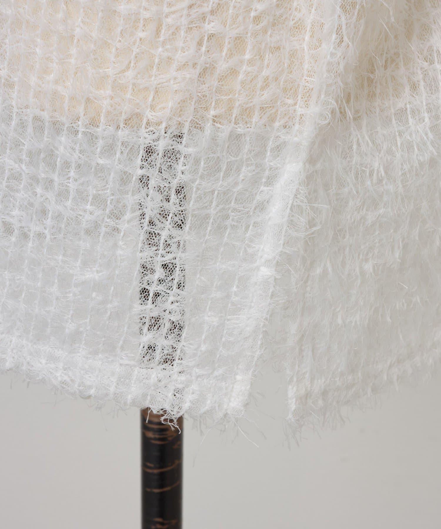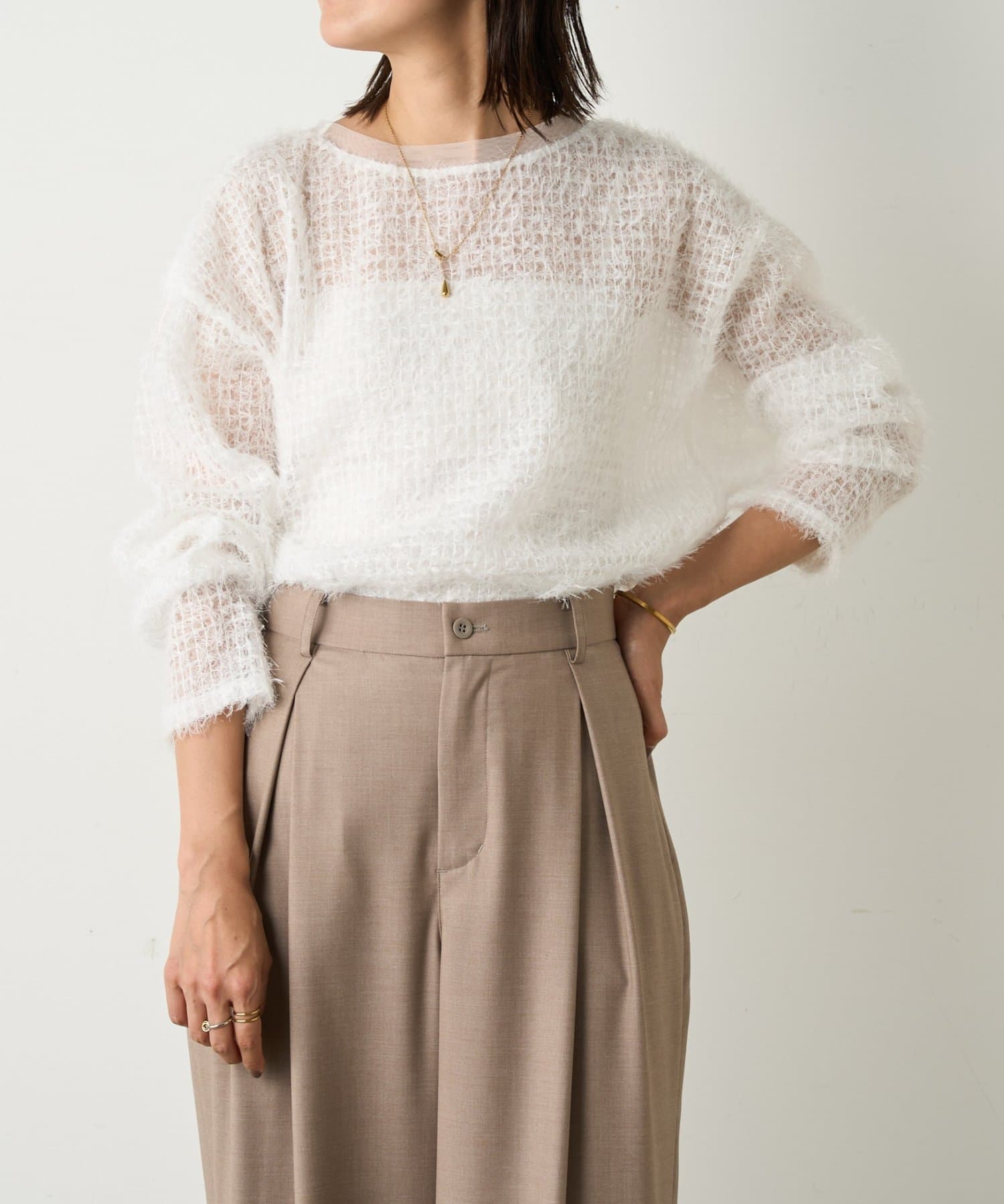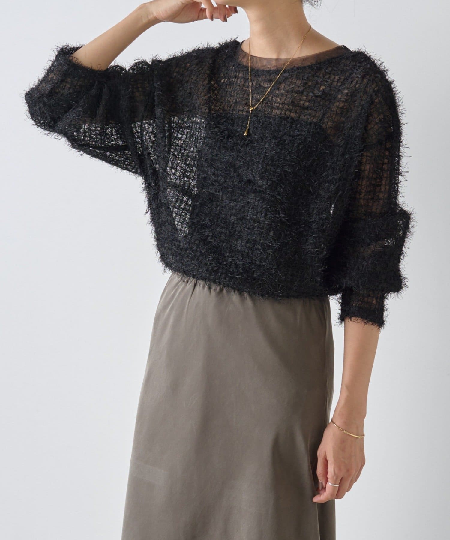 チュールにフェザーヤーンを縫い付けた、ふわっとした立体感と繊細な表情が魅力のトップス。