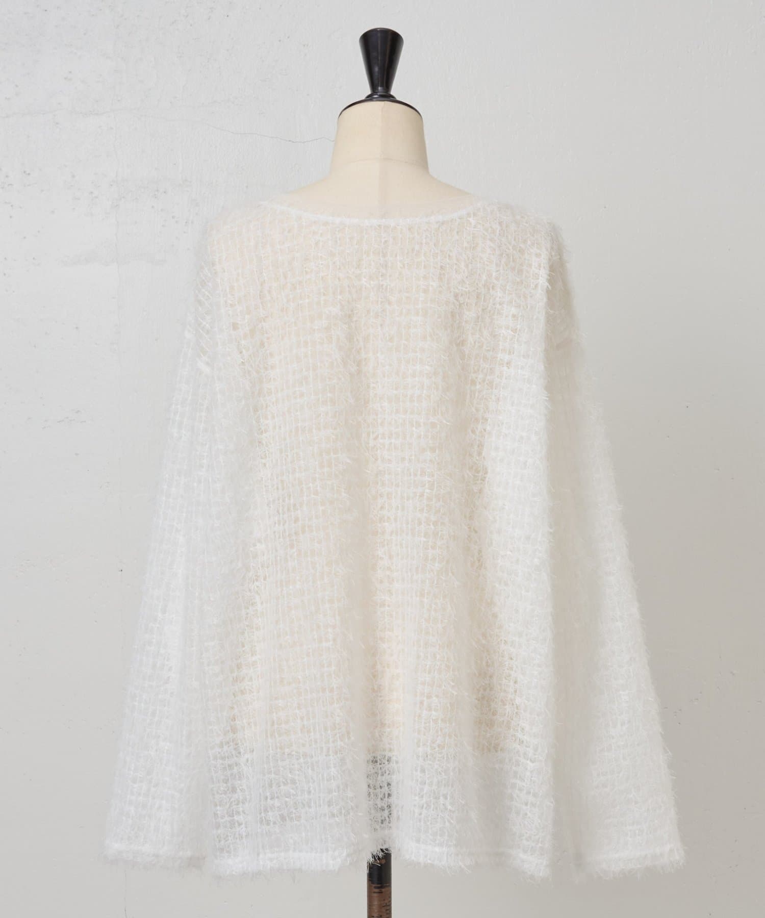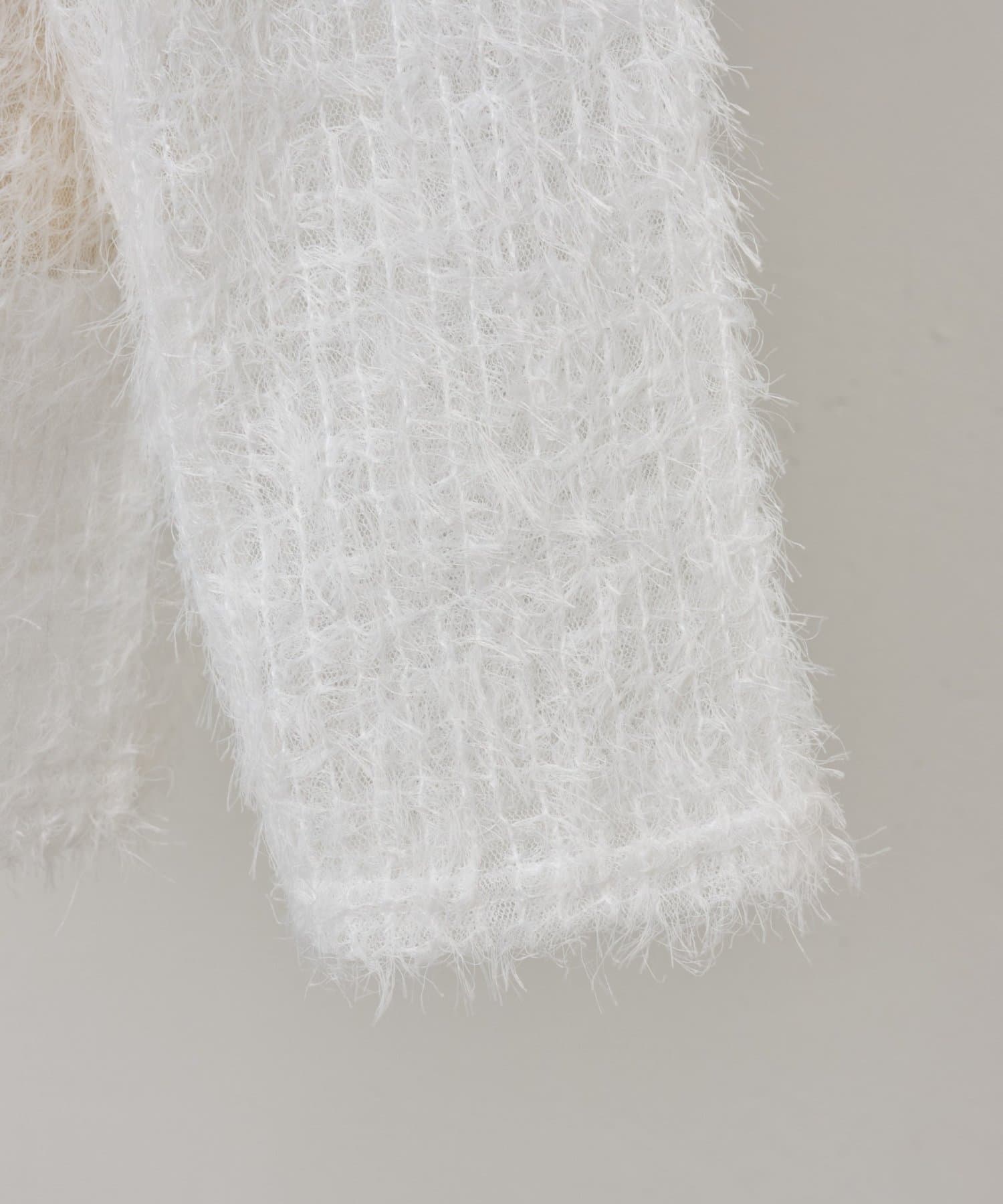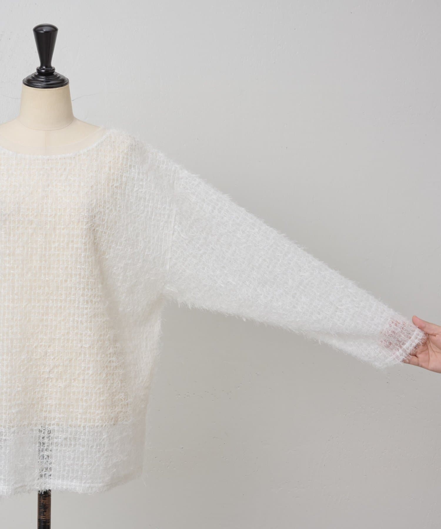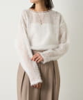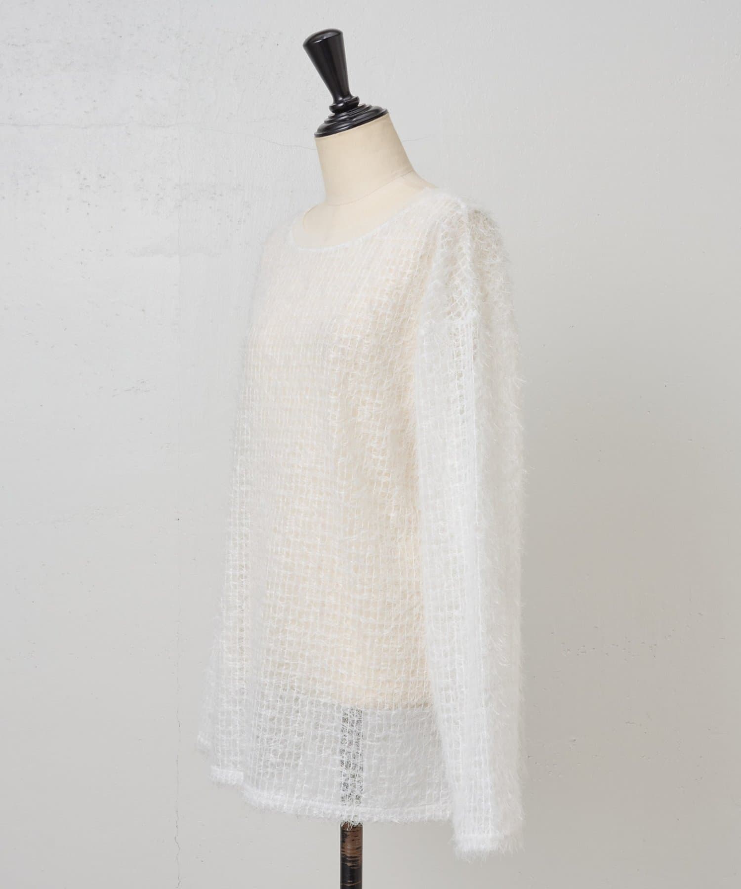チュールにフェザーヤーンを縫い付けた、ふわっとした立体感と繊細な表情が魅力のトップス。