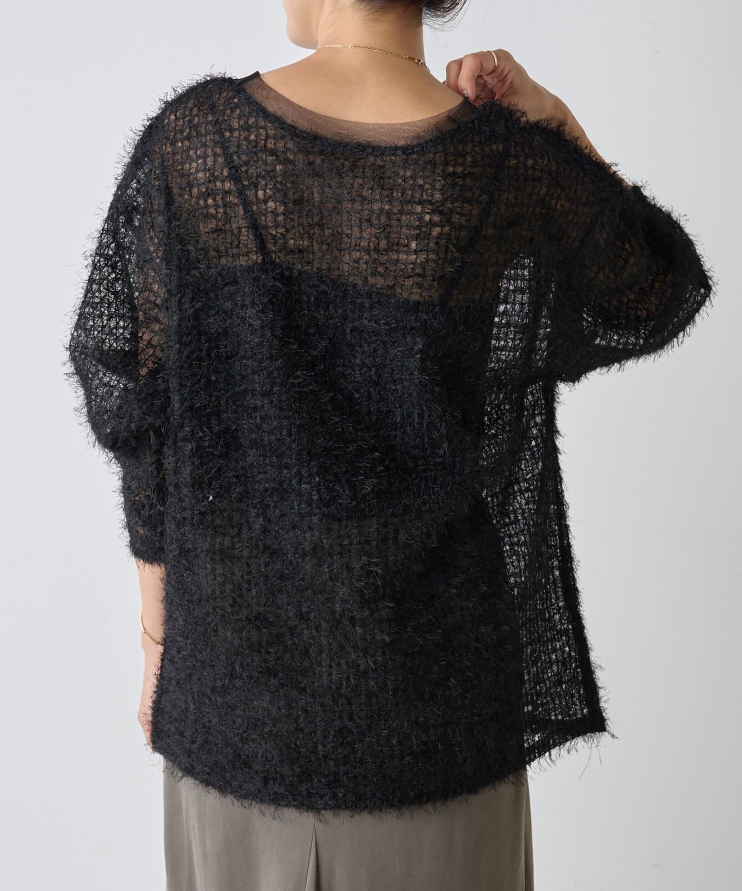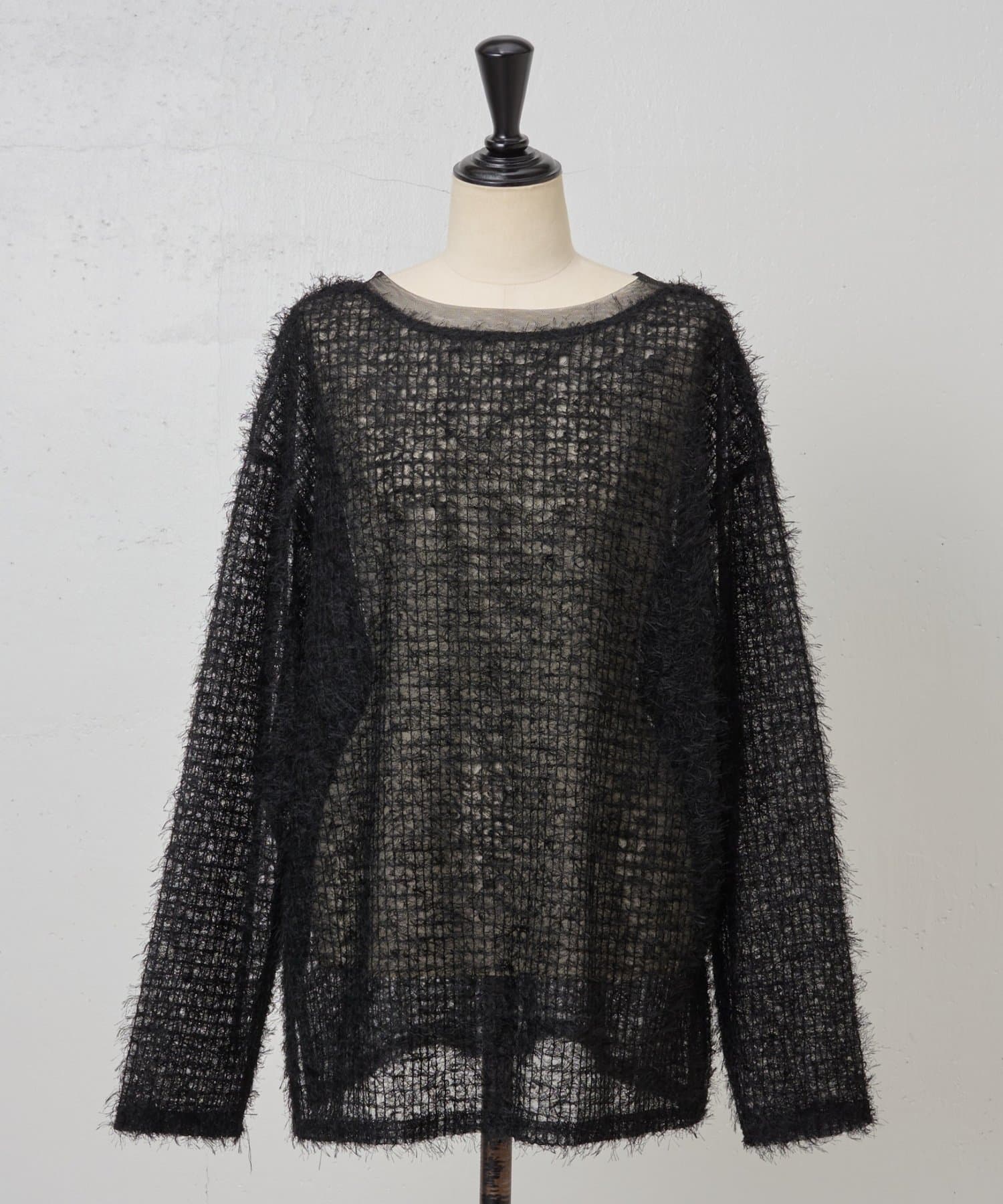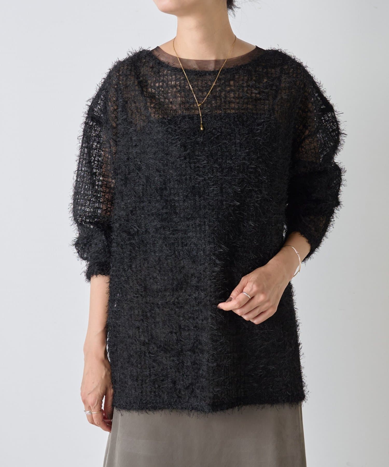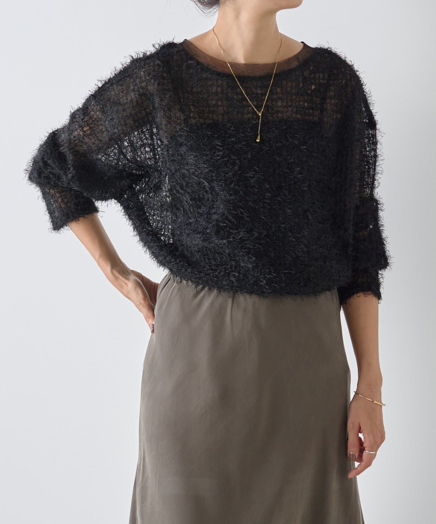 チュールにフェザーヤーンを縫い付けた、ふわっとした立体感と繊細な表情が魅力のトップス。