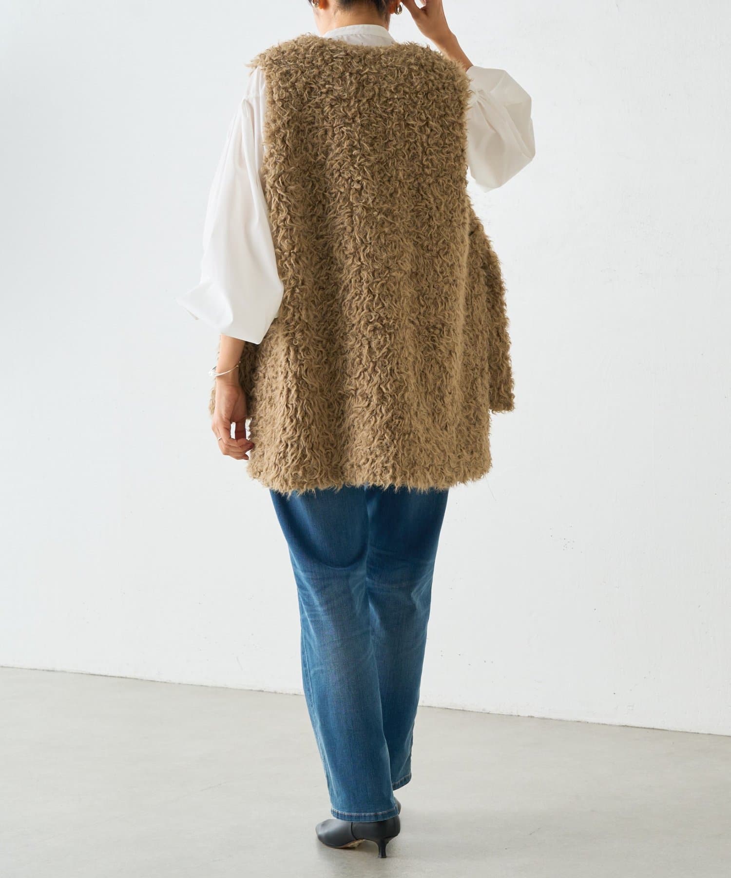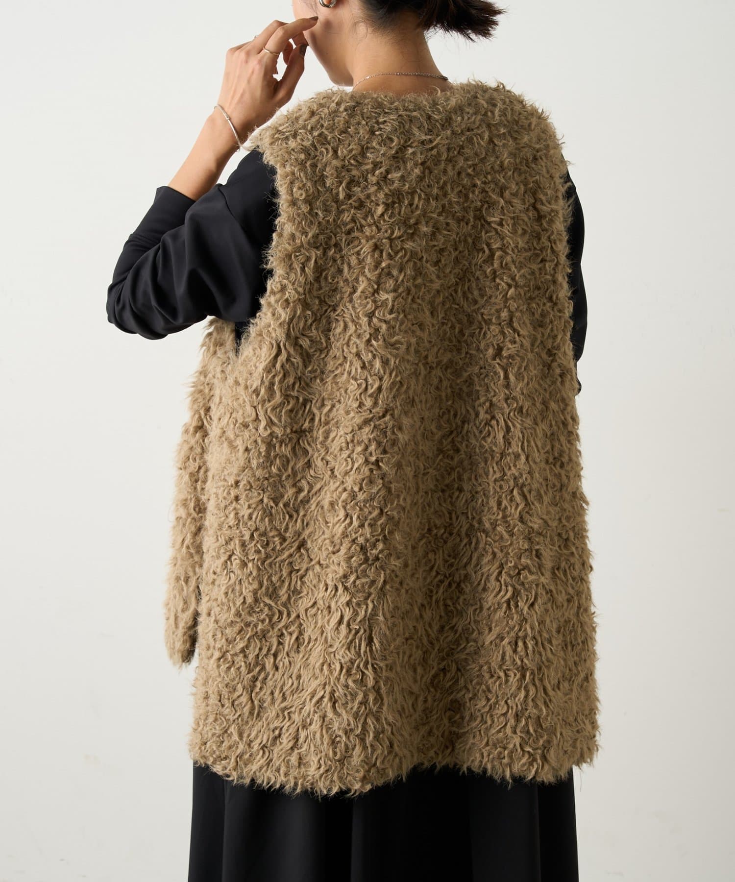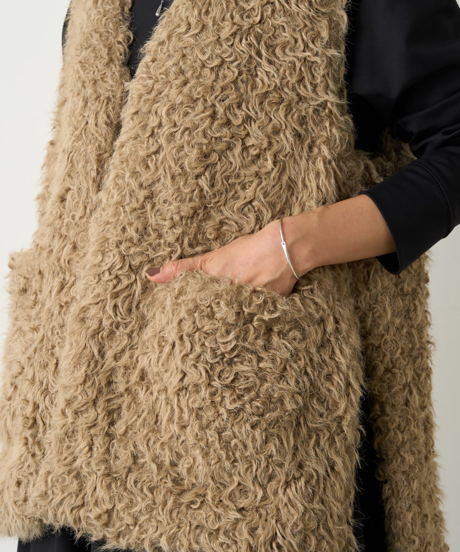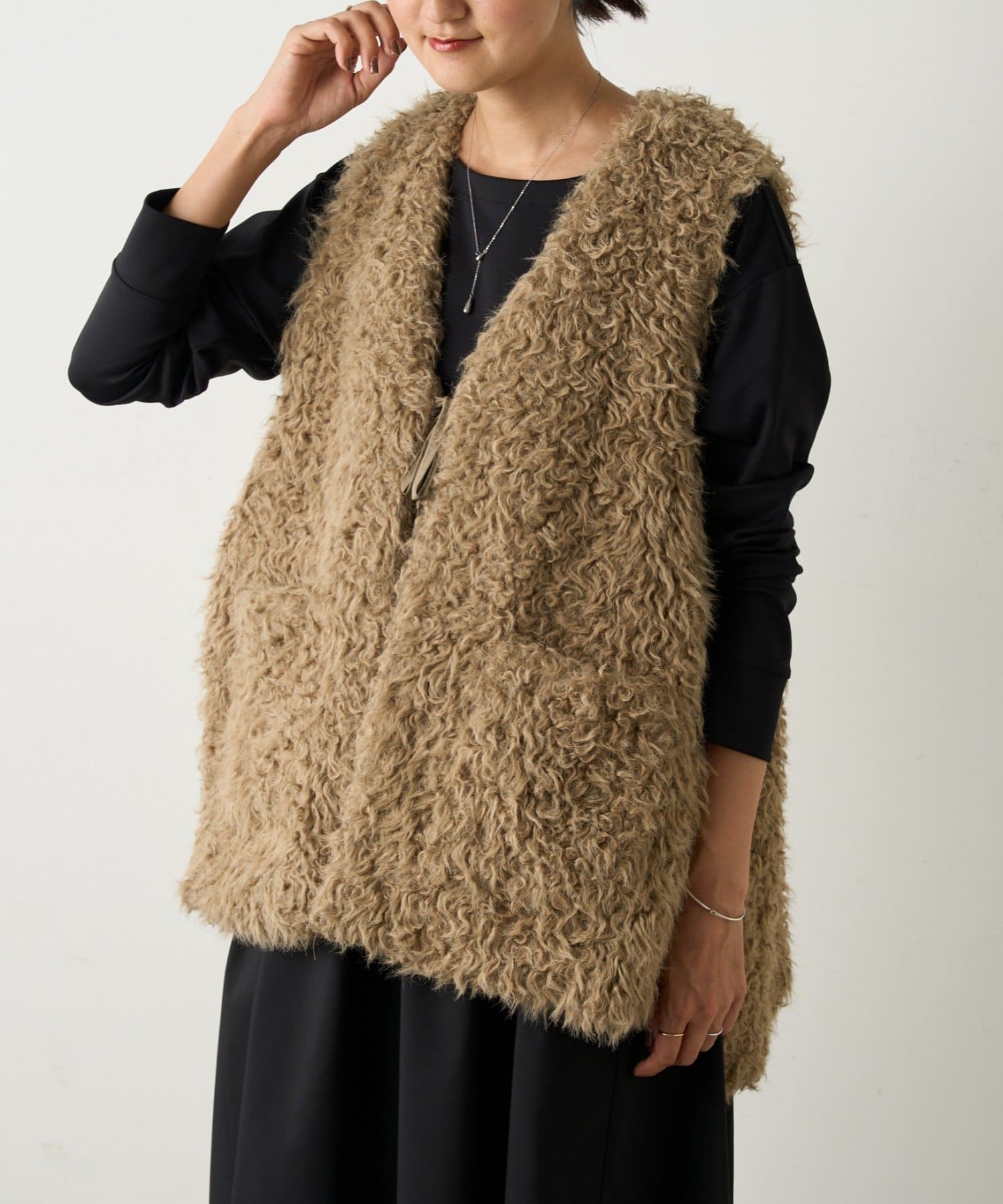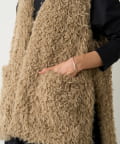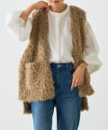 ふんわりとカールしたフェイクファー素材で、季節感と程よい存在感を演出する大人カジュアルなベスト。